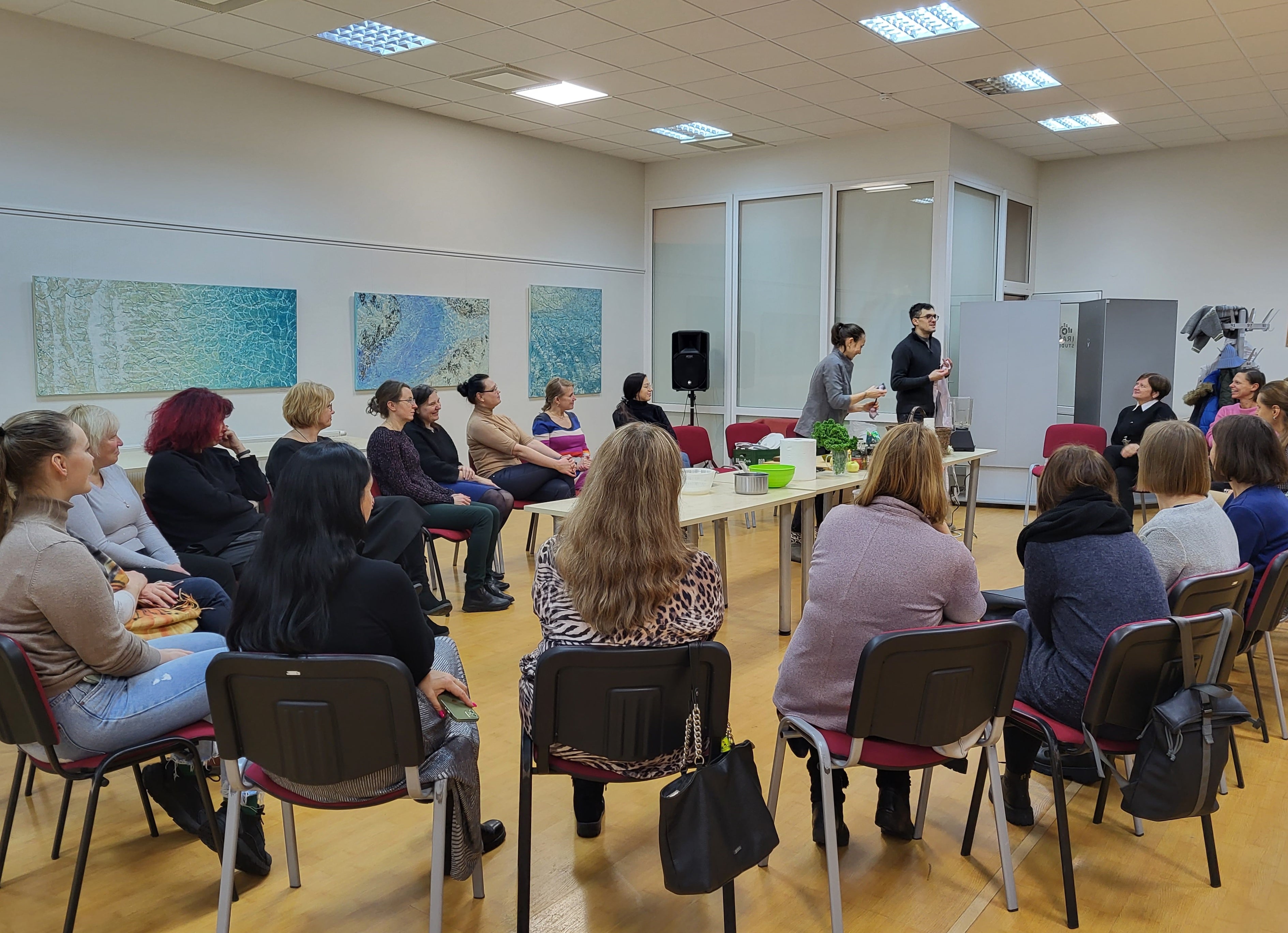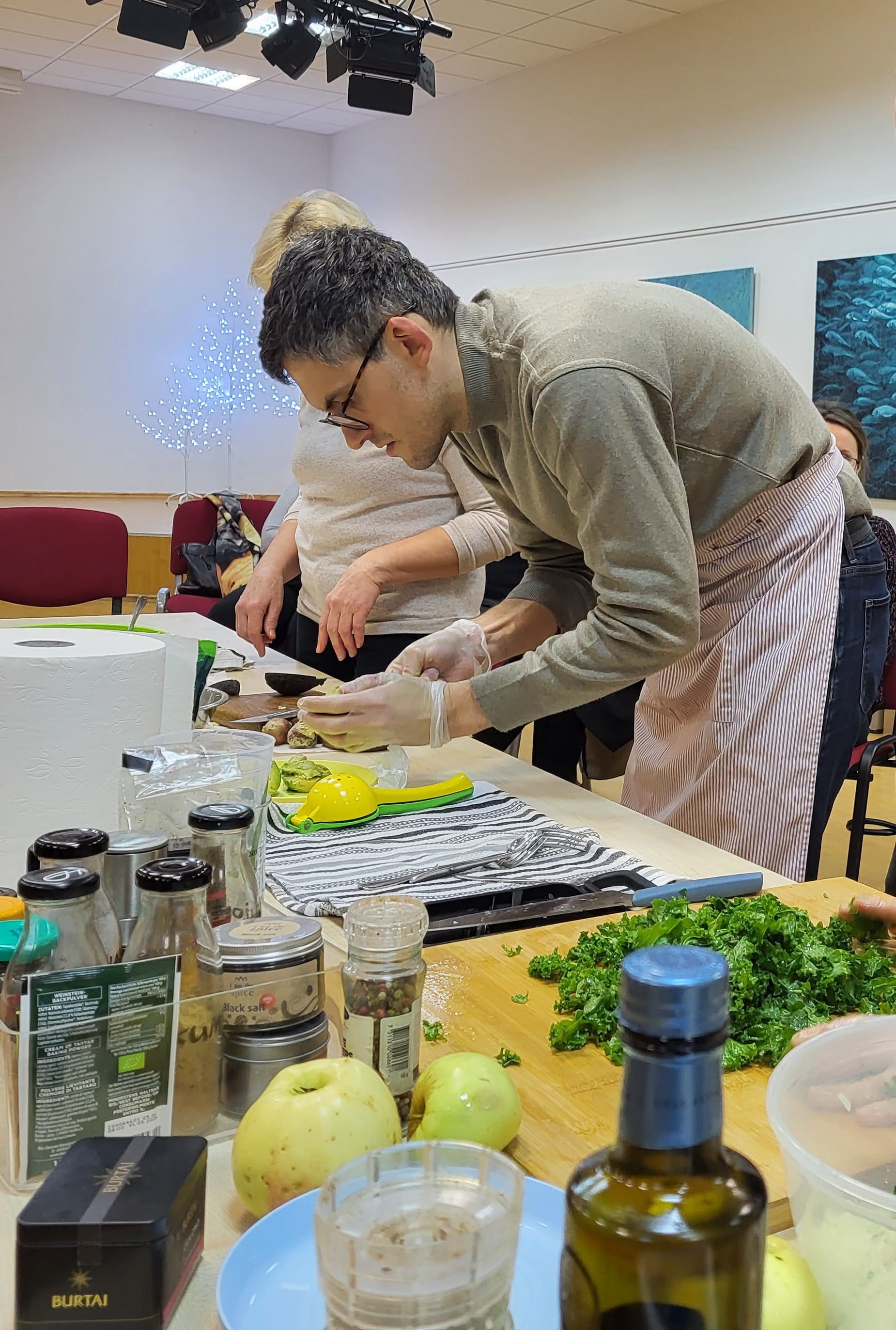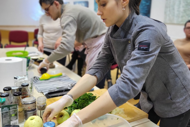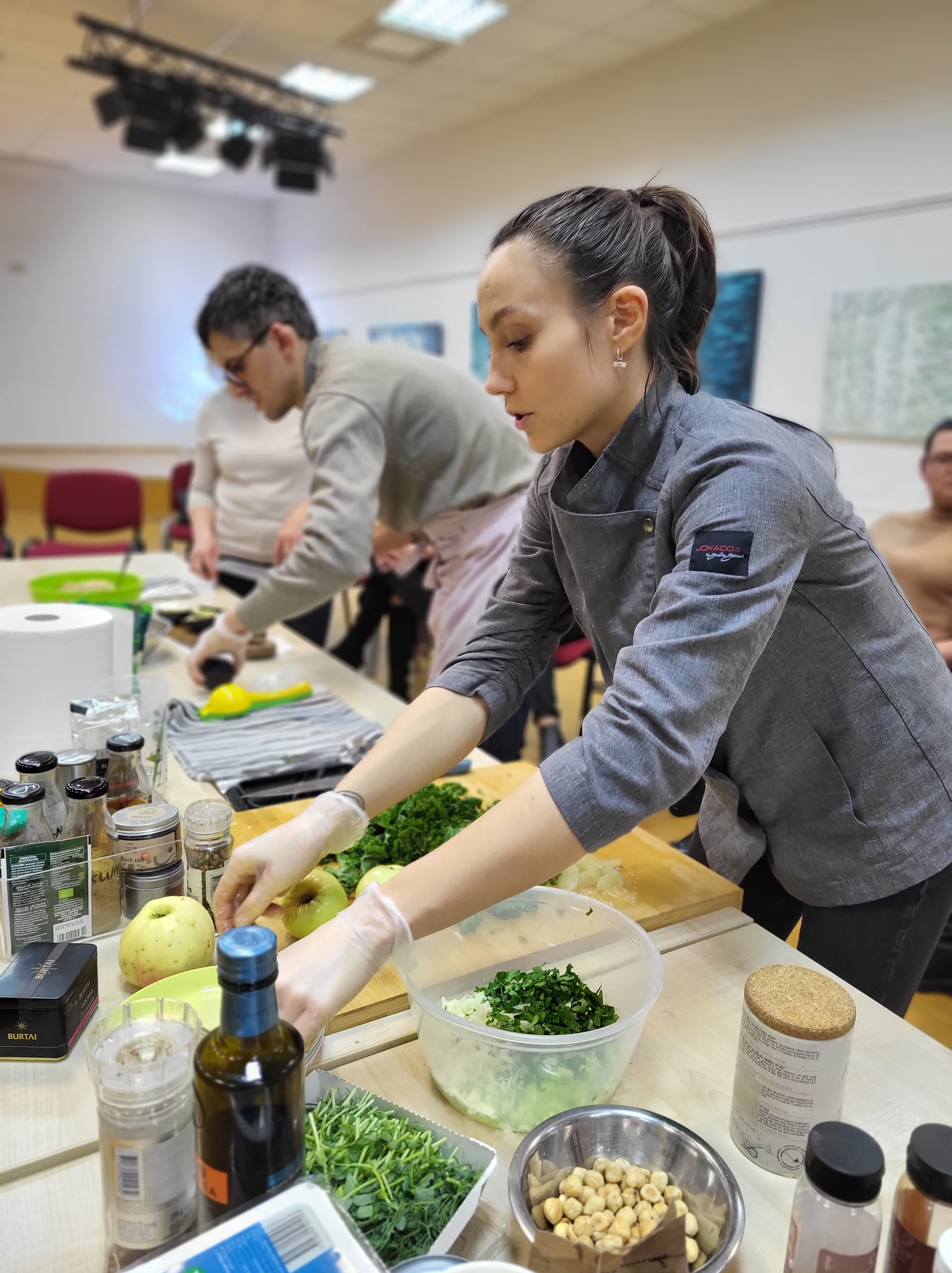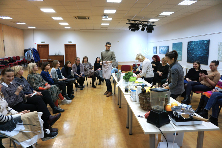 Jam antrino sveikos mitybos mentorė, profesionali pilnos struktūros augalinio pagrindo virtuvės šefė Julija Maksimova, mokydama gaminti augalinės kilmės maistą sveikai, skaniai ir gražiai. Bibliotekoje vykusių dirbtuvių dalyviai stebėjo net trijų nesudėtingų, bet labai maistingų patiekalų gamybą ir noriai ragavo bei gyrė.