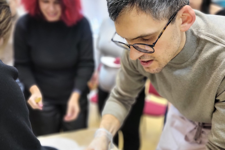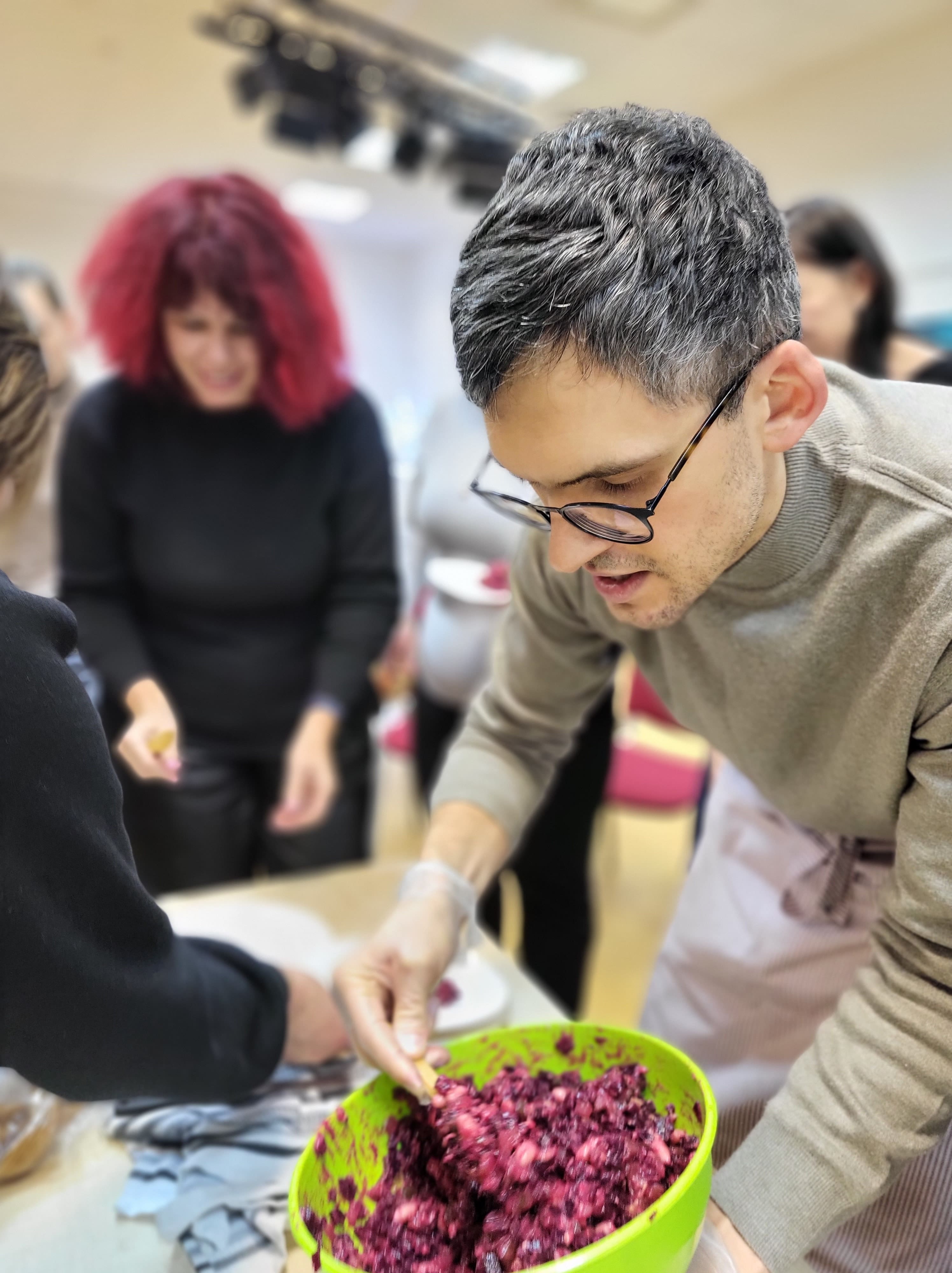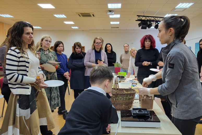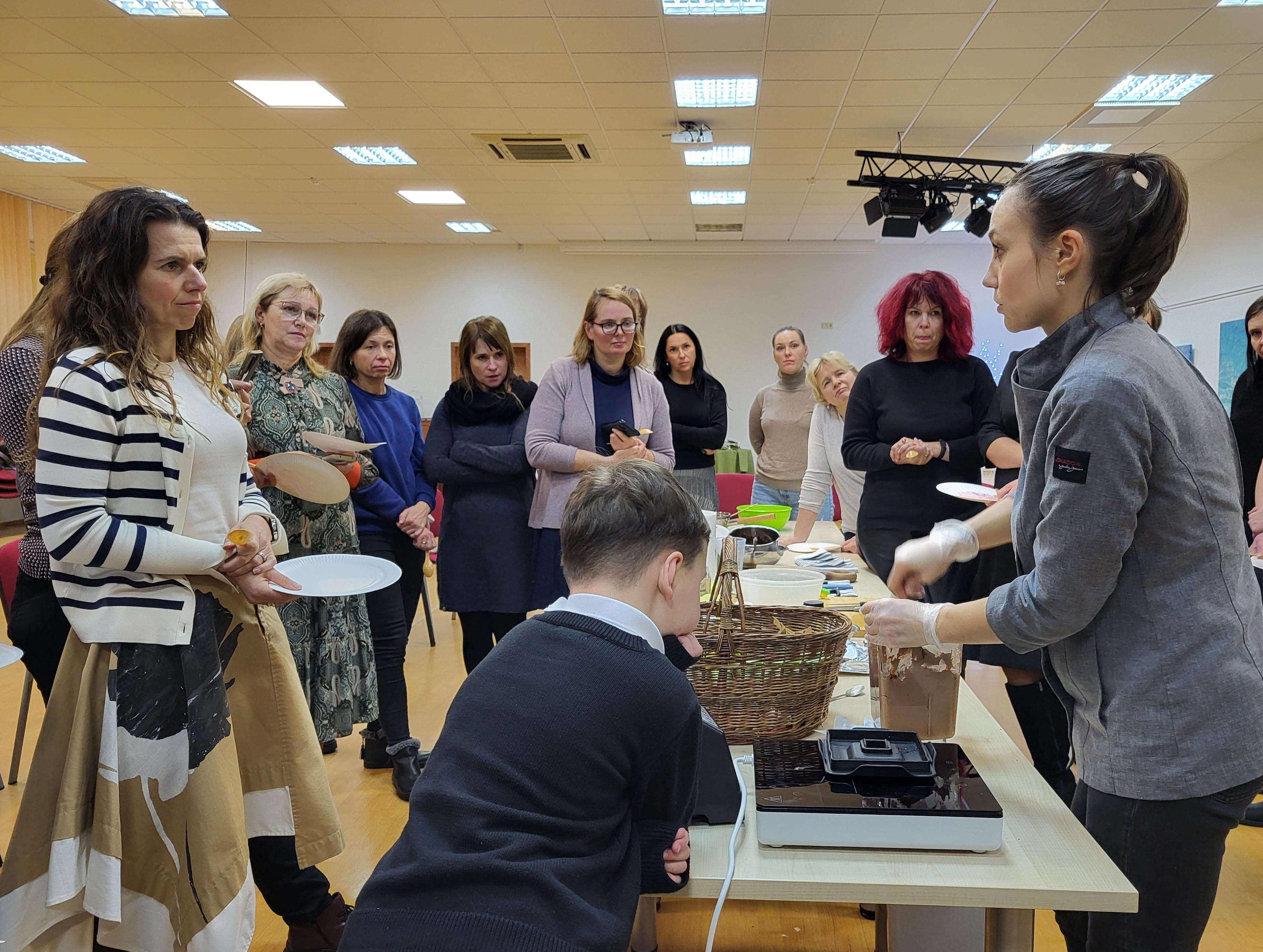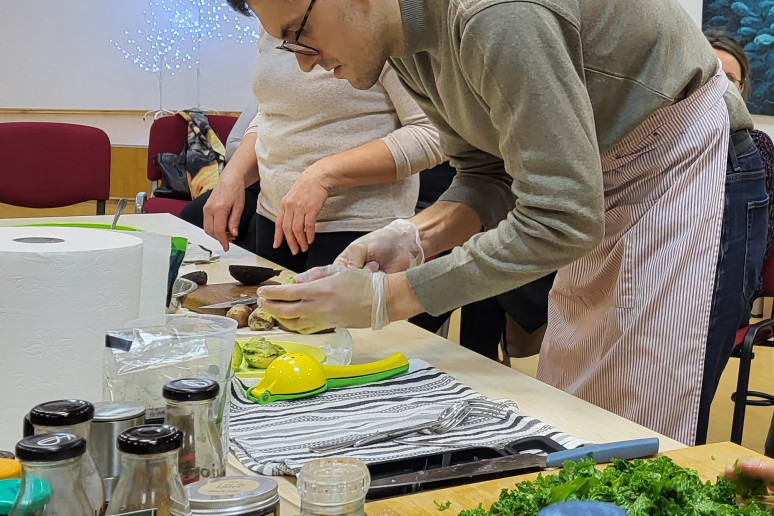 Jam antrino sveikos mitybos mentorė, profesionali pilnos struktūros augalinio pagrindo virtuvės šefė Julija Maksimova, mokydama gaminti augalinės kilmės maistą sveikai, skaniai ir gražiai. Bibliotekoje vykusių dirbtuvių dalyviai stebėjo net trijų nesudėtingų, bet labai maistingų patiekalų gamybą ir noriai ragavo bei gyrė.
