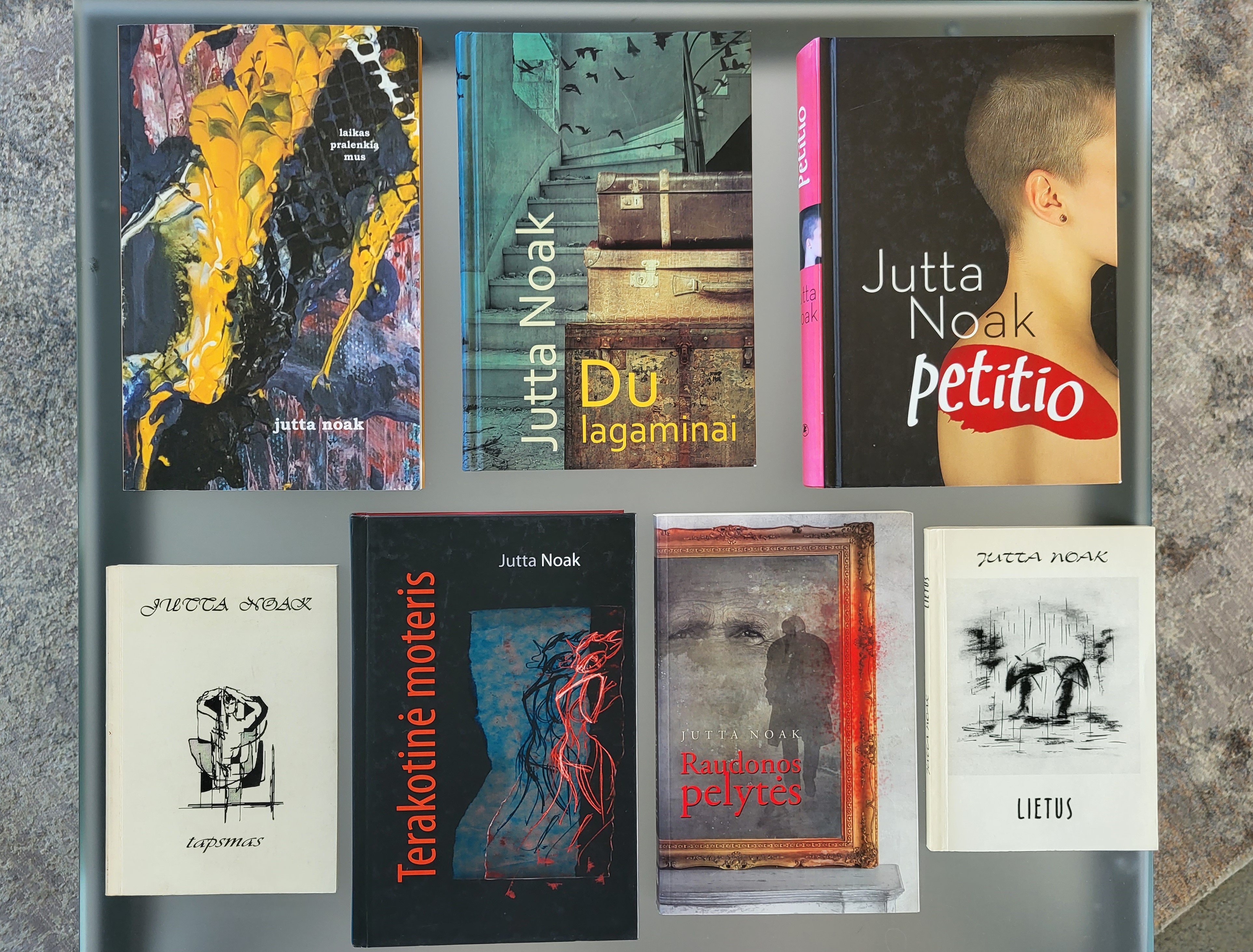 RAŠYTOJA JUTTA NOAK debiutavo novelių knyga „Uždaras ratas“ (1993), vėliau išleido novelių rinkinius „Lietus“ (1998), „Du lagaminai“ (2014). Psichologinėse novelėse vaizduojami veikėjai – keistuoliai, susiduriantys su brutalia tikrove. Nuo pirmojo romano „Pabudimas“ (2002) gilinasi į moters pasaulį, gyvenimo prasmės paieškas. Romane „Petitio“ (2012, vokiečių kalba 2017) perteikiama jaunos moters, vokietės ir ruso dukters, brendimas, sąmonėjimas sovietmečio Lietuvoje, vėliau – Vokietijoje; stiliui būdingas jausmų prieštaringumas. Romane „Raudonos pelytės“ (2017) vaizduojami Lietuvos vokiečių likimai, paliesti II pasaulinio karo traumų. Romane „Terakotinė moteris“ (2021) gilinamasi į keliaujančios po pasaulį herojės jausmus. Eilėraščių rinkiniai „Sraigtiniai laiptai“ (2001), „Laikas pralenkia mus“ (2022). Kūrybai būdinga subtilus psichologizmas, susidūrimas su baime, nepasitikėjimu, nusivylimu ir viltimi.