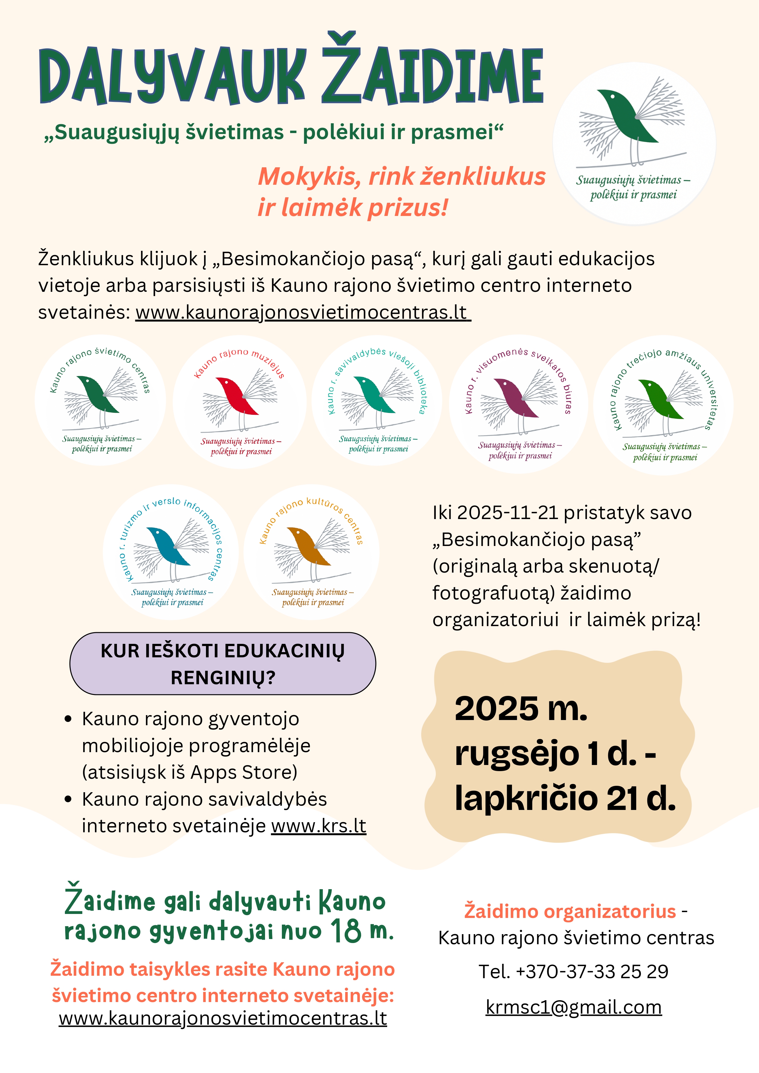 Kviečiame Kauno rajono gyventojus dalyvauti žaidime, skirtame Kauno rajono 70-mečiui ir Nacionalinei suaugusiųjų mokymosi savaitei paminėti!