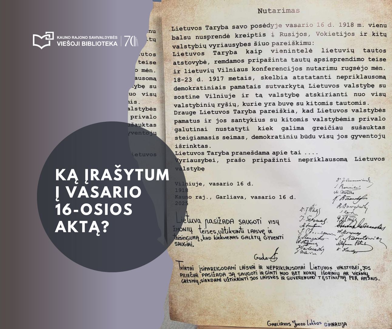 Pirmą kartą dėstyti savo mintis Vasario 16-osios akto kopijoje panoro visos Garliavos miesto mokyklos. Prieš 107-erius metus Vasario 16-ąją surašytas dokumentas išlieka svarbus ir šiandien, todėl Garliavos kultūros centras siekė įtraukti jaunimą į pilietiškumo pamoką. Moksleiviams buvo pasiūlyta ne tik paanalizuoti dokumento reikšmę, bet ir patiems prisidėti prie istorinio akto papildymo.