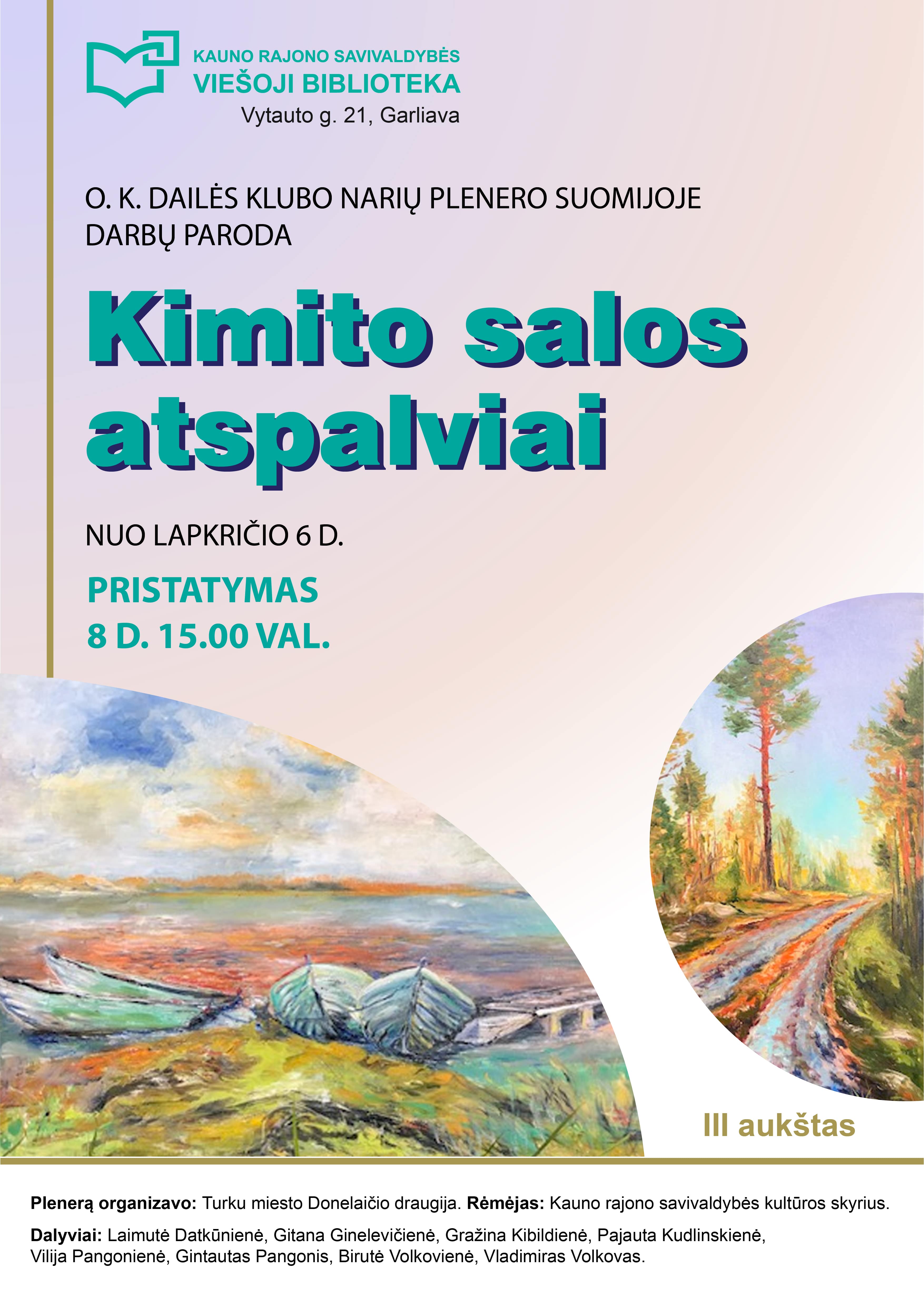 ▬ Kauno rajono savivaldybės viešojoje bibliotekoje, Konferencijų salėje, visą lapkričio mėnesį eksponuojama O. K. dailės klubo narių plenero Suomijoje darbų paroda „Kimito salos atspalviai“.