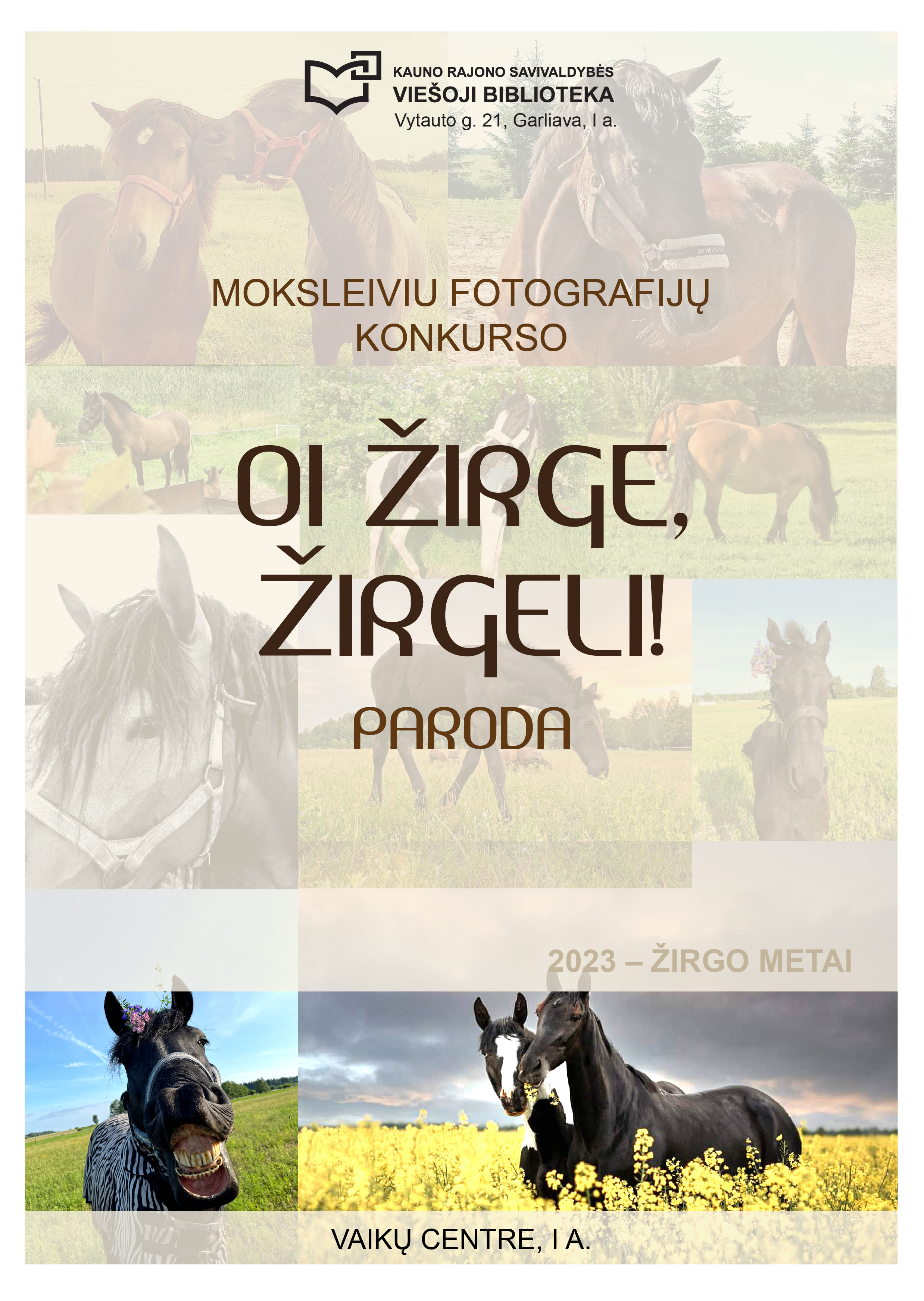 Rugsėjo mėnesį Kauno rajono savivaldybės viešosios bibliotekos Vaikų centre veiksiančioje parodoje „Oi žirge, žirgeli!“ eksponuojamos Kauno rajono moksleivių darytos fotografijos. Jų objektai – žirgai: grakštūs, greiti, liūdni, juokingi, išdykę... Jie visokie, bet visi labai gražūs. Tad kviečiame pasigėrėti moksleivių darbais bibliotekos pirmajame aukšte, Vaikų centre. Paroda eksponuojama visą rugsėjo mėnesį.