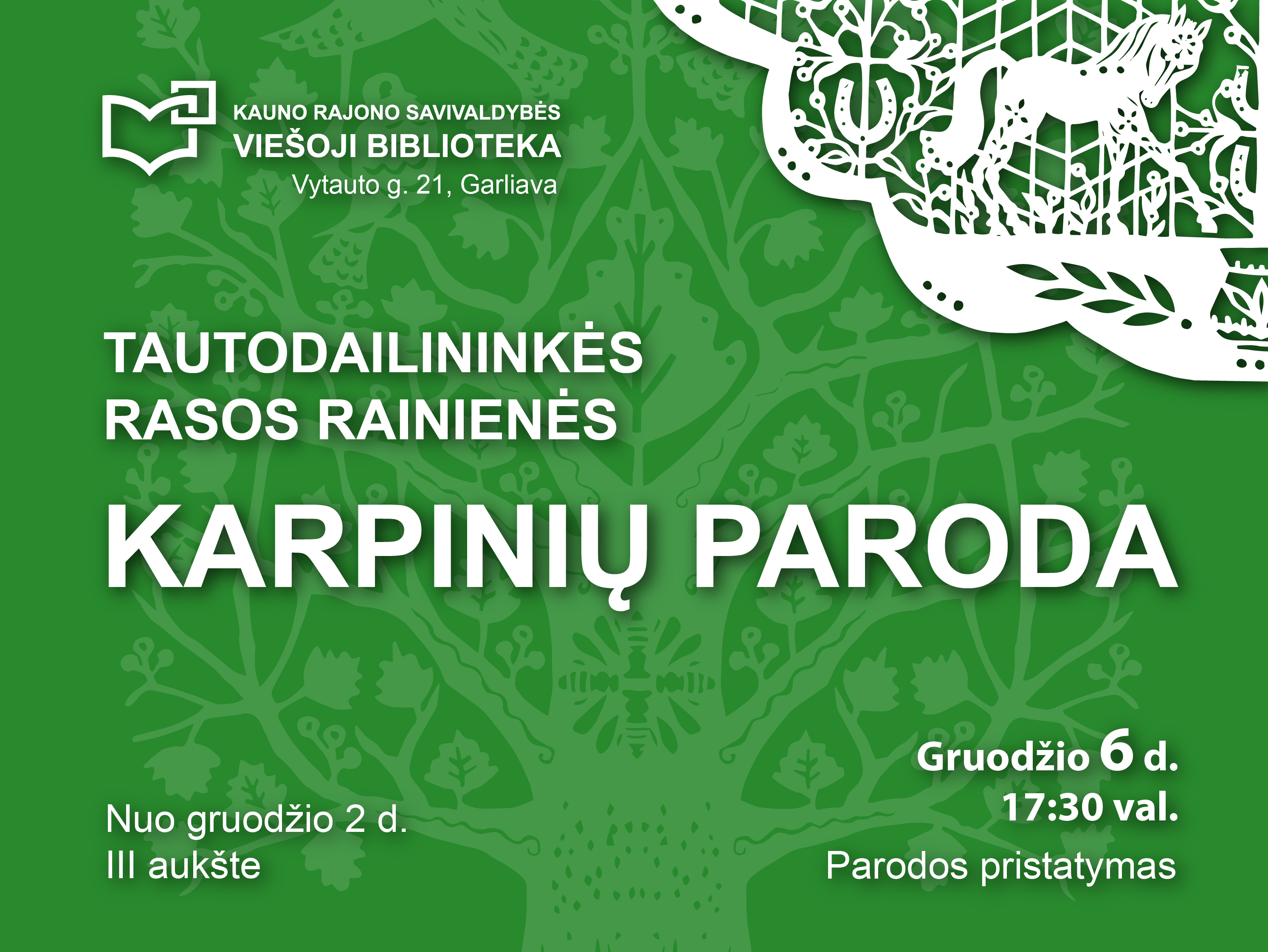 Gruodžio 6-ąją kviečiame Jus į tautodailininkės Rasos Rainienės karpinių parodos pristatymą bibliotekoje.