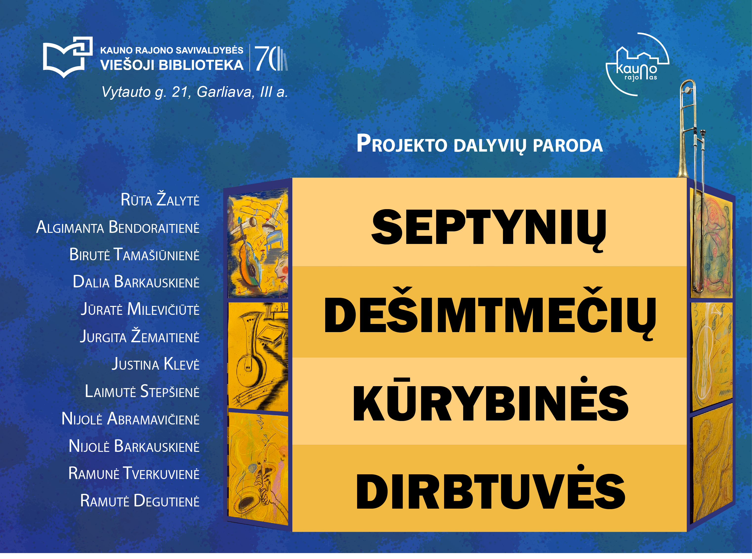 Kauno rajono savivaldybės viešoji biblioteka šį rudenį sėkmingai įgyvendino Kauno rajono savivaldybės finansuojamą neformaliojo suaugusiųjų švietimo projektą „Septynių dešimtmečių kūrybinės dirbtuvės“, skirtą Kauno rajono ir bibliotekos 70-mečiui pažymėti. Projektui vadovavo Kauno rajono savivaldybės viešosios bibliotekos direktorės pavaduotoja Jurgita Bartkevičiūtė, kūrybines veiklas koordinavo bibliotekos edukatorė Kristina Meilutė.