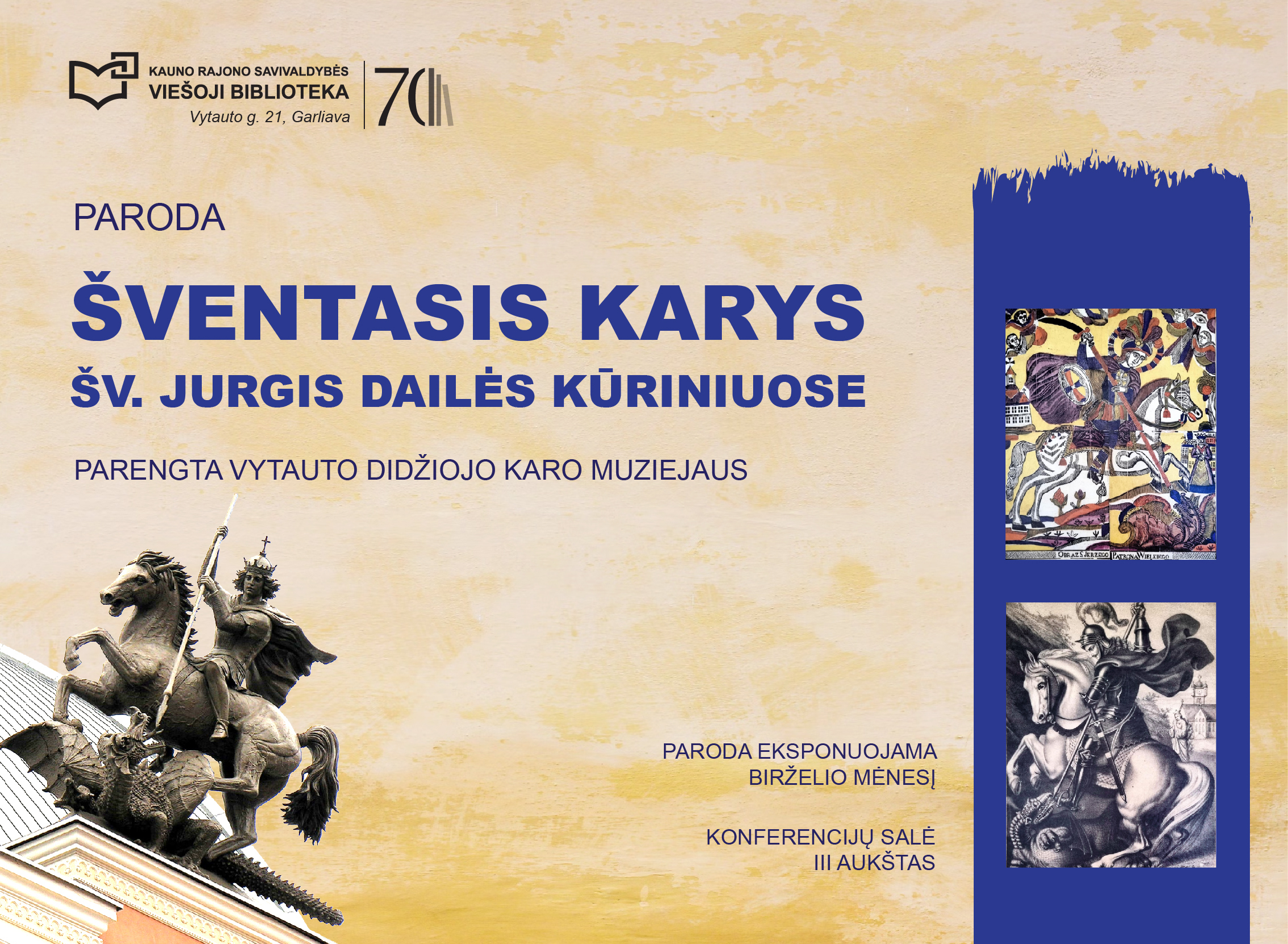 Kauno rajono savivaldybės viešojoje bibliotekoje eksponuojama Vytauto Didžiojo karo muziejaus parengta kilnojamoji paroda „Šventasis karys. Šv. Jurgis dailės kūriniuose“. Joje reprezentuojami XIX—XX a. liaudies ir profesionaliosios kūrybos bei sakralinės dailės kūriniai.