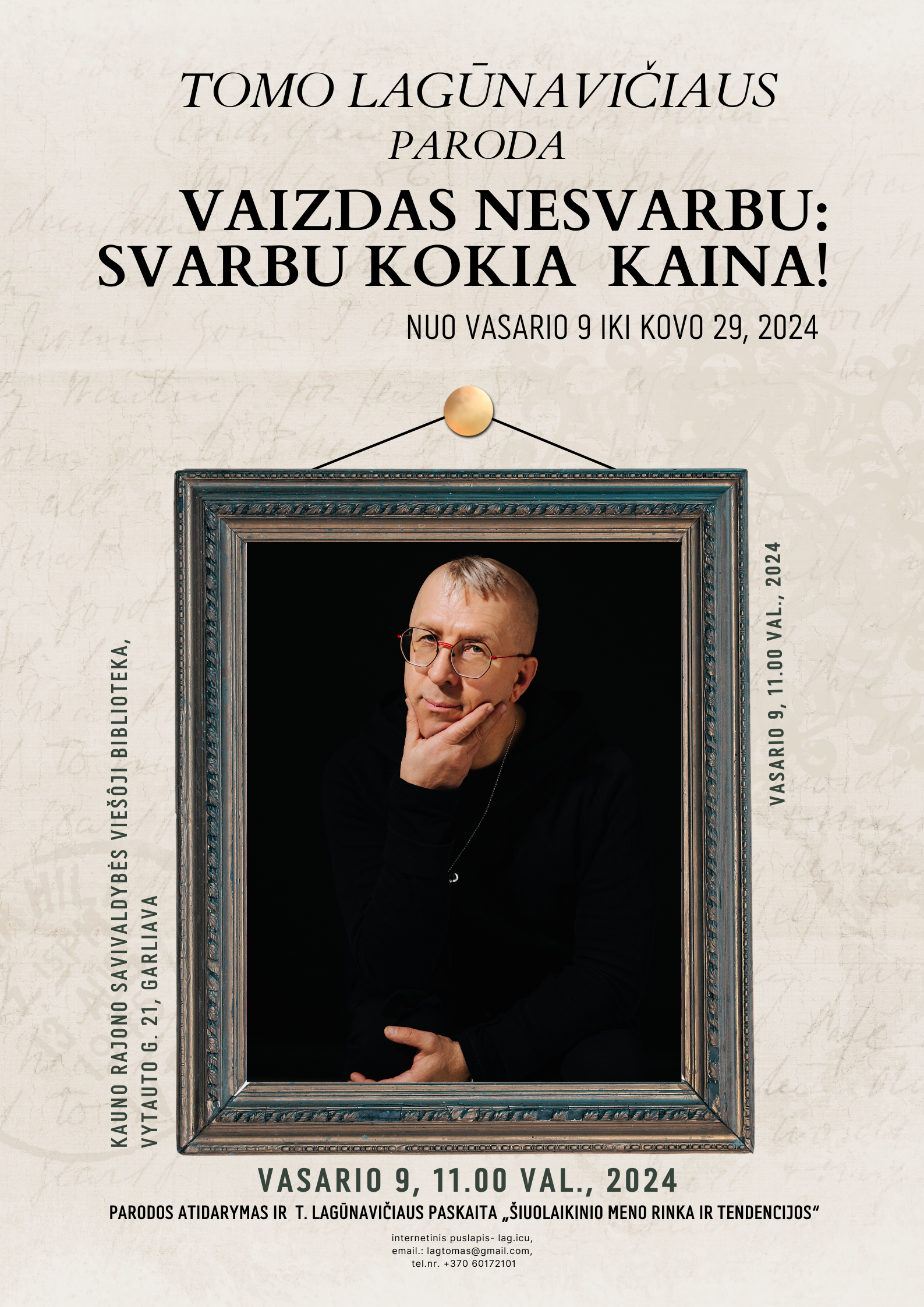 Vasario 9–kovo 29 d. Kauno rajono savivaldybės viešojoje bibliotekoje, III aukšte, Parodų salėje, eksponuojama tarpdisciplininio meno atstovo Tomo Lagūnavičiaus paroda „Vaizdas nesvarbu: svarbu, kokia kaina!“