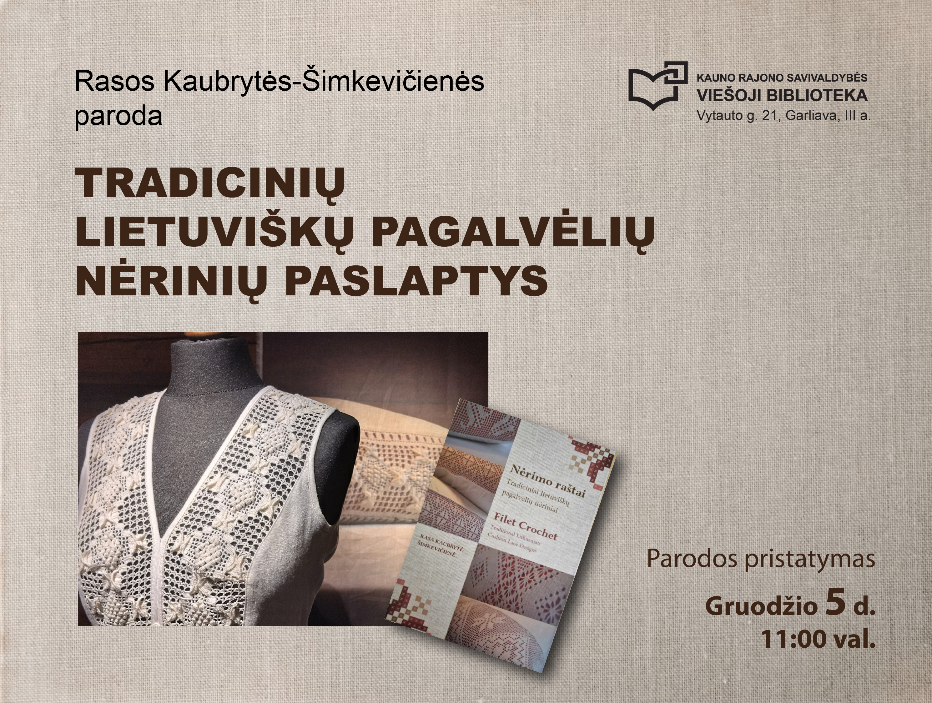 Parodos pristatymas įvyks gruodžio 5 d. 11.00 val., turėsite galimybę įsigyti R. Kaubrytės-Šimkevičienės knygą „Nėrimo raštai“, kurią autorė išleido savo lėšomis, siekdama užfiksuoti nėrimo technikas, kad jos nepražūtų užmarštyje.