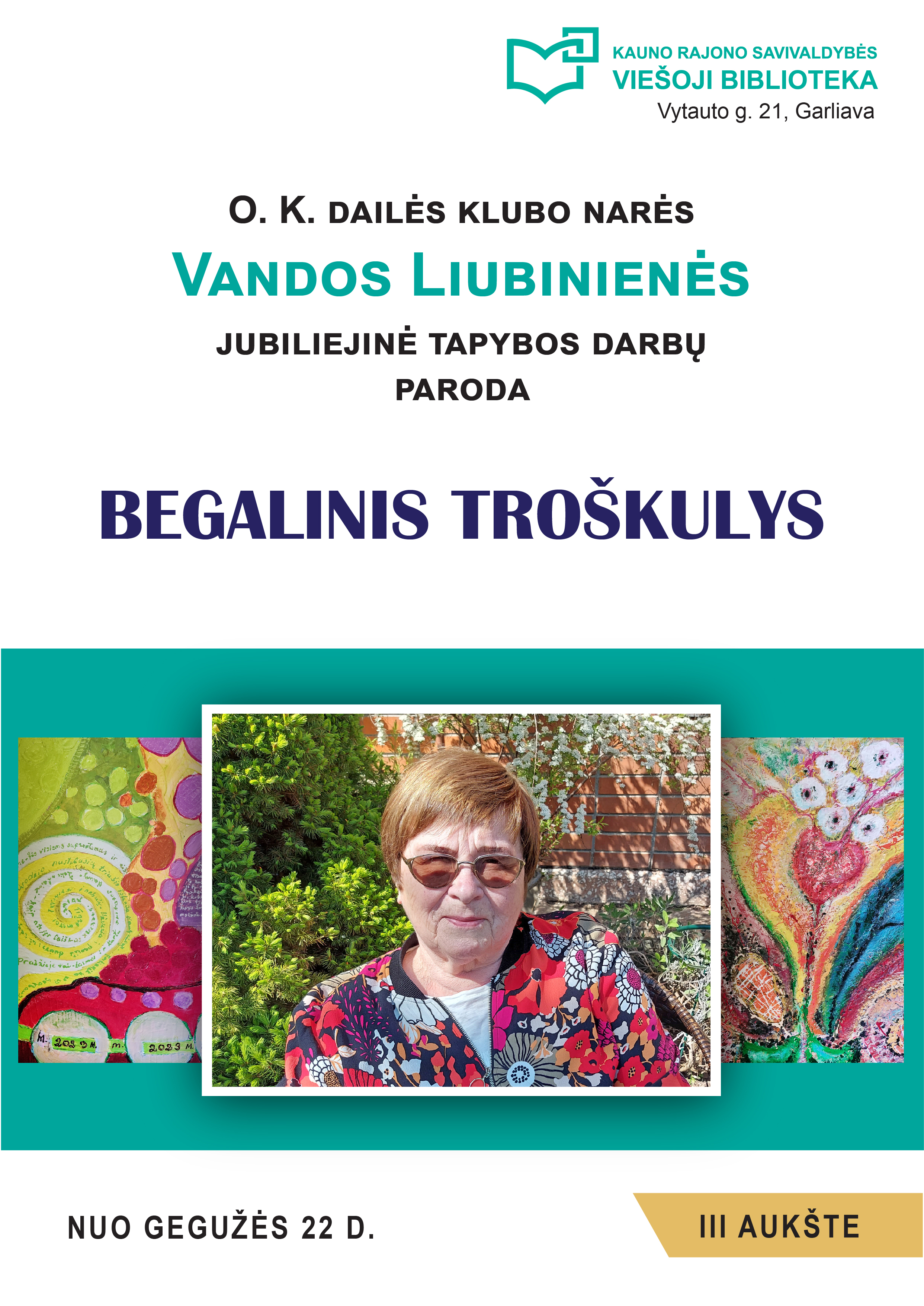 Nuo gegužės 22 d. Kauno rajono savivaldybės viešojoje bibliotekoje eksponuojama O. K. dailės klubo narės Vandos Liubinienės jubiliejinė tapybos darbų paroda „Begalinis troškulys“.