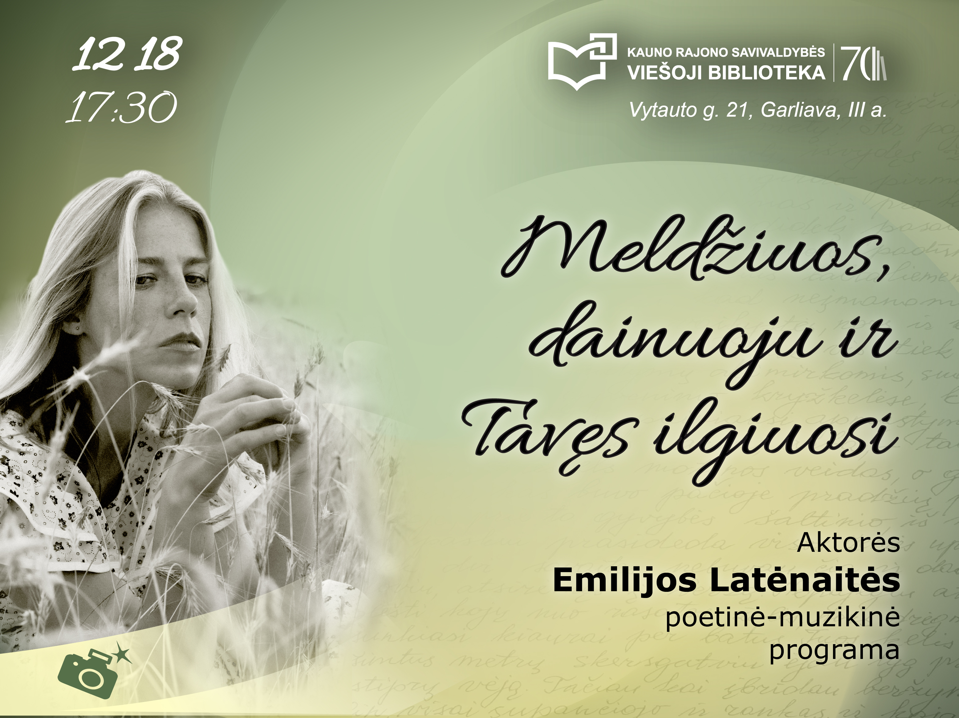 Aktorė Emilija Latėnaitė kviečia patirti subtilią poezijos ir muzikos harmoniją Kauno rajono savivaldybės viešojoje bibliotekoje. Iškilaus lietuvių rašytojo, tremtinio Antano Miškinio poetiniai žodžiai byloja šiuolaikiniam žmogui taip aktualiai, lyg būtų parašyti asmeniškai kiekvienam iš mūsų. Jautrios ir skaudžiai žmogiškos, bet šviesą nešančios literatūrinės-muzikinės programos metu aktorė E. Latėnaitė groja fleita ir skaito A. Miškinio eiles.
