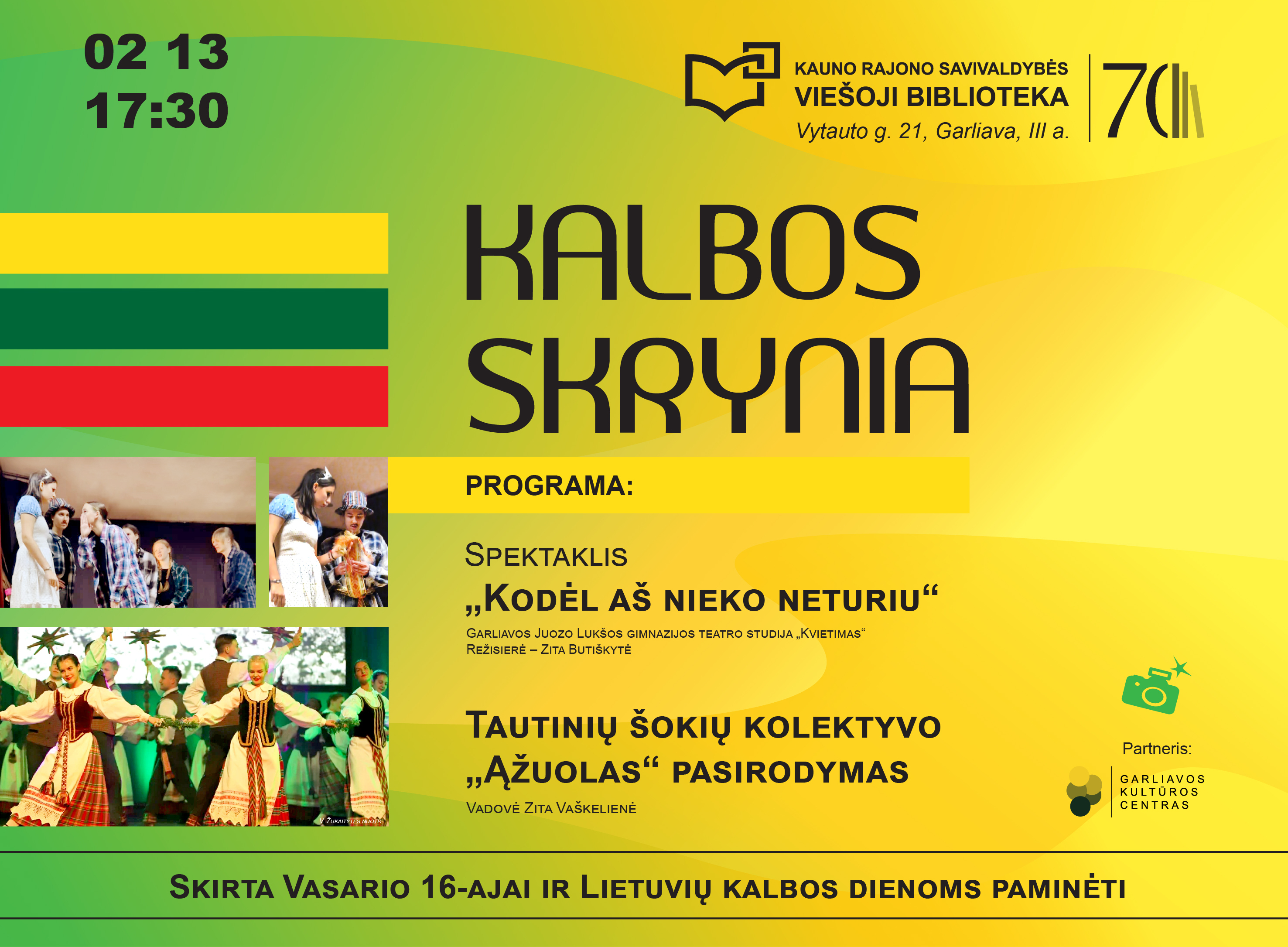 Garliaviečius ir svečius kviečiame į bibliotekos renginį, skirtą Vasario 16-ajai ir Lietuvių kalbos dienoms paminėti. Džiaugiamės, kad turime lietuvišką žodį, lietuvišką rūbą, lietuvišką pasaką, lietuvišką melodiją ir daug kitų gėrybių. Tai puiki proga švęsti savo tautiškumą! Prisijungsite?