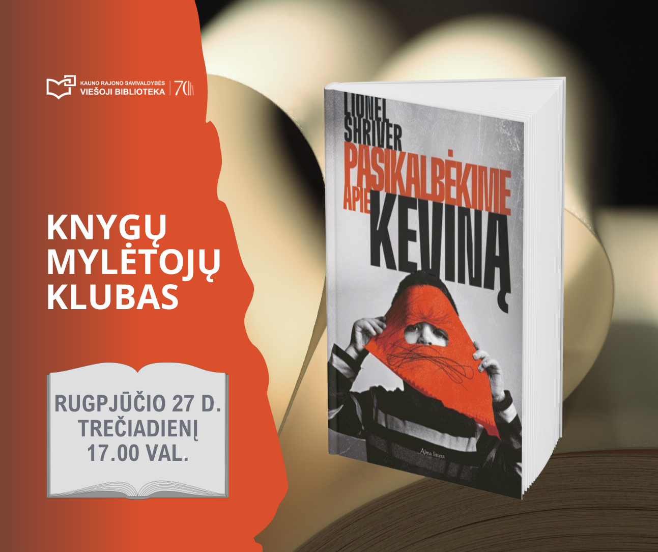 Kauno rajono savivaldybės viešojoje bibliotekoje susitikę rugpjūčio 27 d. 17.00 val. aptarsime Lionelio Shriverio knygą „Pasikalbėkime apie Keviną“. Iki pasimatymo bibliotekoje! Nuoširdžiausiai kviečiame į klubą naujus narius.