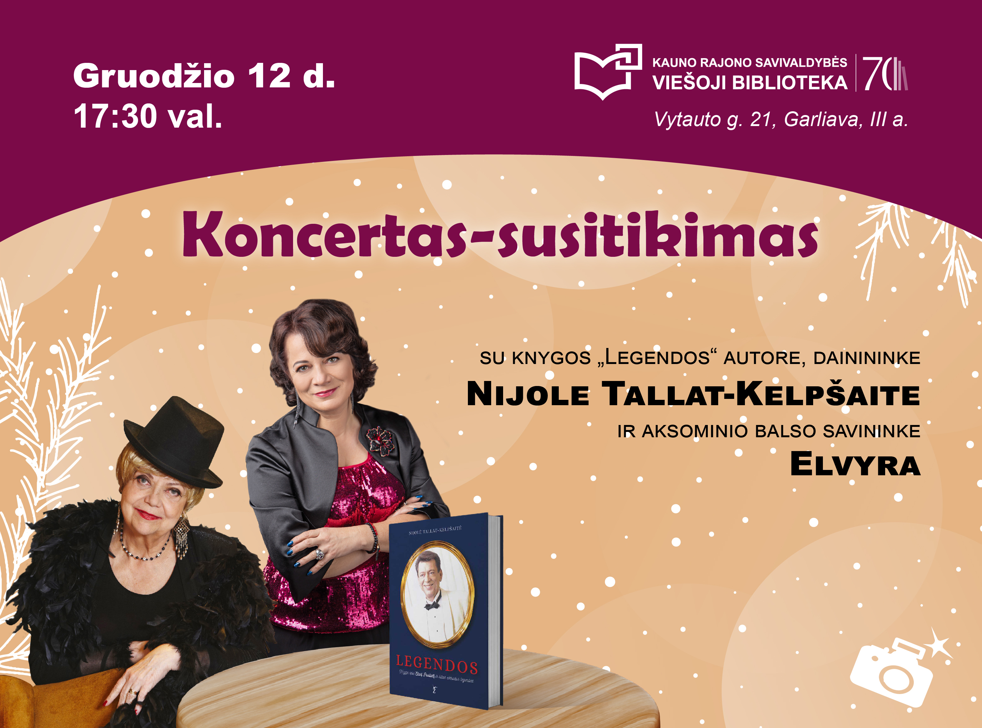 Renginio metu bus galimybė įsigyti atlikėjos Elvyros kompaktinių plokštelių ir Nijolės Tallat-Kelpšaitės knygą „Legendos“.