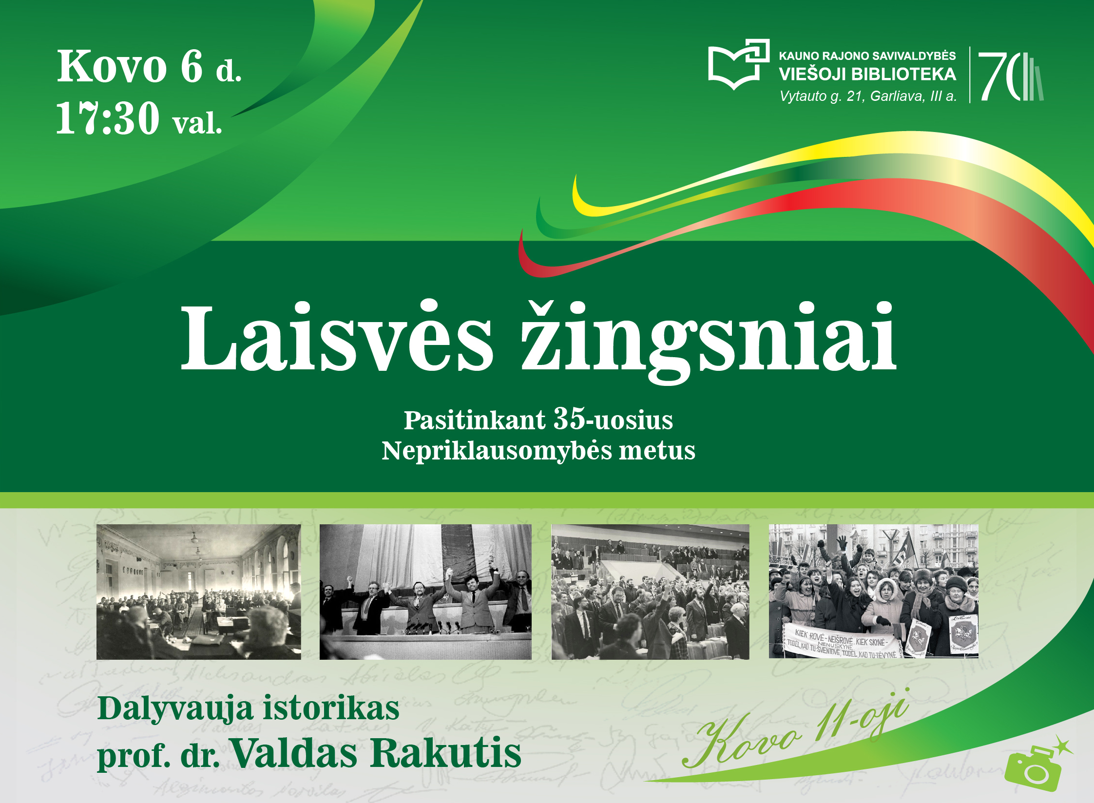 Šiemet minime Lietuvos nepriklausomybės atkūrimo 35-metį ir kviečiame Jus į susitikimą su istoriku, prof. dr. Valdu Rakučiu Kauno rajono savivaldybės viešojoje bibliotekoje Garliavoje.