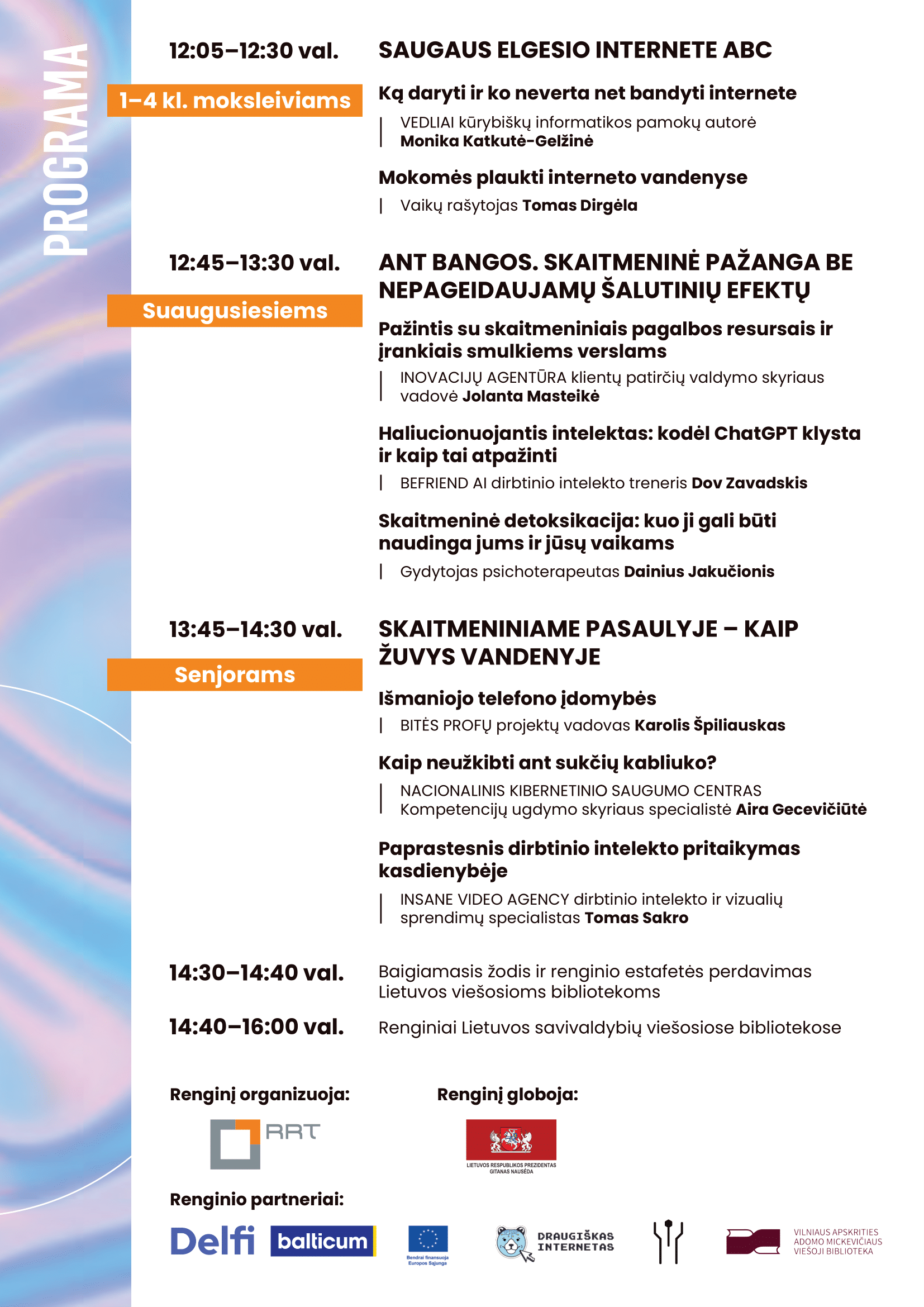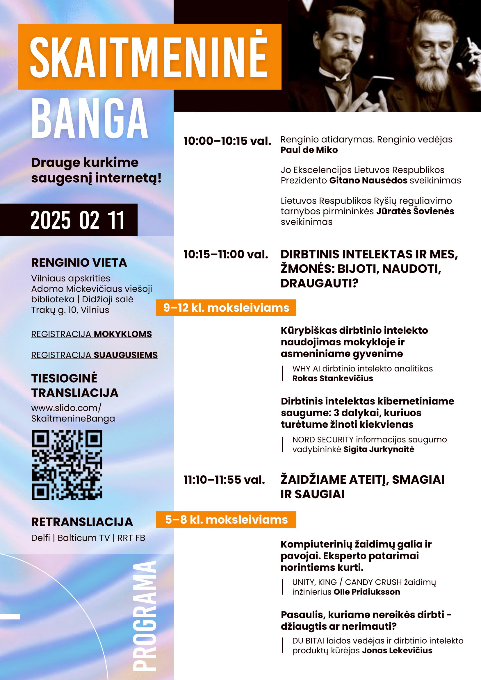 Vasario 11-ąją, antradienį, Kauno rajono savivaldybės viešojoje bibliotekoje minėsime Saugesnio interneto dieną. 10.00–14.40 val. kviečiame stebėti Ryšių reguliavimo tarnybos akcijos „Skaitmeninė banga“ transliacijas. Kauno rajono savivaldybės viešojoje bibliotekoje (II a., Informacinių paslaugų skaitykloje) transliuosime šias paskaitas: