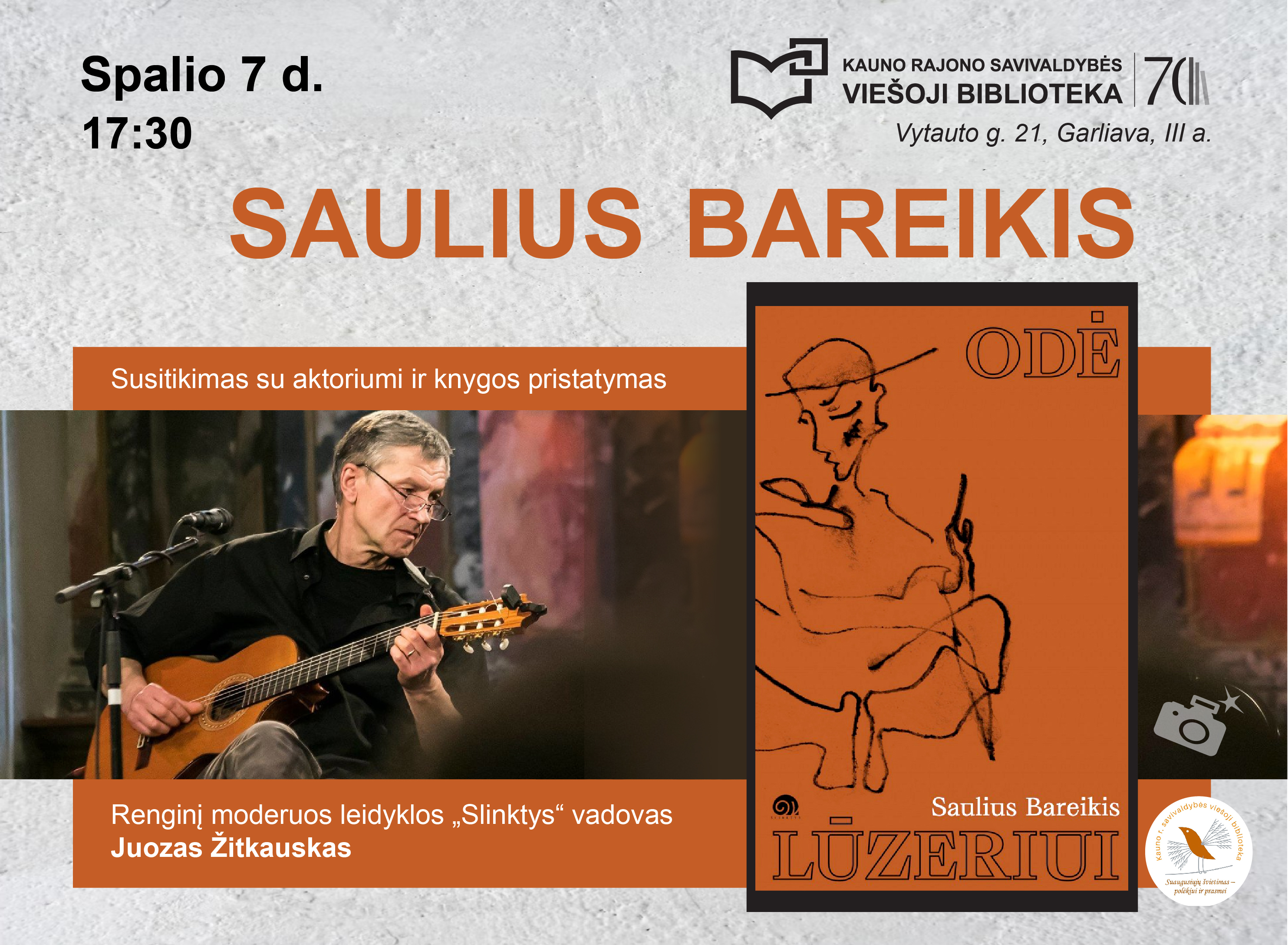 Legendinis Lietuvos teatro ir kino aktorius, įsimintinų vaidmenų Jaunimo teatre kūrėjas, „Aktorių trio" narys, dainininkas, o dabar – ir debiutuojantis prozininkas Saulius Bareikis svečiuosis Kauno rajono savivaldybės viešojoje bibliotekoje!