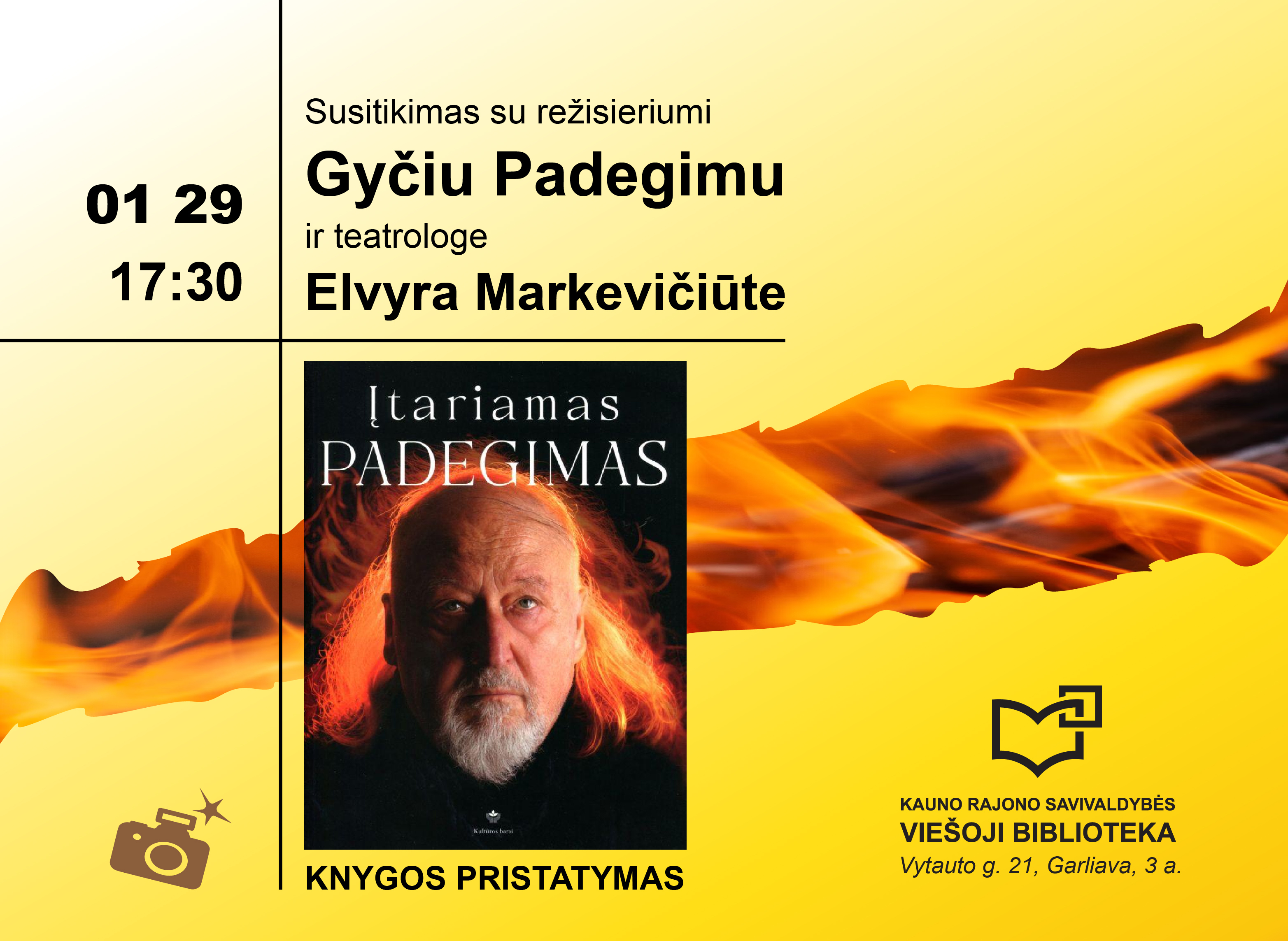 ▬ Kviečiame bibliotekoje susitikti su režisieriumi Gyčiu Padegimu, teatrologe Elvyra Markevičiūte ir Nacionalinio Kauno dramos teatro aktoriumi Henriku Savickiu. Kalbėsimės apie teatro pasaulio avansceną ir užkulisius, apie 2024 metais išleistą knygą „Įtariamas Padegimas“, kurioje pateikiama režisieriaus Gyčio Padegimo įvairiakryptės veiklos mozaika, atskleidžiamas kūrėjo originalumas ir unikalumas. Aktorius Henrikas Savickis dalysis patirtimis ir mintimis: ką aktoriui reiškia vaidinti Gyčio Padegimo spektaklyje? „Įtariamas Padegimas“ – tai unikalus žvilgsnis į teatro legendą!