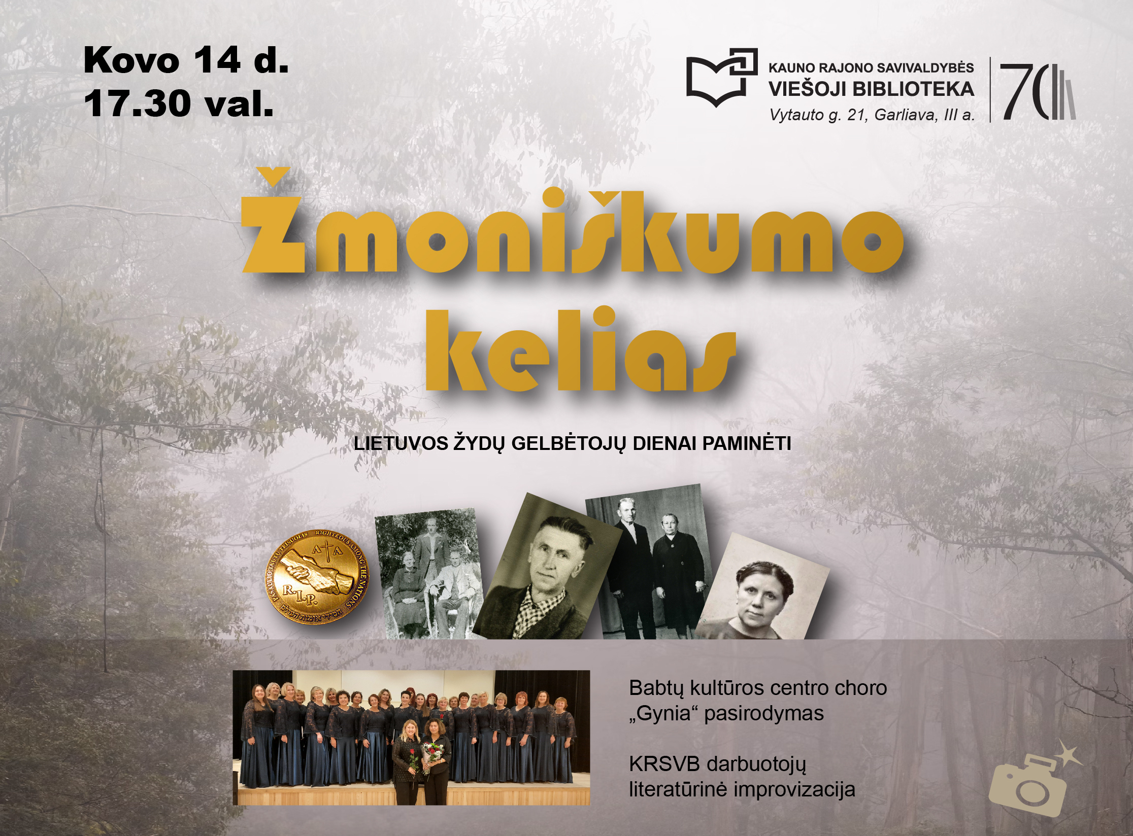 Kviečiame į jautrų meninį renginį, skirtą pagerbti tyliosios drąsos herojus – Lietuvos žydų gelbėtojus! Renginyje „Žmoniškumo kelias“ prisiminsime žmones, kurie tamsiausiu istoriniu laikotarpiu išdrįso ištiesti pagalbos ranką ir gelbėjo žydų tautybės kaimynus Kauno rajone. Leiskite menui prakalbinti istoriją ir įprasminti išskirtinius žmoniškumo pavyzdžius mūsų krašte. Ateikite pajusti, išgirsti ir suprasti. Meninės programos akcentai: Babtų kultūros centro choro „Gynia“ jautri muzikinė kompozicija ir Kauno rajono savivaldybės viešosios bibliotekos darbuotojų literatūrinė improvizacija. Laukiame visų, kuriems svarbi istorinė atmintis! Renginys nemokamas.