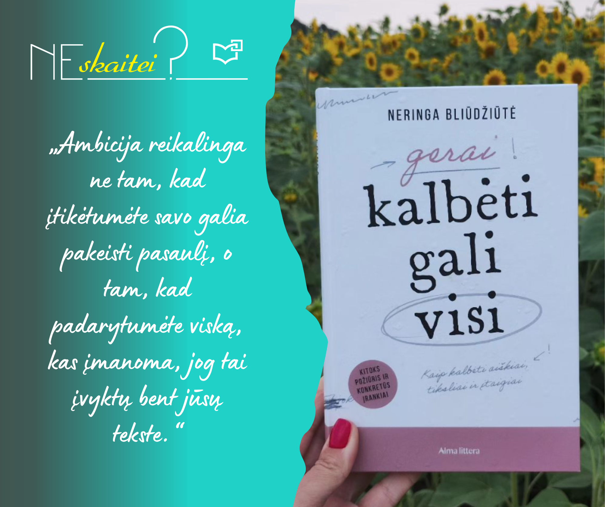 Socialiniame tinkle „Instagram“ perskaitytų knygų įspūdžiais besidalijanti Laura (paskyra @suskaityta) tęsia dvi gražias tradicijas: reguliariai lankytis mūsų bibliotekoje ir perskaitytus perliukus rekomenduoti kitiems skaitytojams. Šįsyk Lauros rankose ir mintyse – ne grožinis, bet šiais informacijos pertekliaus laikais labai naudingas tekstas – Neringos Bliūdžiūtės knyga „Gerai kalbėti gali visi“.