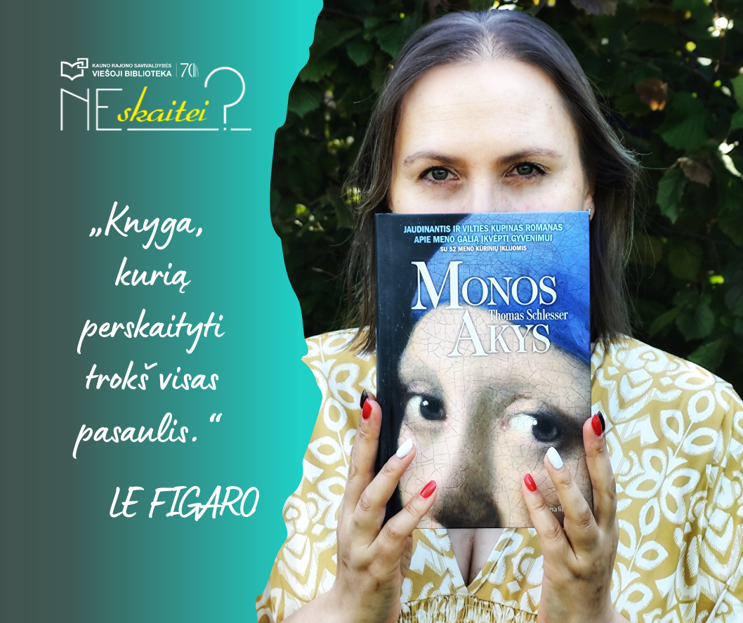 Virtualiame skaitytojų klube „[ne]skaitei?“ šią savaitę svečiuojasi Kristina Meilutė – bibliotekos edukatorė, vadovaujanti rankdarbių kūrėjų klubui „Susitikime kūryboje“, įgyvendinanti Medijų ir informacinio raštingumo programos (MIRKT) veiklas bibliotekoje, vedanti įvairiausias kūrybines edukacijas (tarp jų – priklausančias Kultūros paso platformai). Be viso šito, ji yra ir profesionali fotomenininkė, estetiškai jautriu ir išlavintu žvilgsniu tyrinėjanti meno pasaulį. Didelį įspūdį Kristinai paliko Thomo Schlesserio knyga „Monos akys“ – romanas apie meno galią įkvėpti gyvenimui (su 52 meno kūrinių įklijomis).