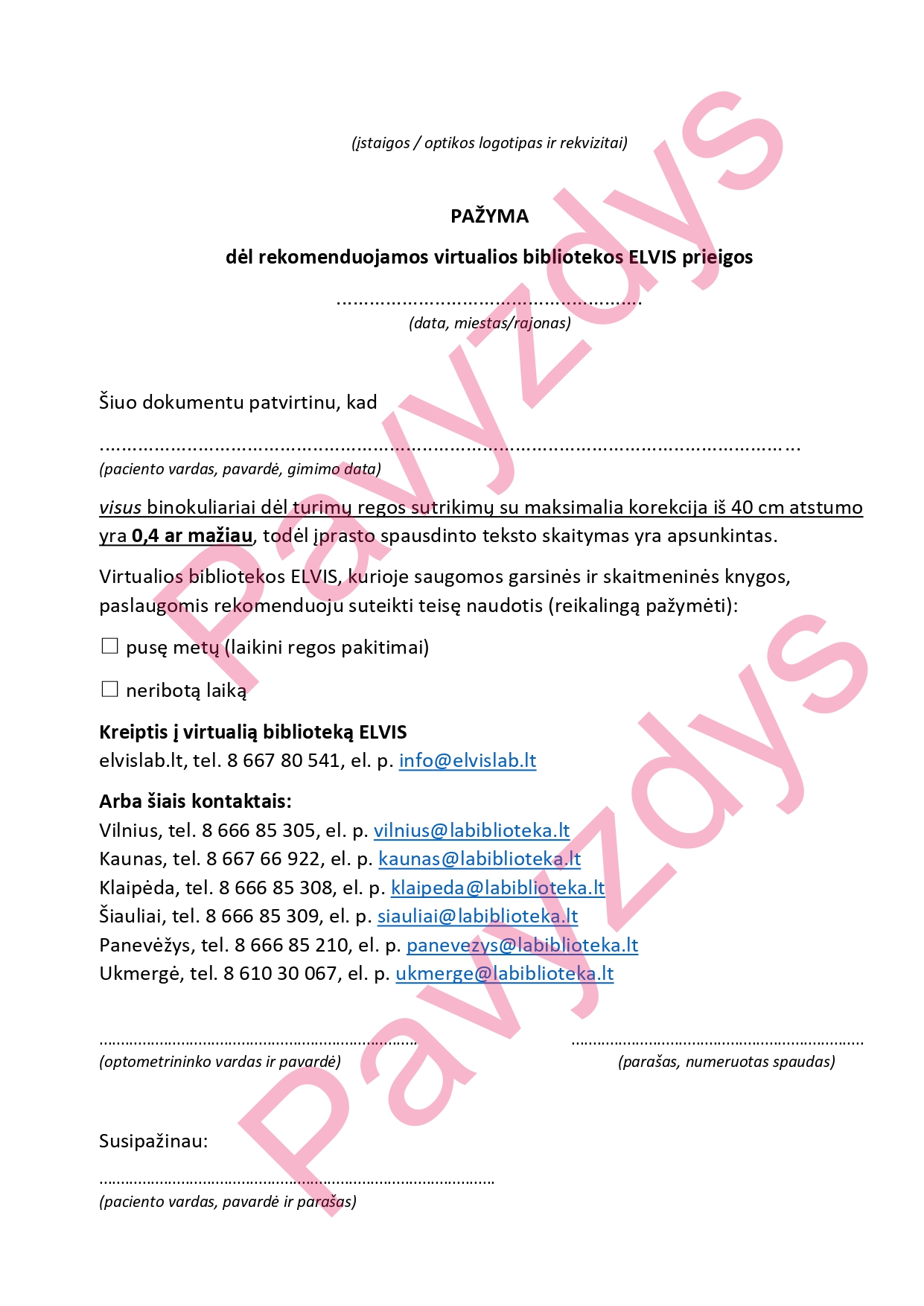 PAVYZDYS, kokios gydytojo arba optometrininko pažymos Jums reikėtų, kad taptumėte ELVIS bibliotekos skaitytoju: