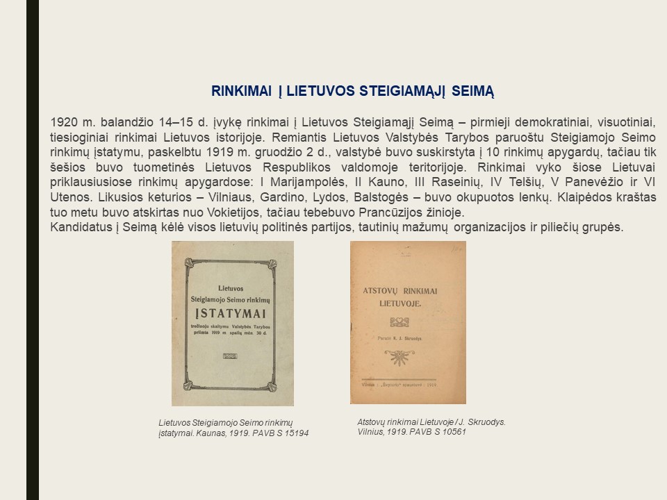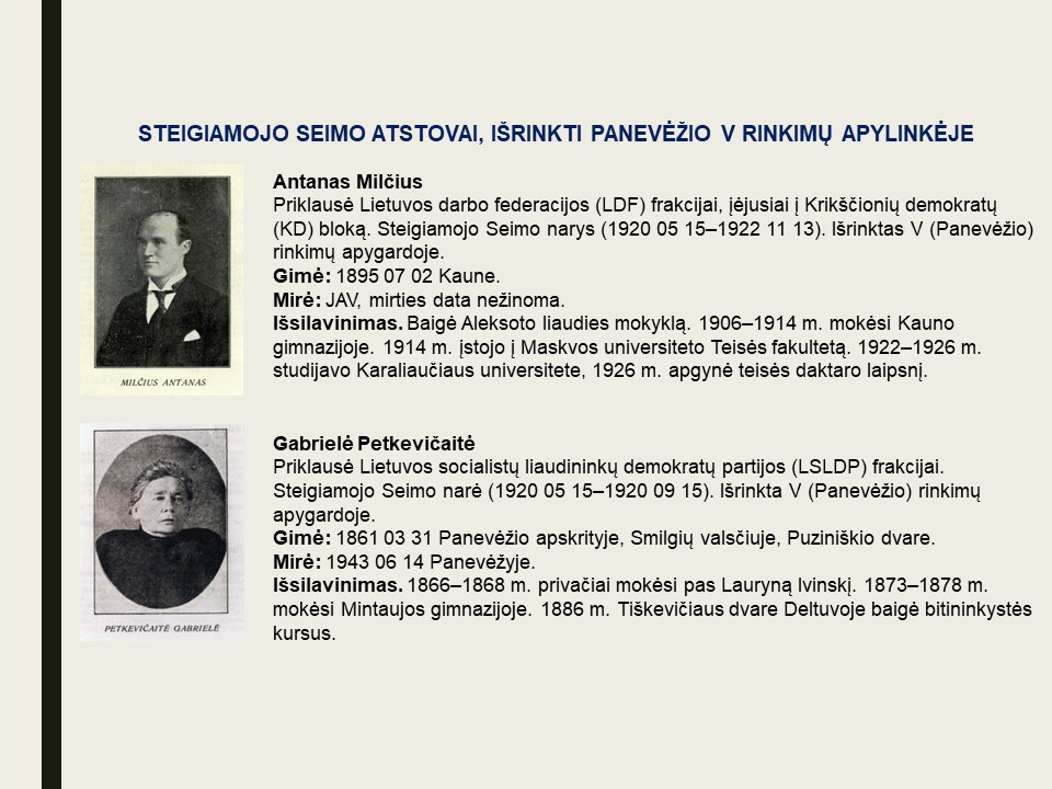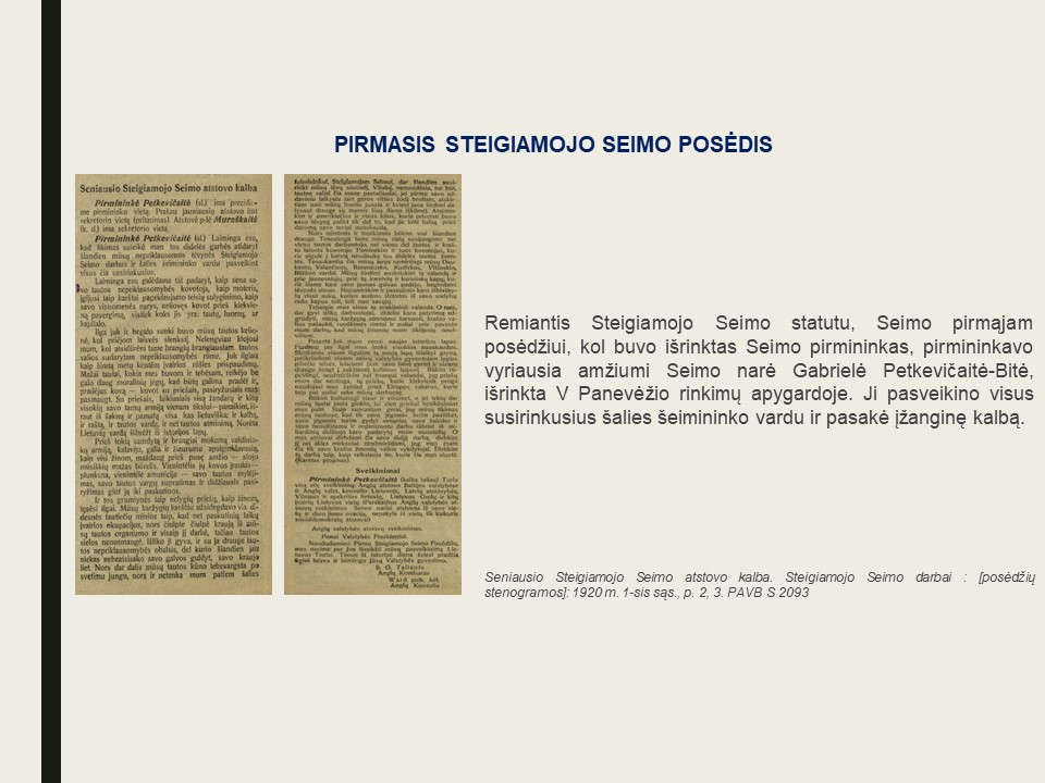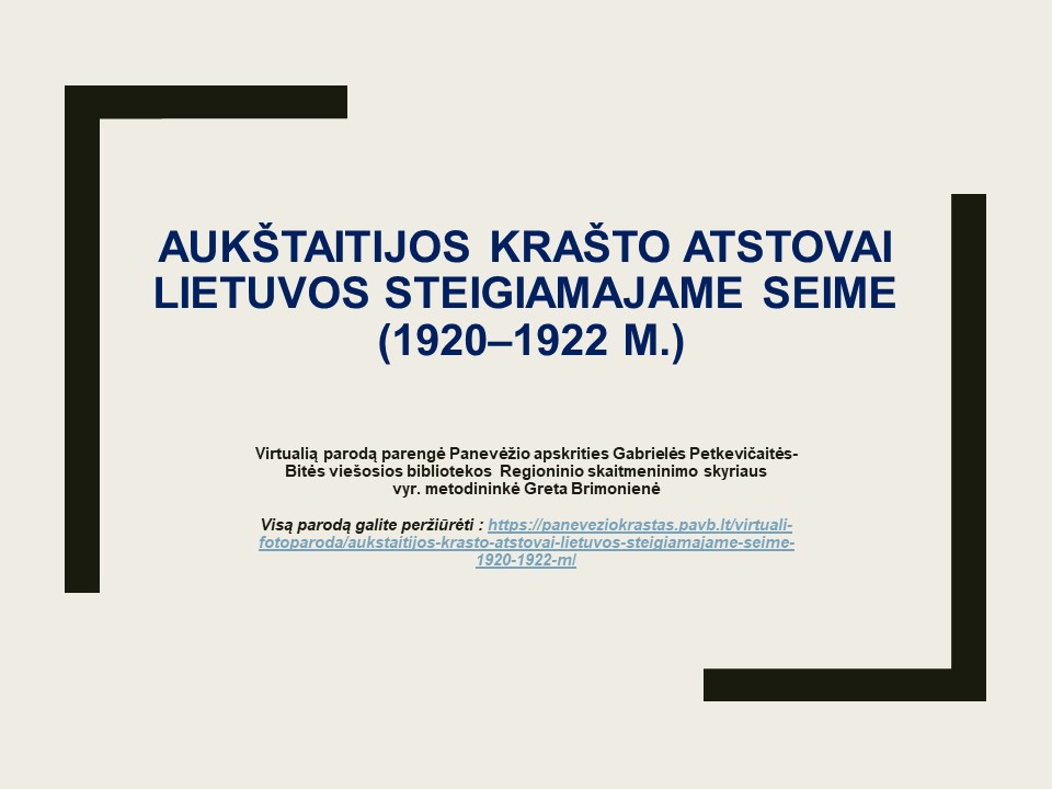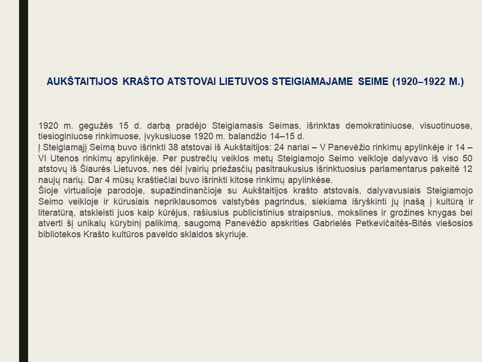 Virtualioje parodoje „Aukštaitijos krašto atstovai Lietuvos Steigiamajame Seime (1920–1922 m.)“ apžvelgiami 1920 m. balandžio 14–15 d. įvykę rinkimai į Lietuvos Steigiamąjį Seimą, pirmasis posėdis ir svarbiausia veikla. Taip pat minima 1922 m. rugpjūčio 1 d. priimta Valstybės Konstitucija, kuri įtvirtino Lietuvos piliečių teises ir laisves. Be to, pristatomi Aukštaitijos regiono atstovai, dalyvavę Steigiamojo Seimo veikloje. Medžiagą parengė Panevėžio apskrities Gabrielės Petkevičaitės-Bitės viešosios bibliotekos Regioninio skaitmeninimo skyriaus vyr. metodininkė Greta Brimonienė.