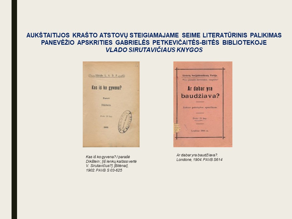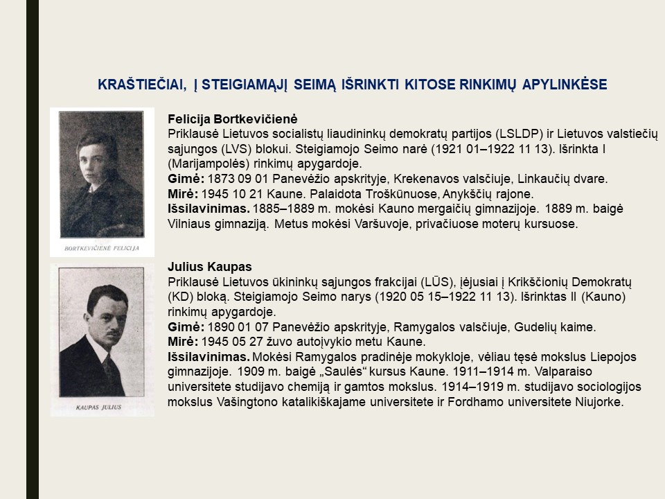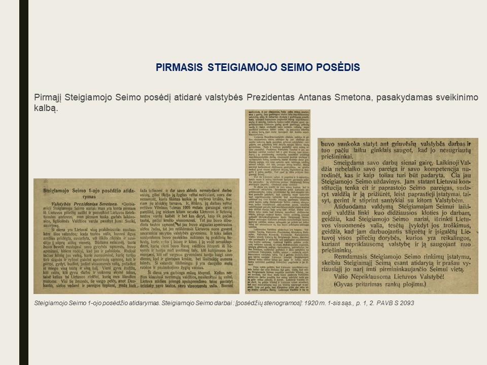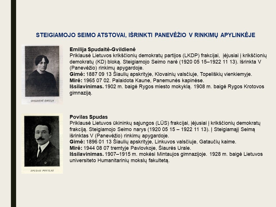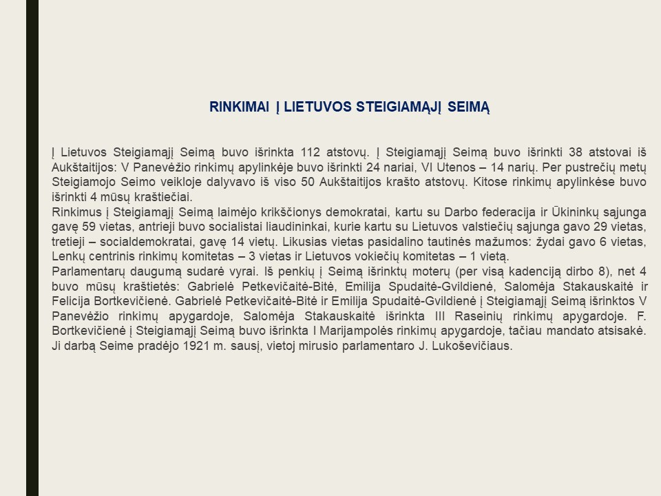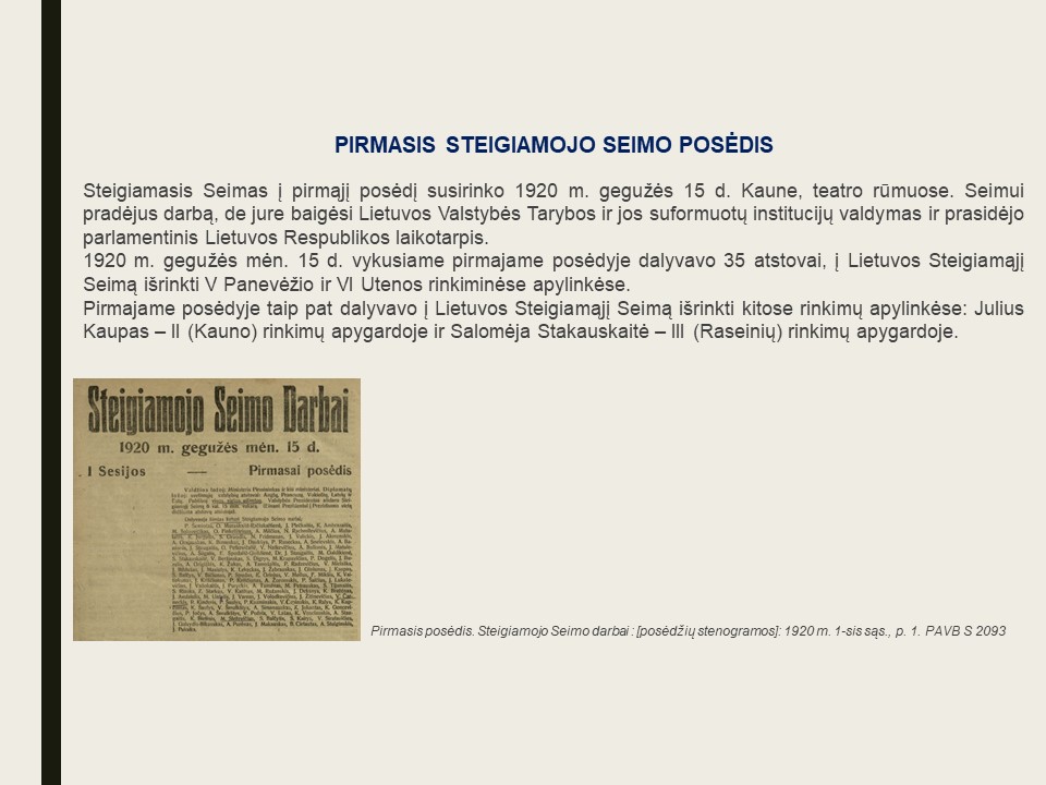 Virtualioje parodoje „Aukštaitijos krašto atstovai Lietuvos Steigiamajame Seime (1920–1922 m.)“ apžvelgiami 1920 m. balandžio 14–15 d. įvykę rinkimai į Lietuvos Steigiamąjį Seimą, pirmasis posėdis ir svarbiausia veikla. Taip pat minima 1922 m. rugpjūčio 1 d. priimta Valstybės Konstitucija, kuri įtvirtino Lietuvos piliečių teises ir laisves. Be to, pristatomi Aukštaitijos regiono atstovai, dalyvavę Steigiamojo Seimo veikloje. Medžiagą parengė Panevėžio apskrities Gabrielės Petkevičaitės-Bitės viešosios bibliotekos Regioninio skaitmeninimo skyriaus vyr. metodininkė Greta Brimonienė.