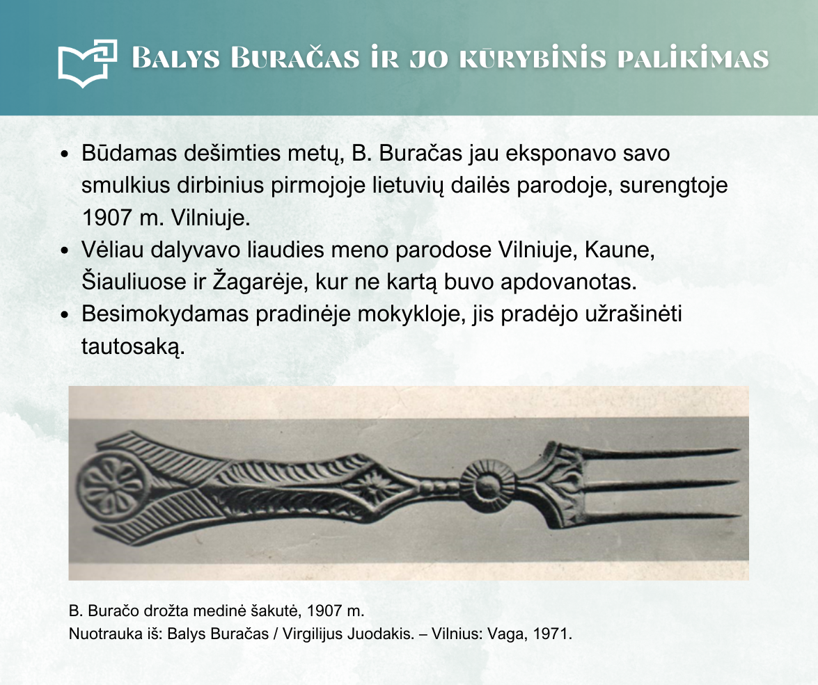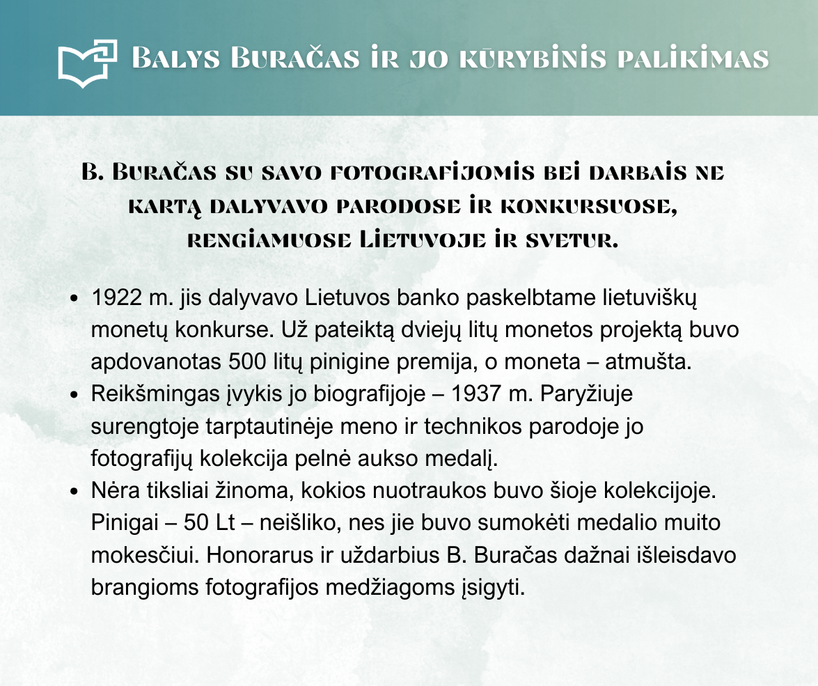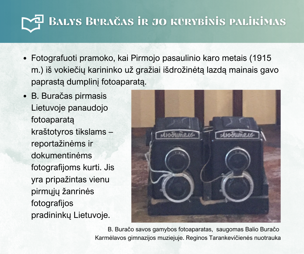 Ar žinojote, kaip B. Buračas gavo savo pirmąjį fotoaparatą? 1915 m. jis pasiūlė gražiai drožinėtą lazdą vokiečių karininkui mainais į dumplinį fotoaparatą. Ir mainai pavyko! Nuo tos dienos prasidėjo neįtikėtina kelionė per Lietuvą, kurios metu jis: