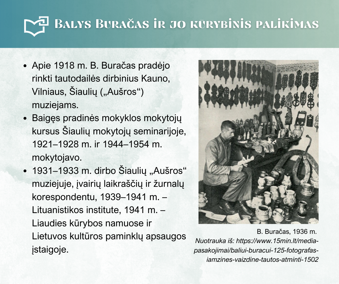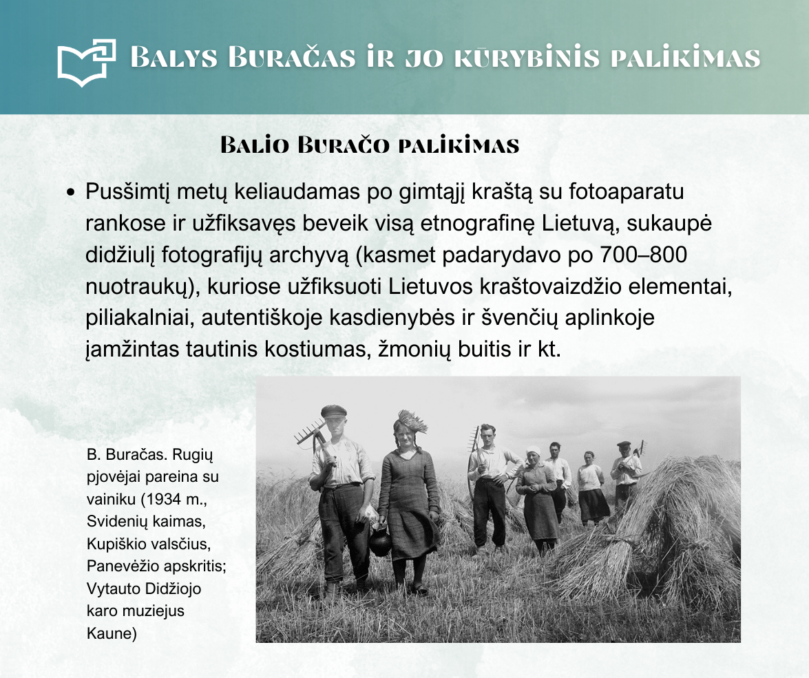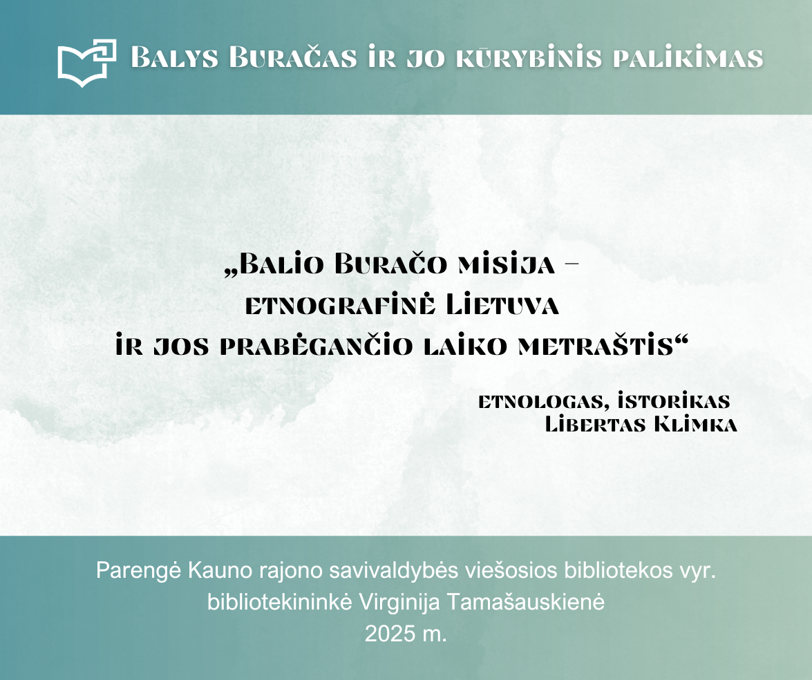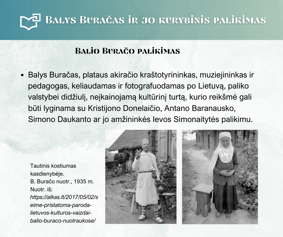 Kviečiame apžiūrėti virtualią parodą, skirtą iškiliam Lietuvos pedagogui, fotografui, etnografui, kraštotyrininkui, spaudos bendradarbiui Baliui Buračui (1897–1972). 2025-ųjų sausio 18-ąją minime Balio Buračo 128-ąsias gimimo metines.