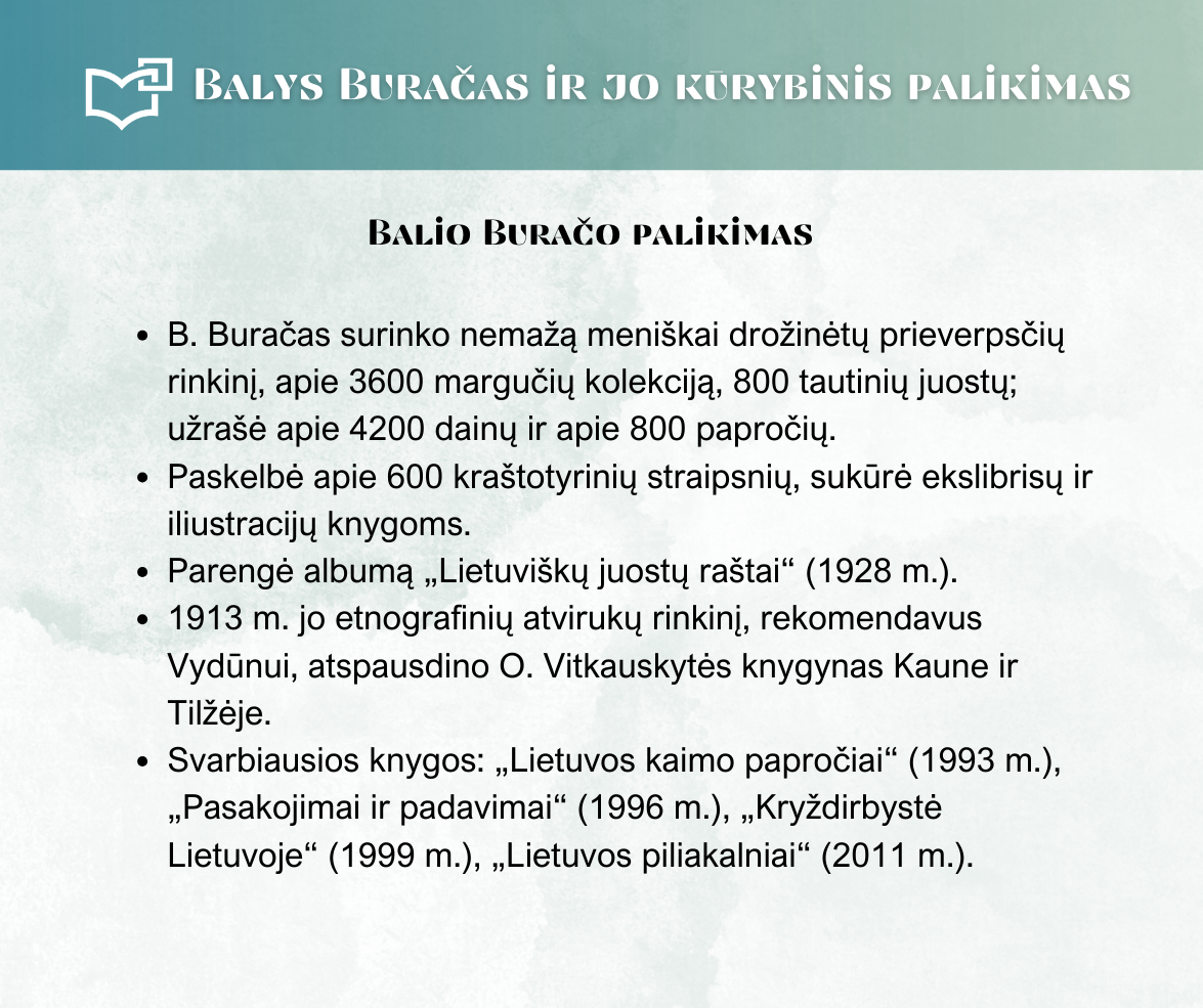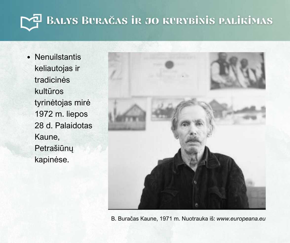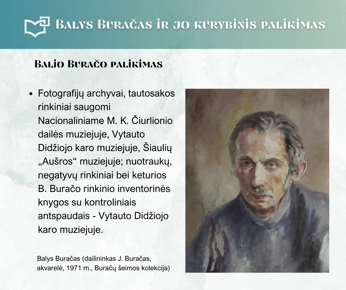 Kviečiame apžiūrėti virtualią parodą, skirtą iškiliam Lietuvos pedagogui, fotografui, etnografui, kraštotyrininkui, spaudos bendradarbiui Baliui Buračui (1897–1972). 2025-ųjų sausio 18-ąją minime Balio Buračo 128-ąsias gimimo metines.