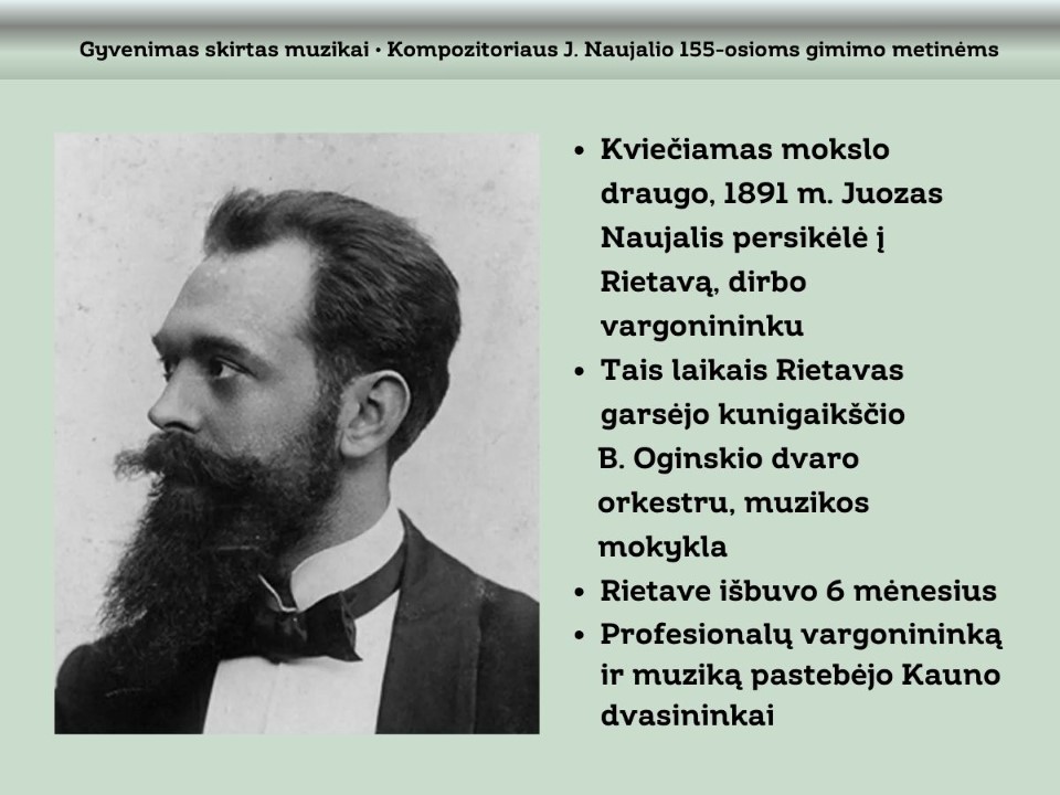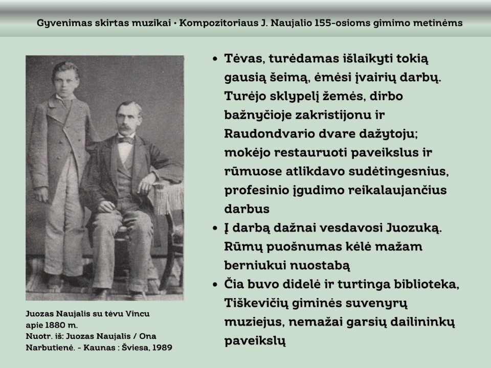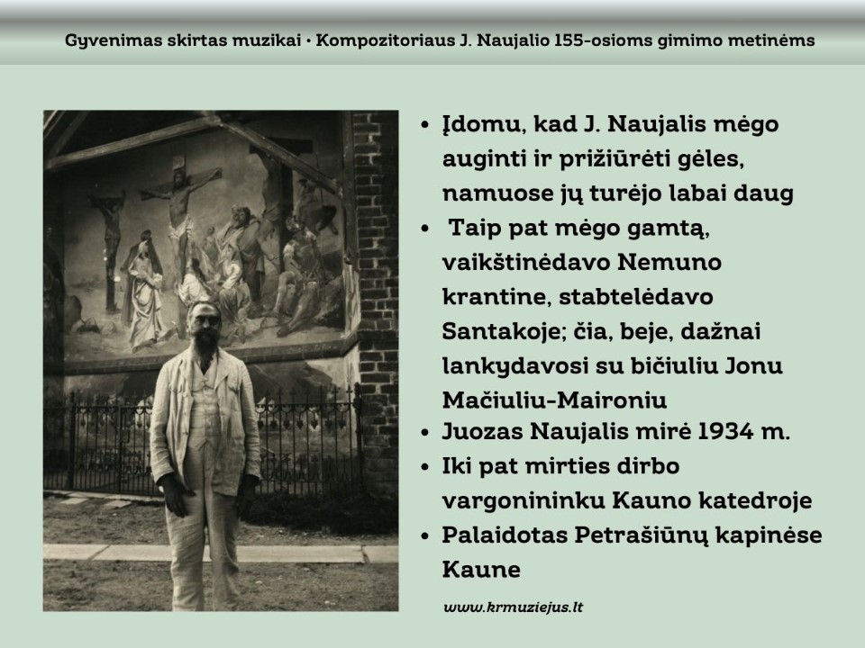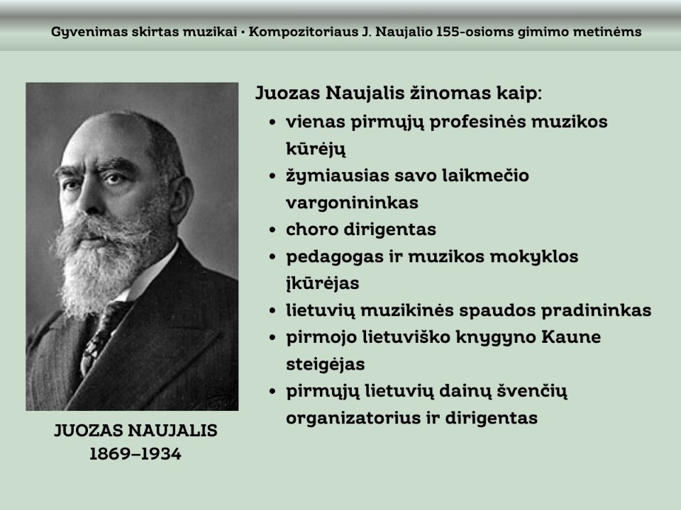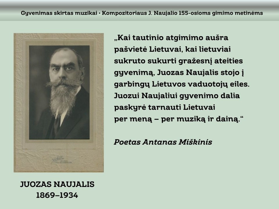 1869 m. balandžio 9 d. šį pasaulį Kauno rajone, Raudondvaryje, išvydo jauniausioji Vinco ir Justinos Naujalių atžala – Juozas. Tad šiemet, 2024 m. balandžio 9-ąją, sukanka 155 metai nuo Lietuvos muzikos patriarcho Juozo Naujalio (1869–1934) gimimo.