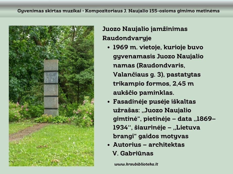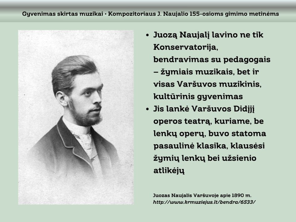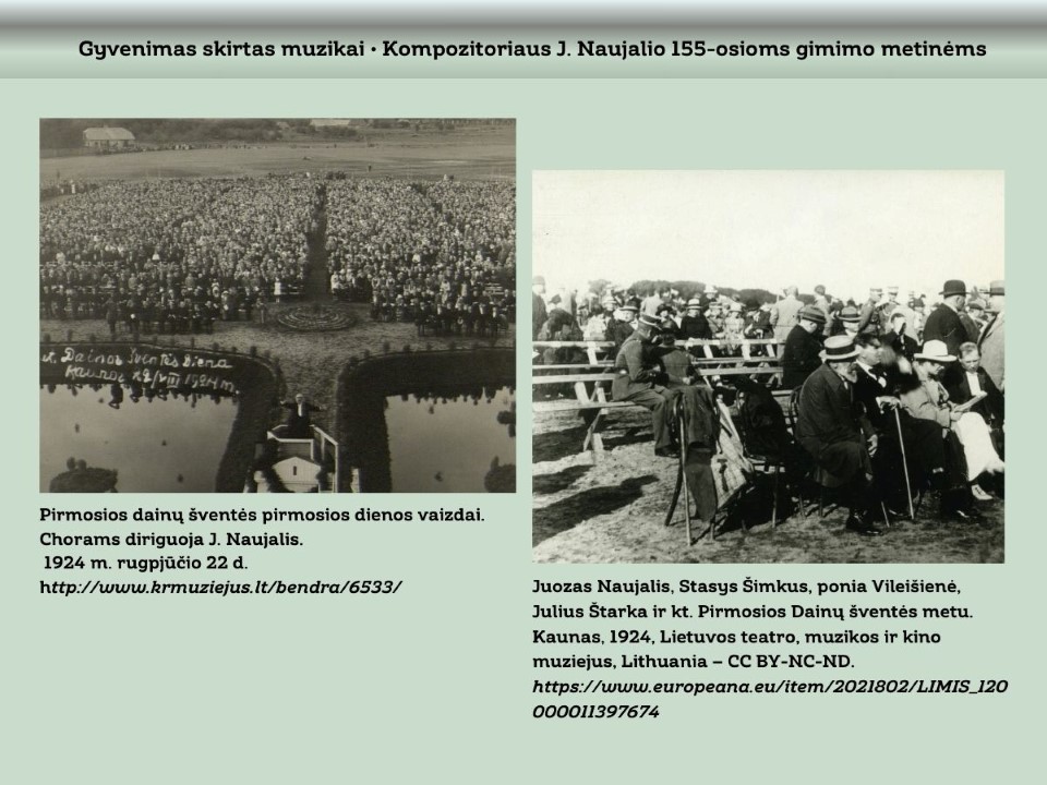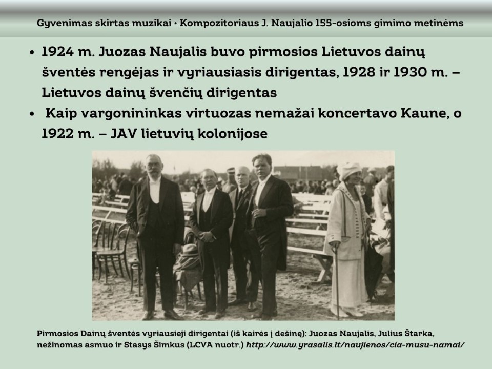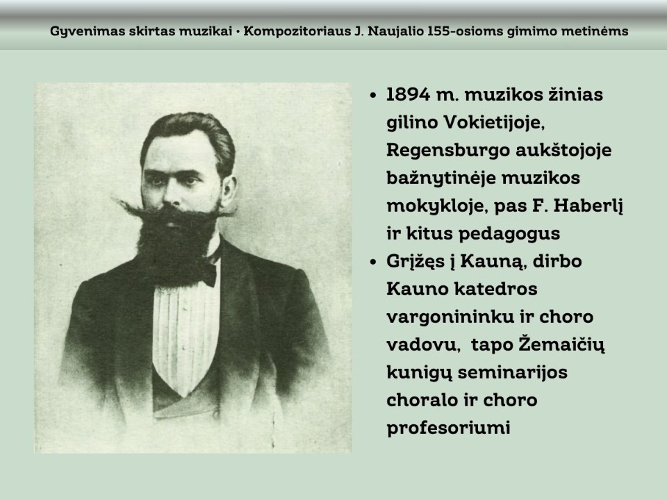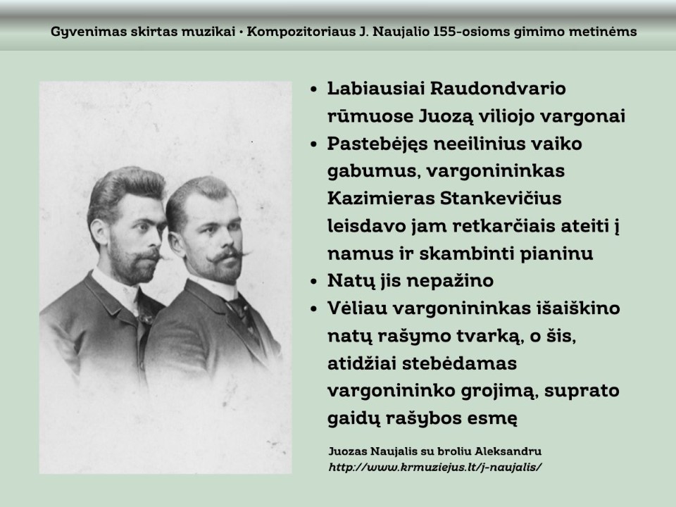 1869 m. balandžio 9 d. šį pasaulį Kauno rajone, Raudondvaryje, išvydo jauniausioji Vinco ir Justinos Naujalių atžala – Juozas. Tad šiemet, 2024 m. balandžio 9-ąją, sukanka 155 metai nuo Lietuvos muzikos patriarcho Juozo Naujalio (1869–1934) gimimo.
