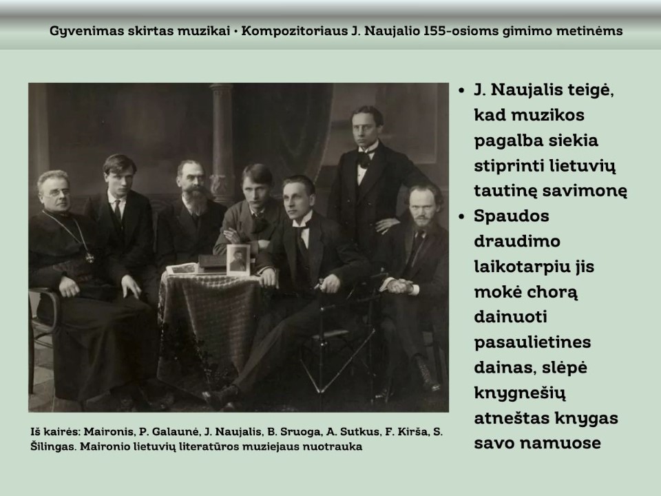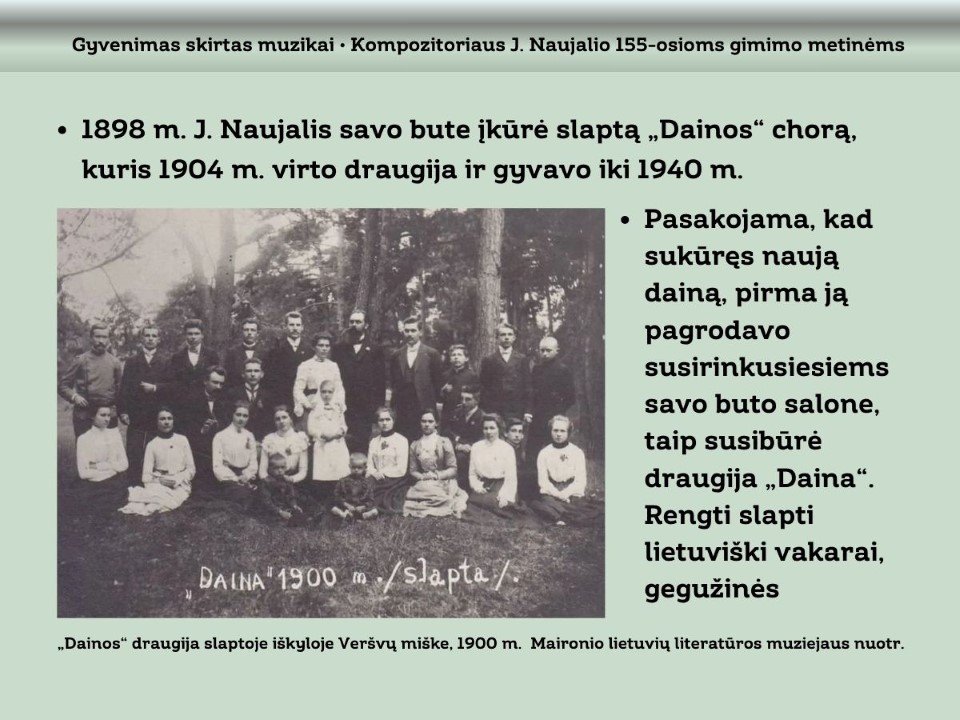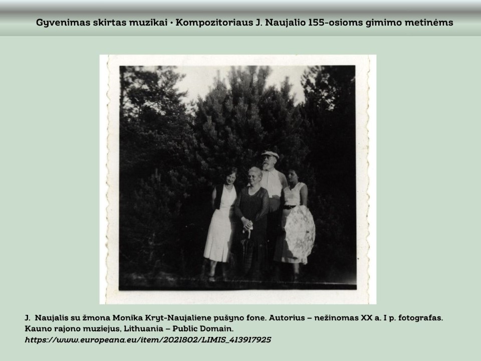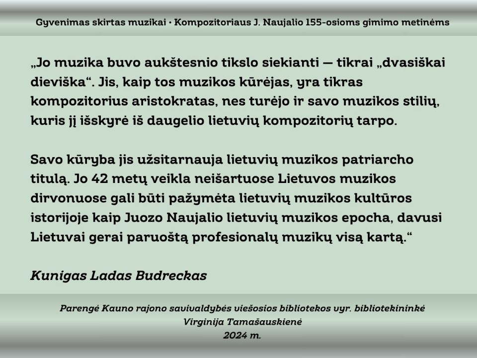 Vyr. bibliotekininkės Virginijos Tamašauskienės parengtoje virtualioje parodoje „Gyvenimas skirtas muzikai“ pasakojama ne tik apie muziką. Ar žinote, kad Juozas Naujalis su būsima žmona susižadėjo prieš tėvų valią? Galite patikėti – vaikinui tuo metu buvo 19 metų, o jo išrinktajai – 15! Šie ir kiti faktai – Jūsų dėmesiui bibliotekos parengtoje parodoje. Gerų įspūdžių!
