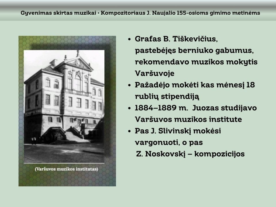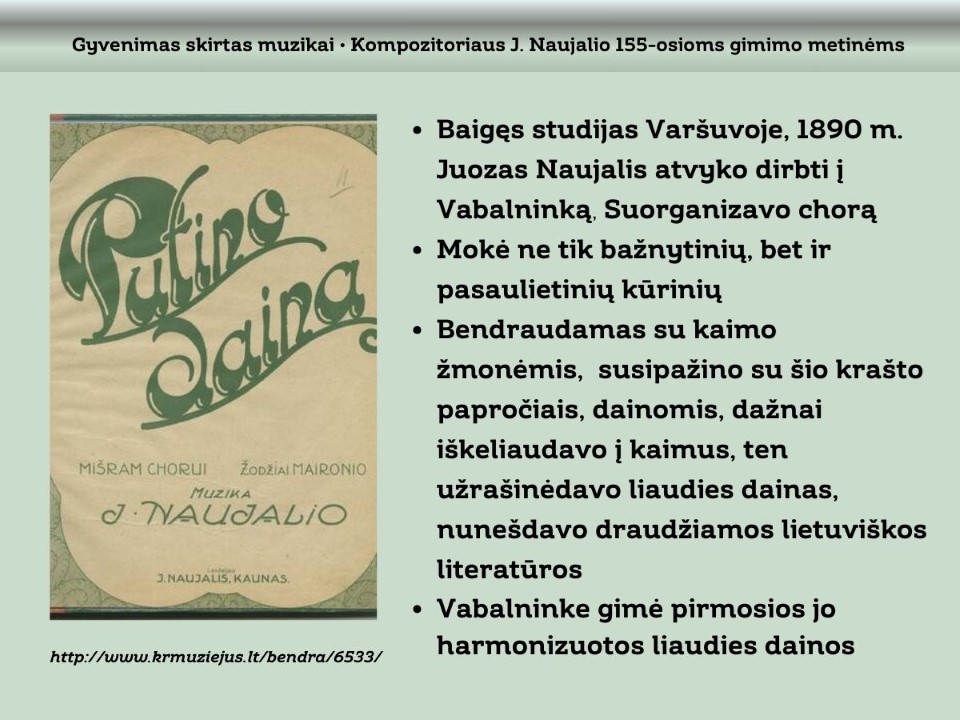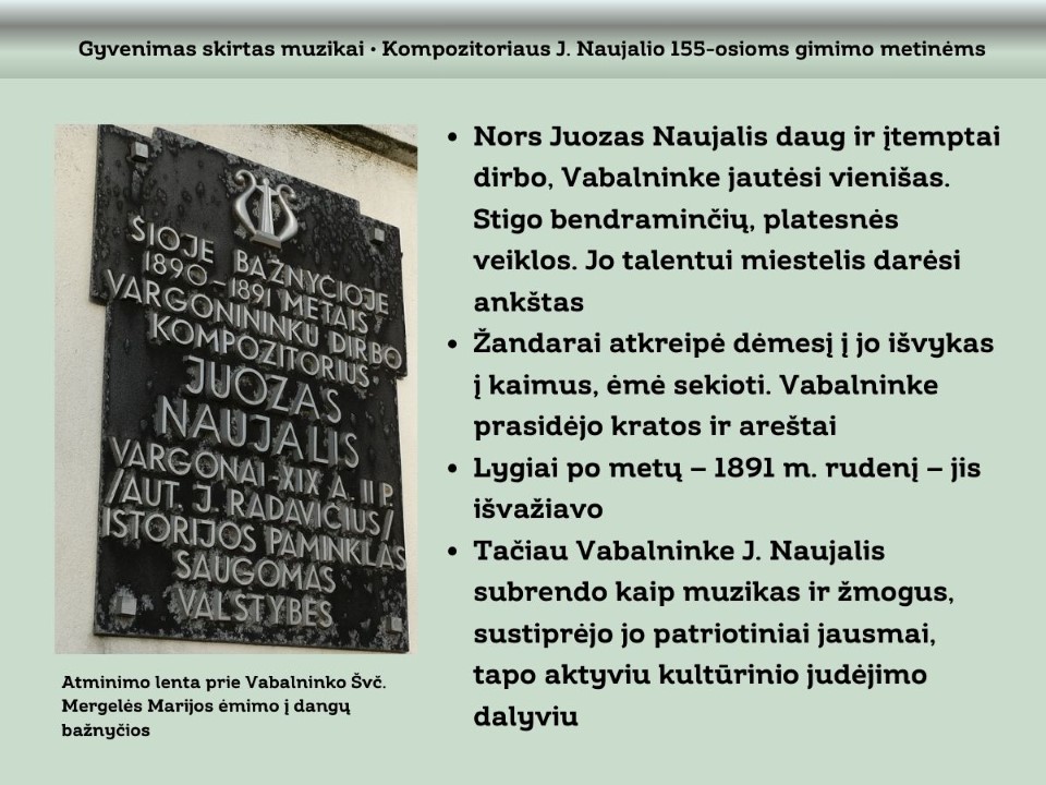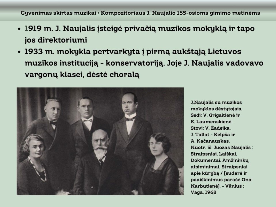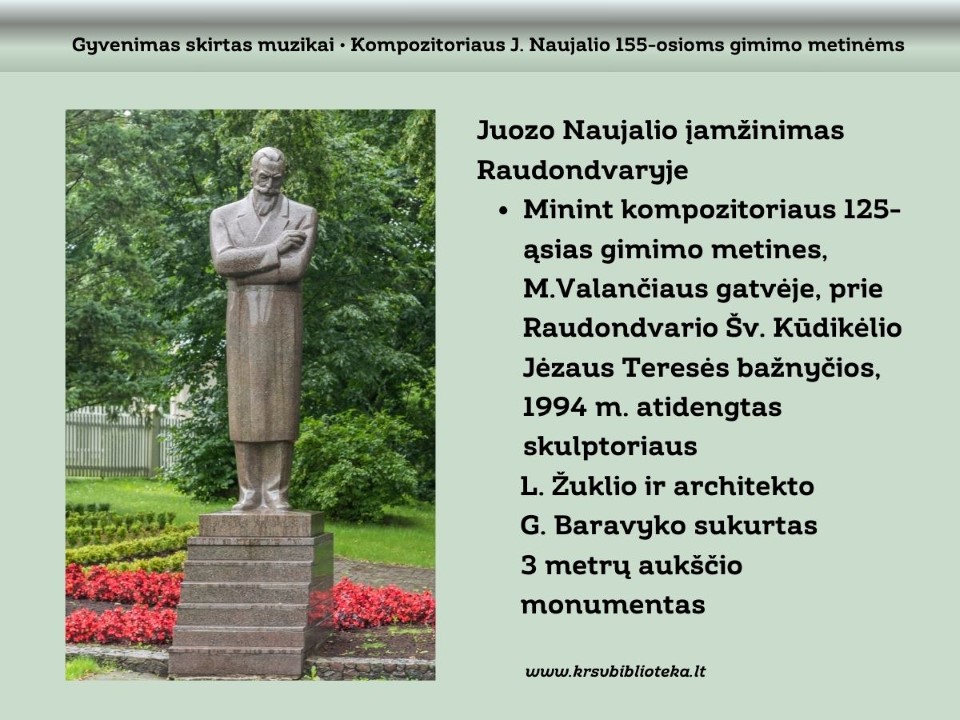 Vyr. bibliotekininkės Virginijos Tamašauskienės parengtoje virtualioje parodoje „Gyvenimas skirtas muzikai“ pasakojama ne tik apie muziką. Ar žinote, kad Juozas Naujalis su būsima žmona susižadėjo prieš tėvų valią? Galite patikėti – vaikinui tuo metu buvo 19 metų, o jo išrinktajai – 15! Šie ir kiti faktai – Jūsų dėmesiui bibliotekos parengtoje parodoje. Gerų įspūdžių!