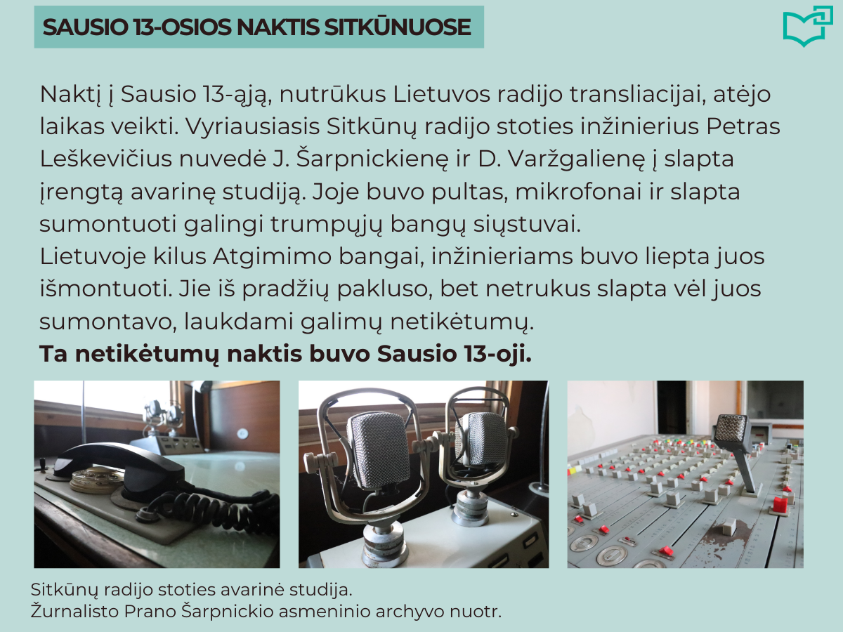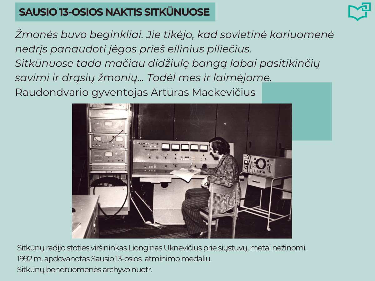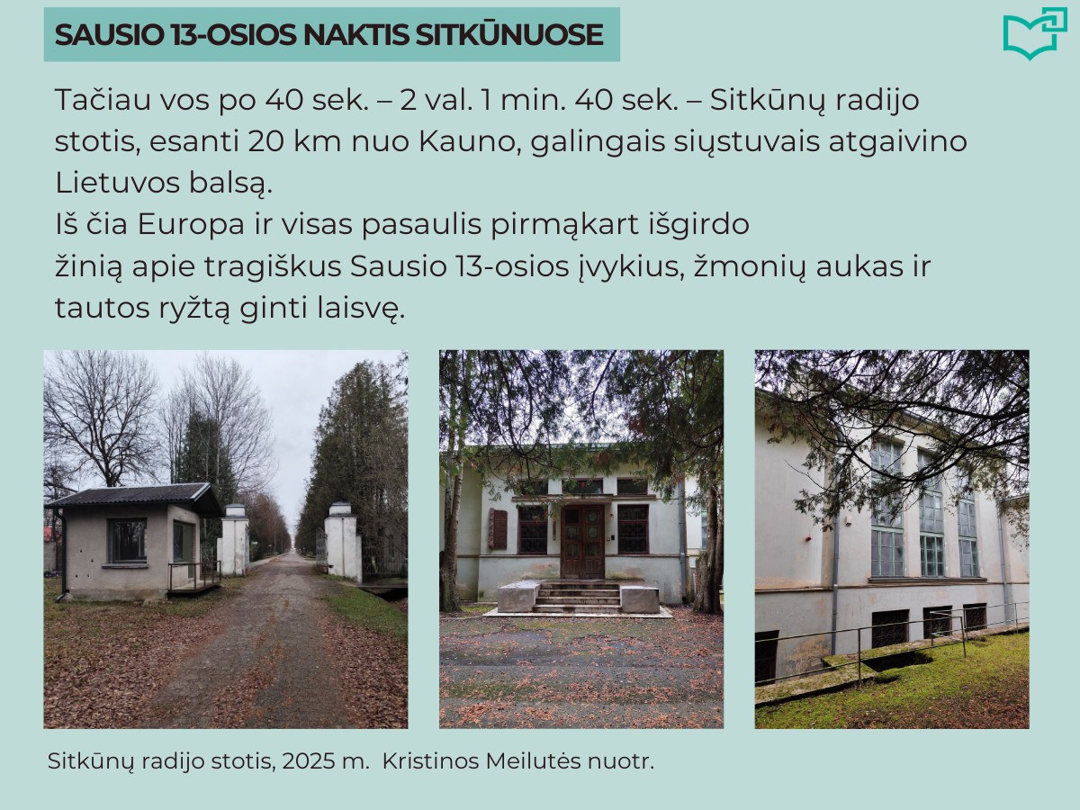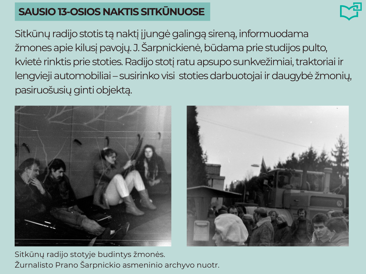 Kviečiame apsilankyti virtualioje parodoje, skirtoje 1991 m. Sausio 13-osios įvykiams Sitkūnuose atminti, lemtingosios Sausio 13-osios nakties 35-osioms metinėms ir Laisvės gynėjų dienai pažymėti. Tai svarbi proga prisiminti dramatiškus įvykius, kai Sitkūnų radijo stotis tapo laisvės balsu ir pirmoji pranešė pasauliui apie tragiškus įvykius Lietuvoje.