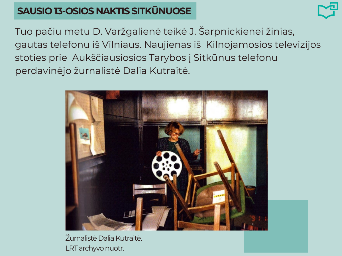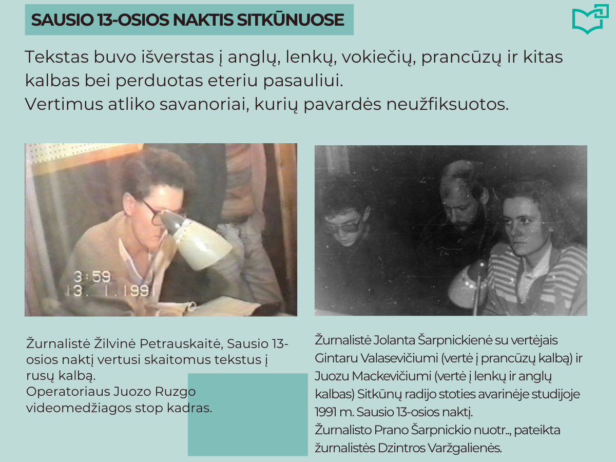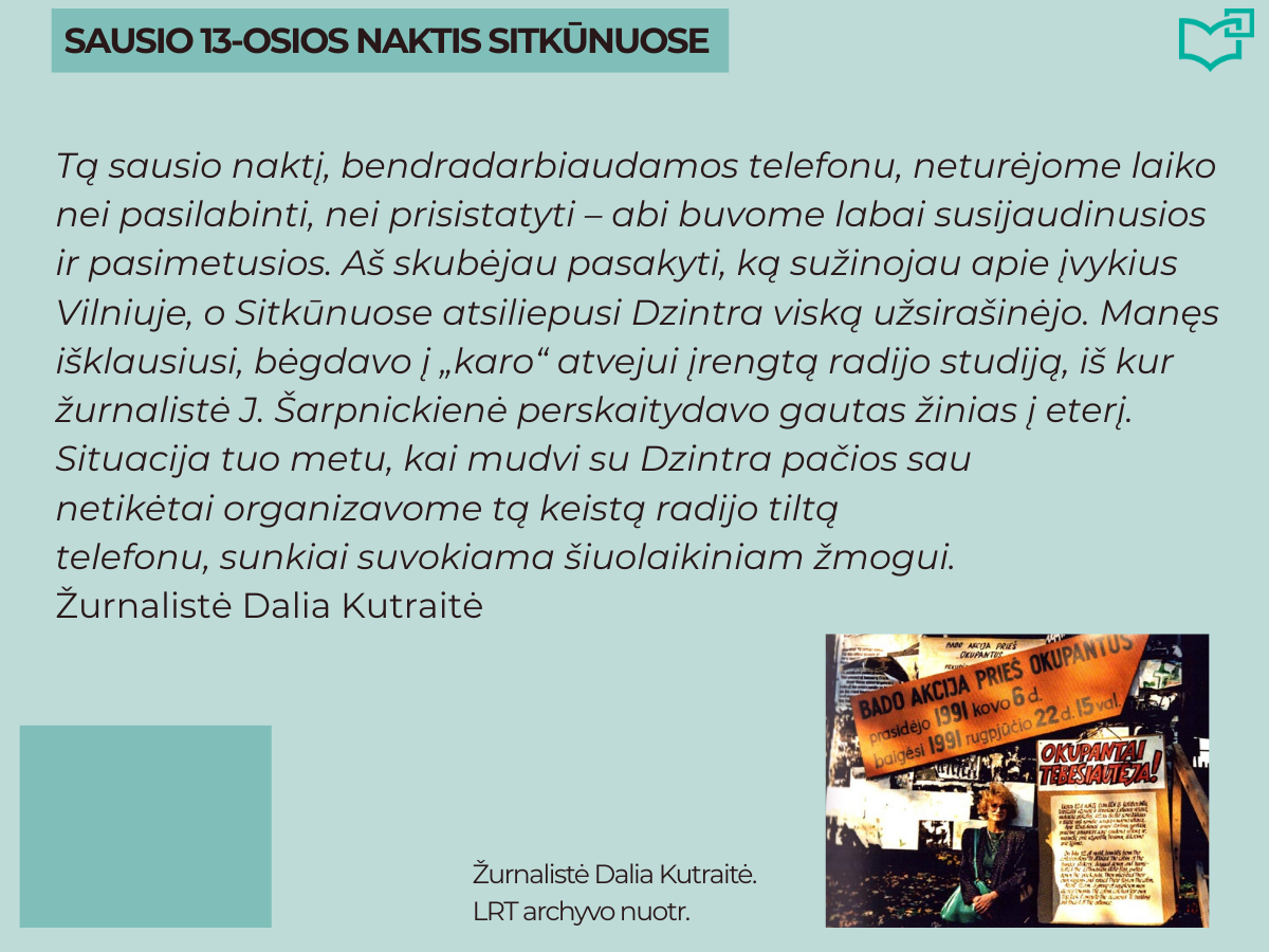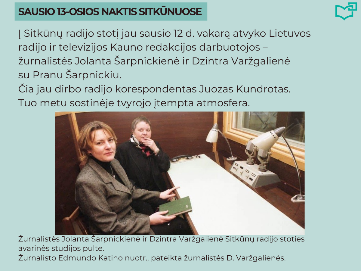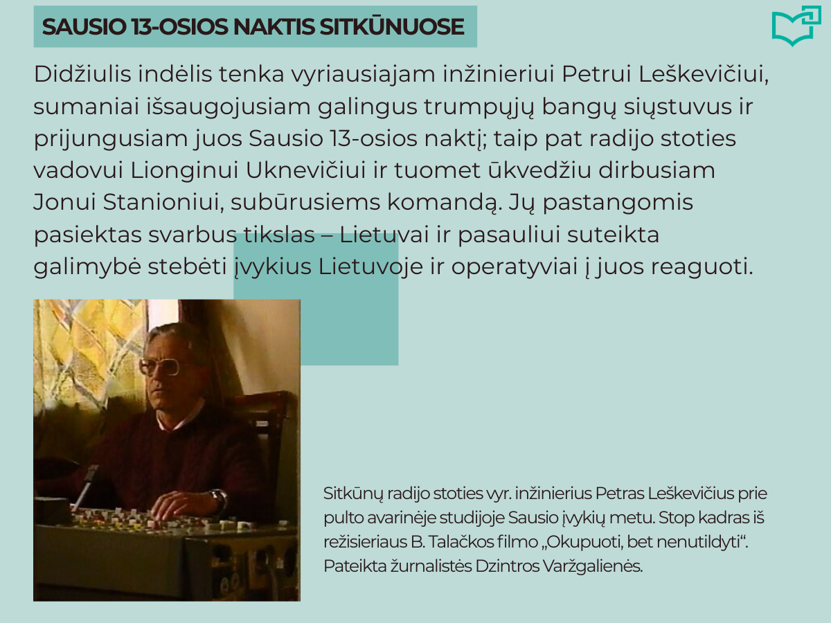 Kviečiame apsilankyti virtualioje parodoje, skirtoje 1991 m. Sausio 13-osios įvykiams Sitkūnuose atminti, lemtingosios Sausio 13-osios nakties 35-osioms metinėms ir Laisvės gynėjų dienai pažymėti. Tai svarbi proga prisiminti dramatiškus įvykius, kai Sitkūnų radijo stotis tapo laisvės balsu ir pirmoji pranešė pasauliui apie tragiškus įvykius Lietuvoje.