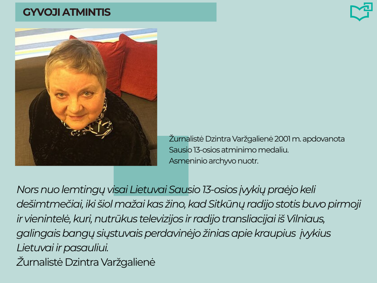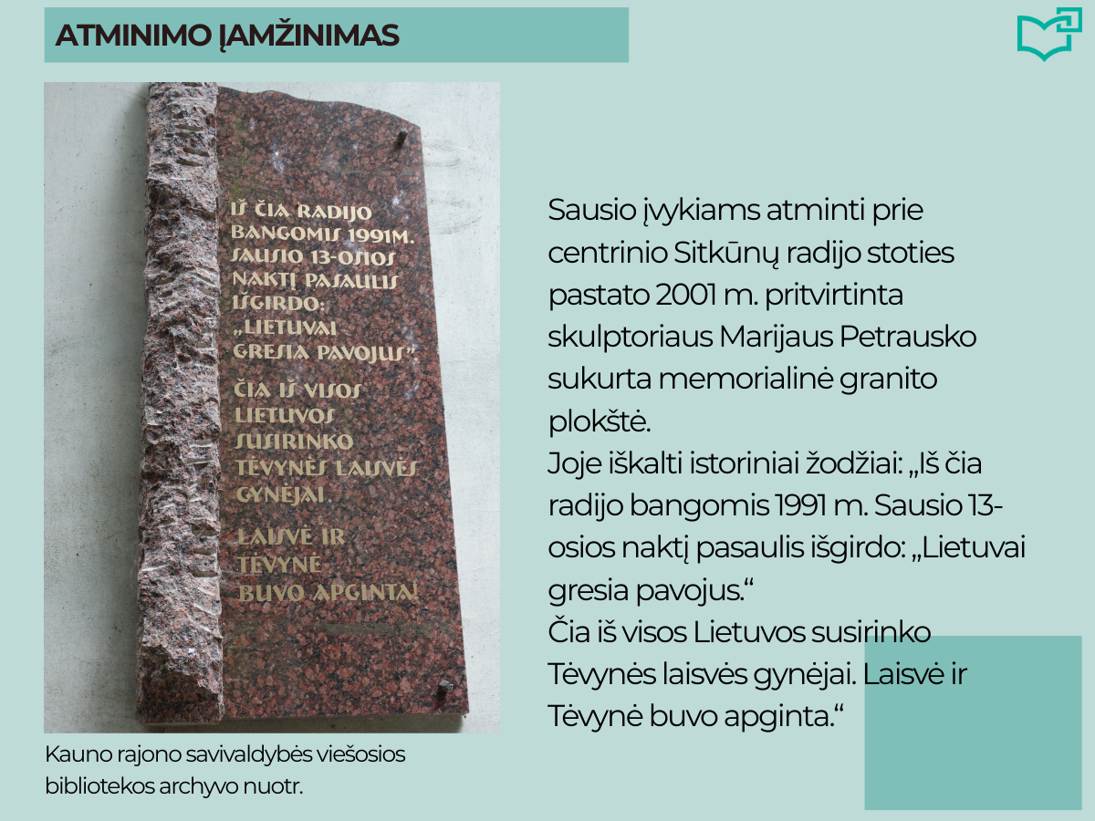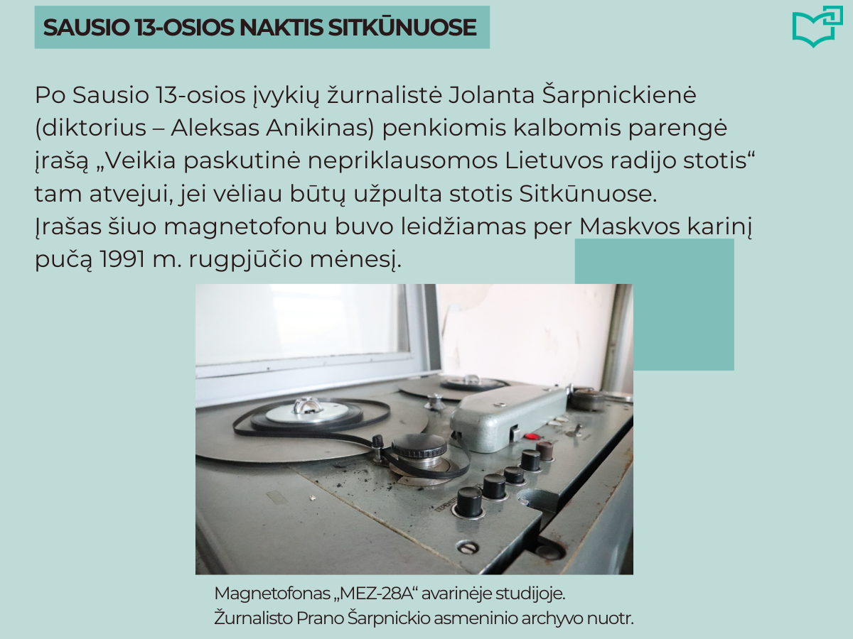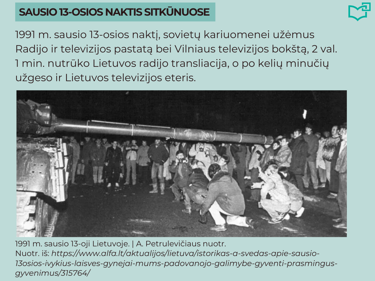 Kviečiame apsilankyti virtualioje parodoje, skirtoje 1991 m. Sausio 13-osios įvykiams Sitkūnuose atminti, lemtingosios Sausio 13-osios nakties 35-osioms metinėms ir Laisvės gynėjų dienai pažymėti. Tai svarbi proga prisiminti dramatiškus įvykius, kai Sitkūnų radijo stotis tapo laisvės balsu ir pirmoji pranešė pasauliui apie tragiškus įvykius Lietuvoje.
