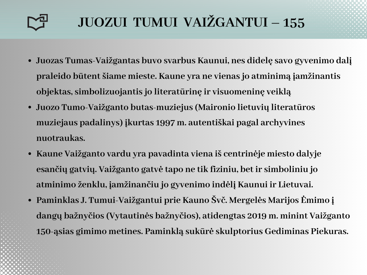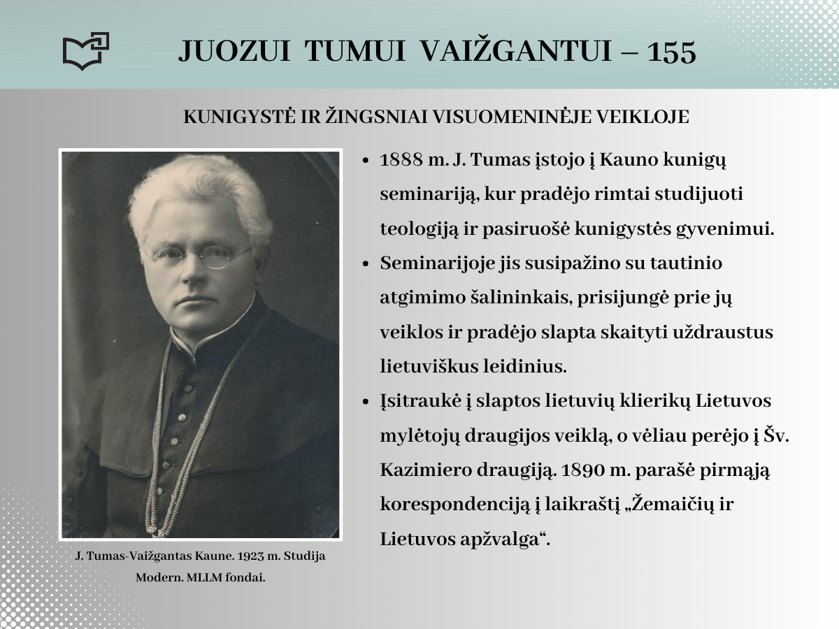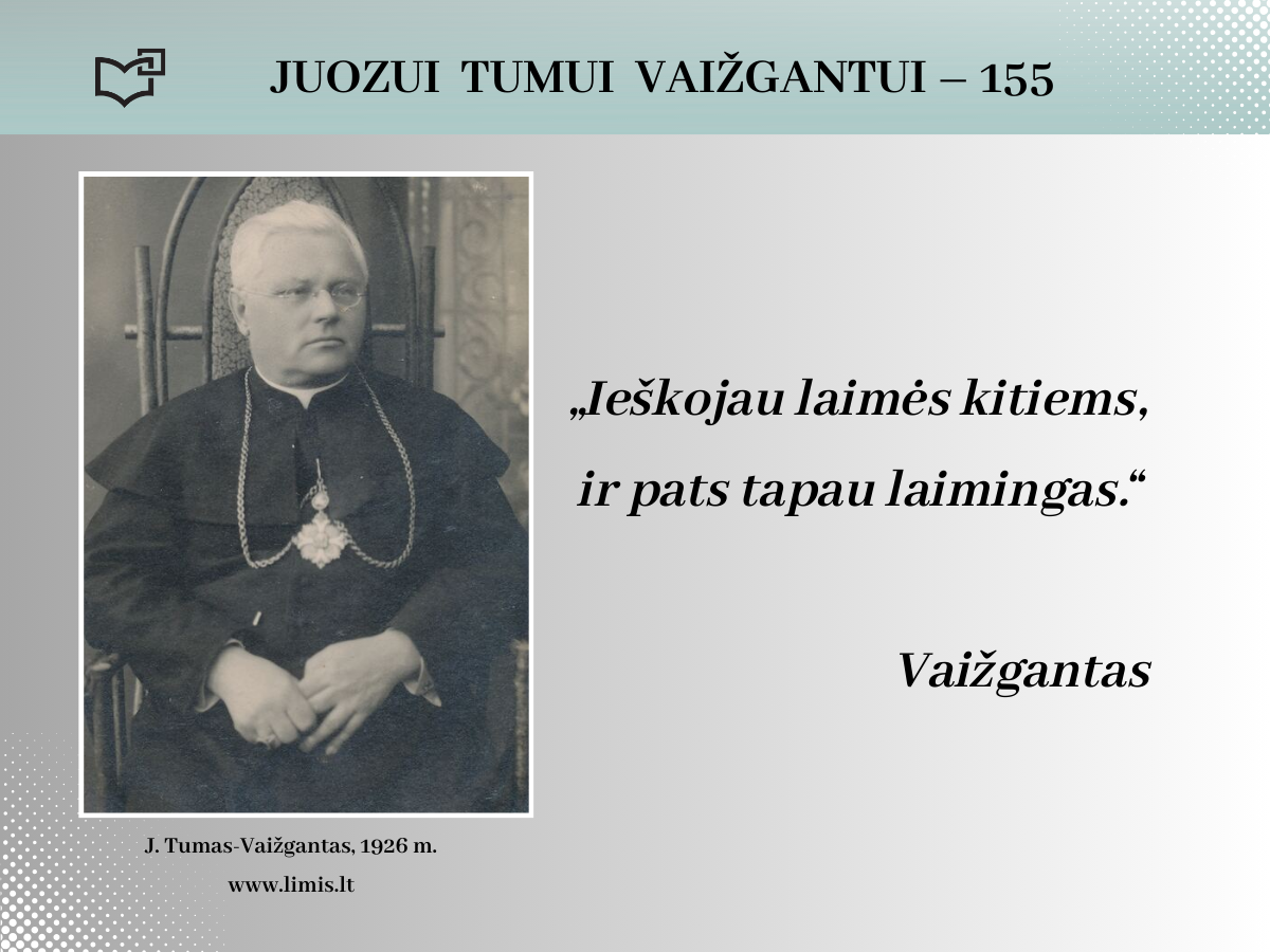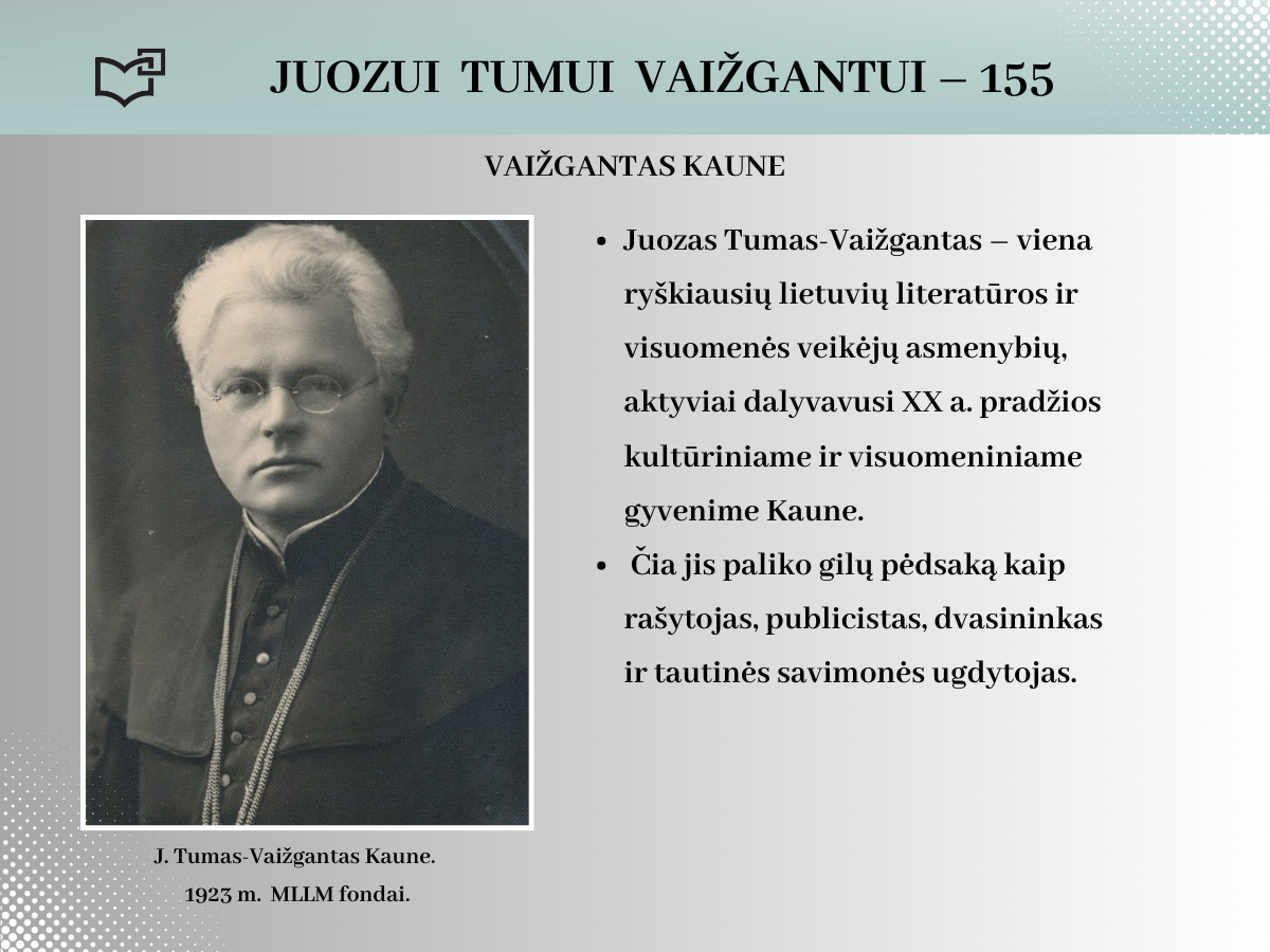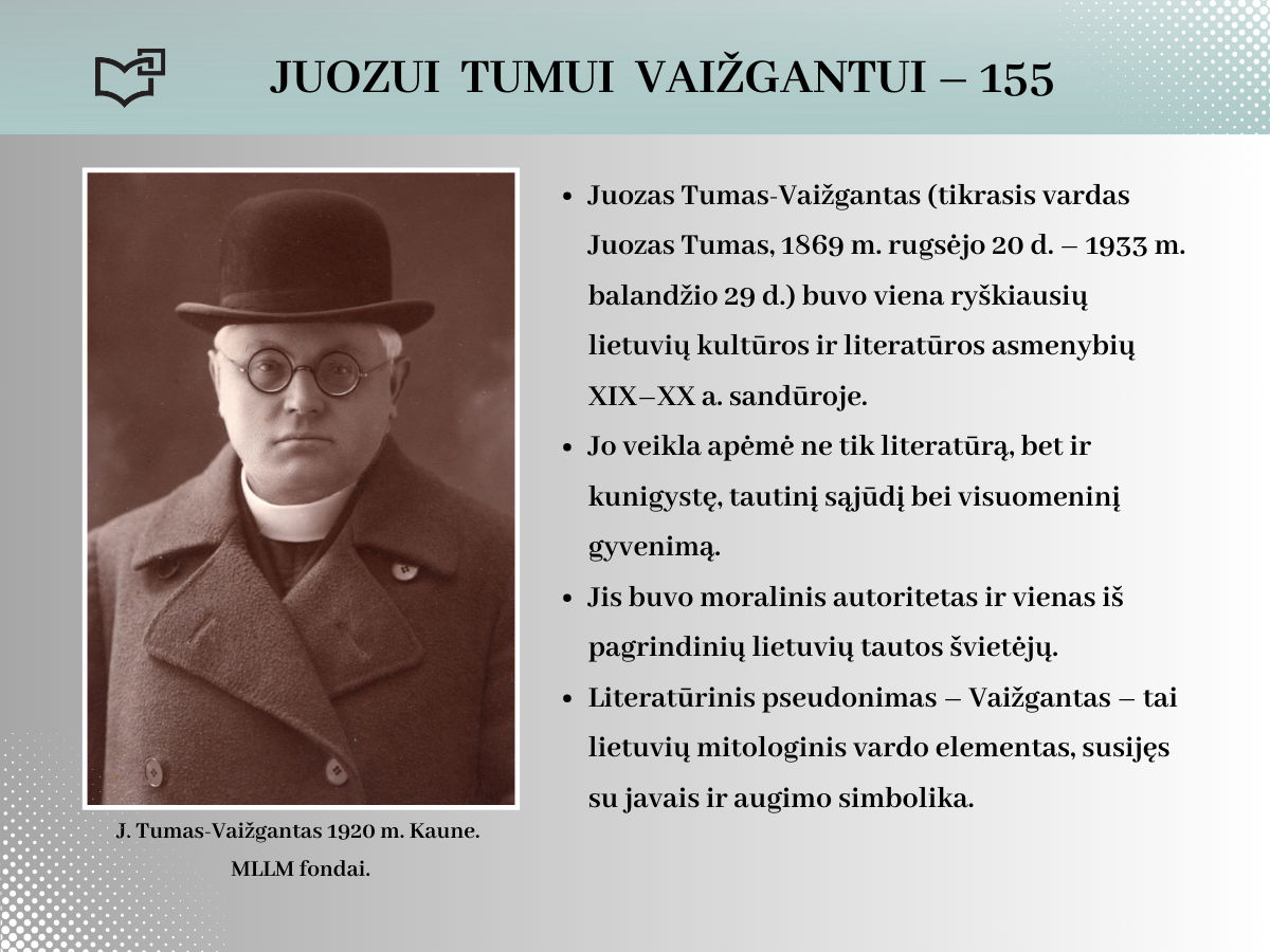 2024 rugsėjo 20-ąją Juozui Tumui-Vaižgantui būtų suėję 155 metai! Spalvinga asmenybė, palikusi ryškių pėdsakų Kaune, kviečia susipažinti – Jums telieka atsiversti bibliotekos parengtą virtualią parodą.