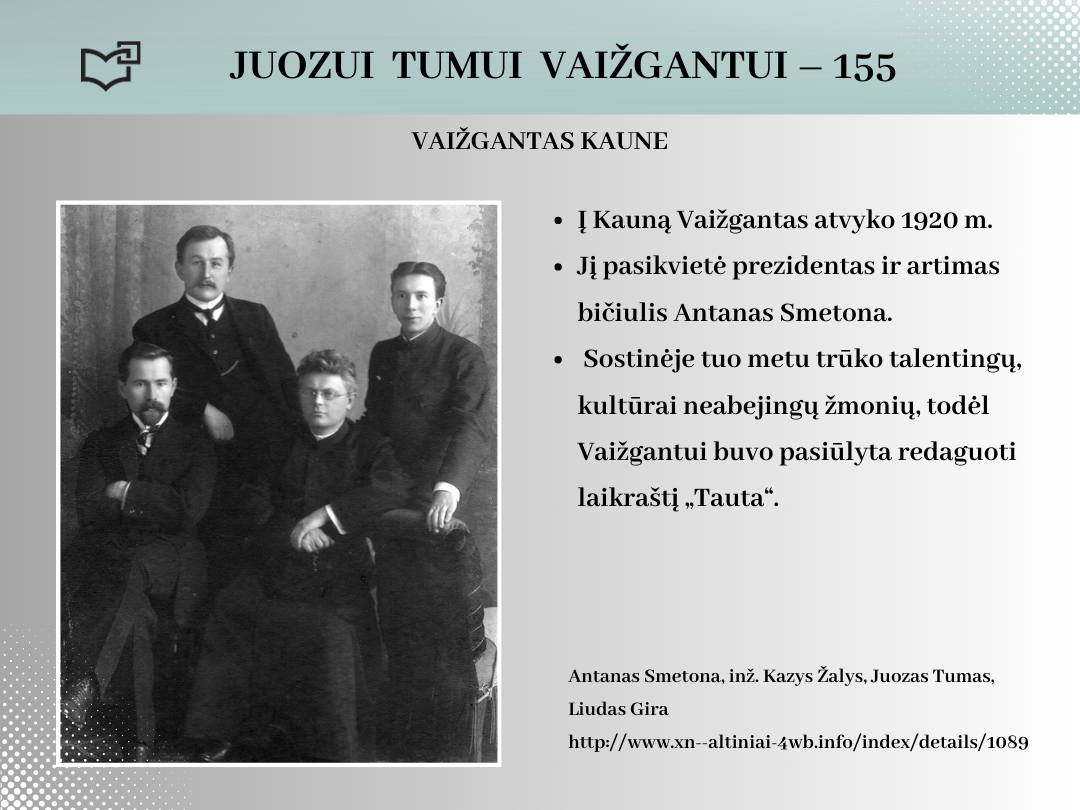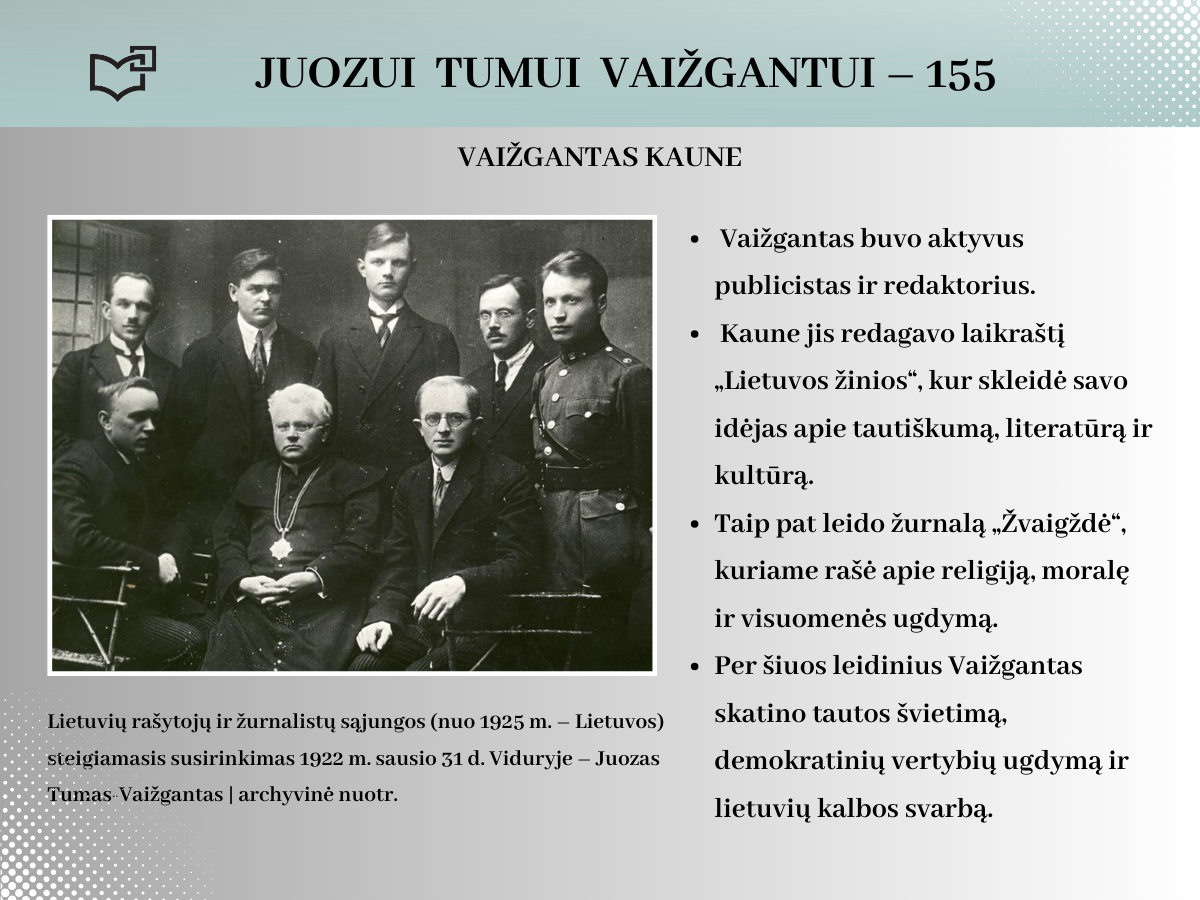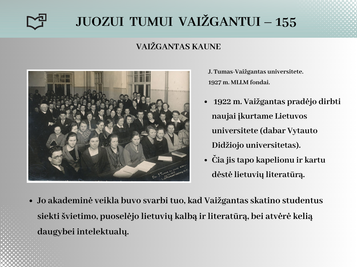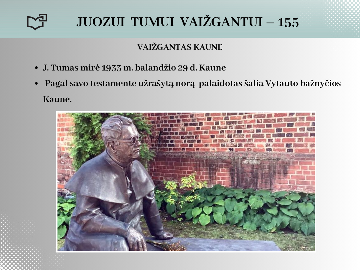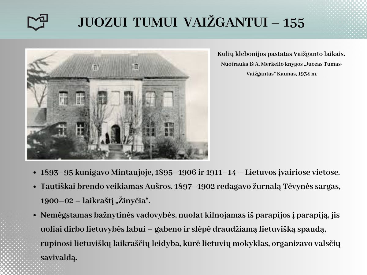2024 rugsėjo 20-ąją Juozui Tumui-Vaižgantui būtų suėję 155 metai! Spalvinga asmenybė, palikusi ryškių pėdsakų Kaune, kviečia susipažinti – Jums telieka atsiversti bibliotekos parengtą virtualią parodą.