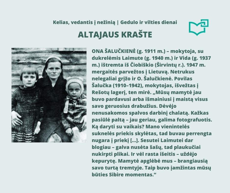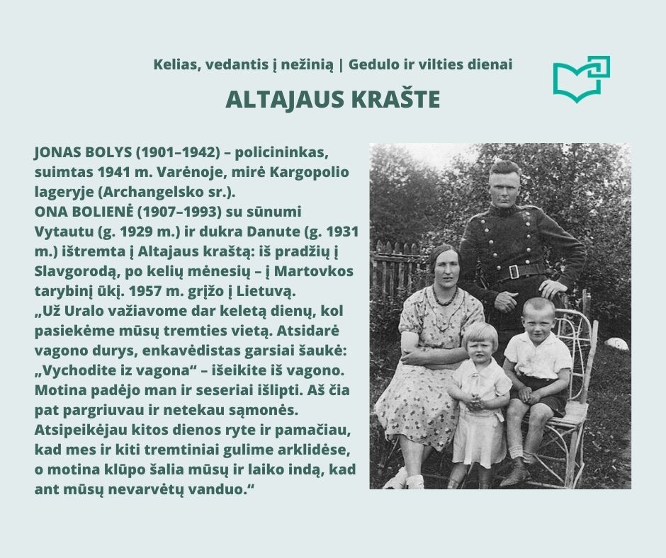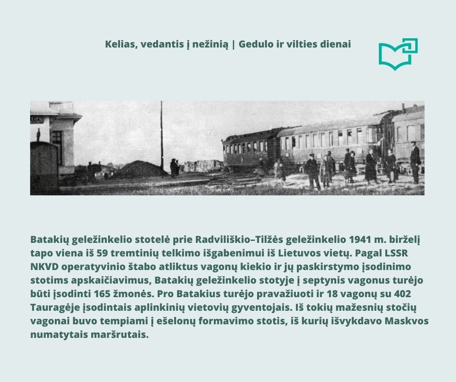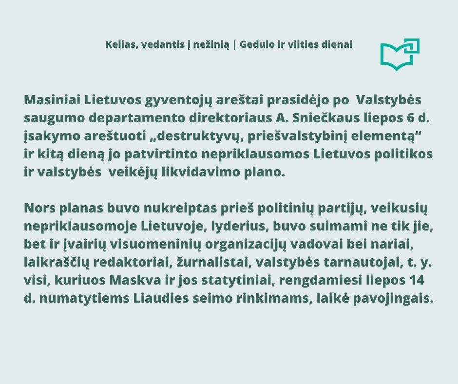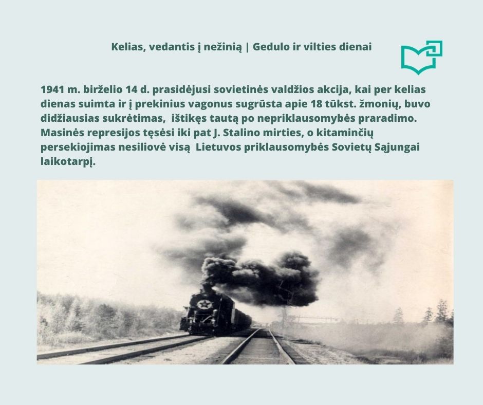 Kauno rajono savivaldybės viešoji biblioteka pristato Gedulo ir vilties dienai skirtą virtualią parodą „Kelias, vedantis į nežinią“ (parengė vyr. bibliotekininkė Virginija Tamašauskienė), pasakojančią apie prievarta iš Tėvynės išvežtus žmones, jų kovą, kilnią dvasią, sunkių išbandymų akivaizdoje puoselėtą tautiškumą.