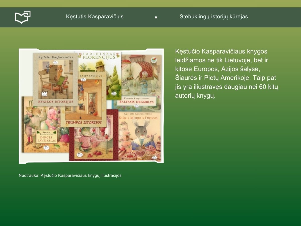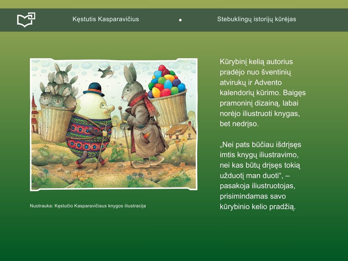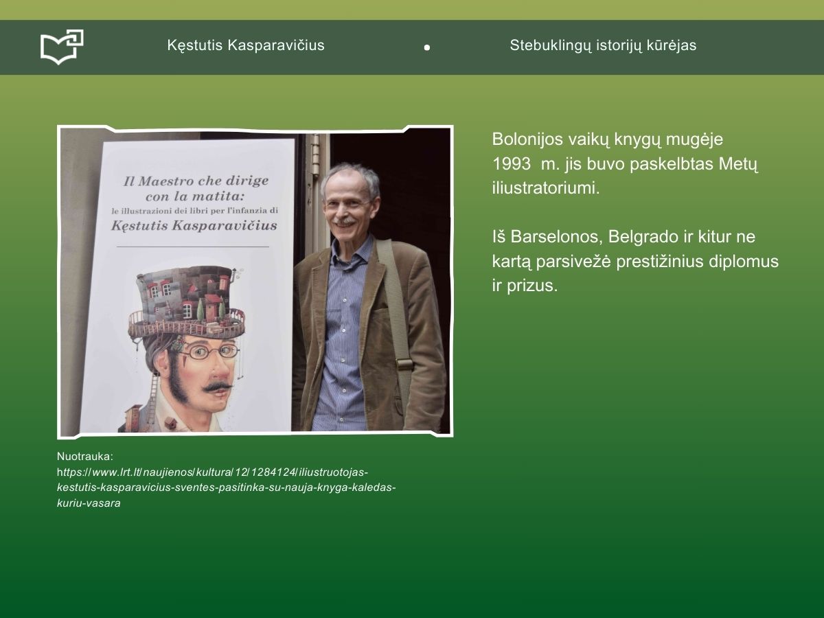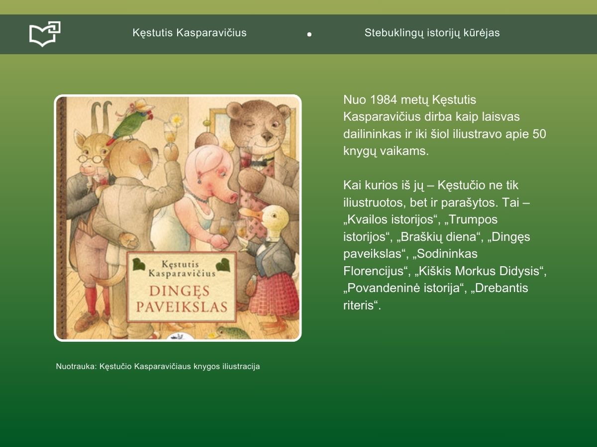 Virtuali paroda „Kęstutis Kasparavičius – stebuklingų istorijų kūrėjas“ yra skirta vaikiškų knygų autoriaus 70-ies metų sukakčiai pažymėti. Kęstutis Kasparavičius knygas vaikams ir rašo, ir iliustruoja. Šiuo metu jau yra iliustravęs apie 50 knygų vaikams. Daug jų galite rasti mūsų bibliotekoje (kreipkitės į bibliotekos Vaikų centro bibliotekininką). Kviečiame skaityti!