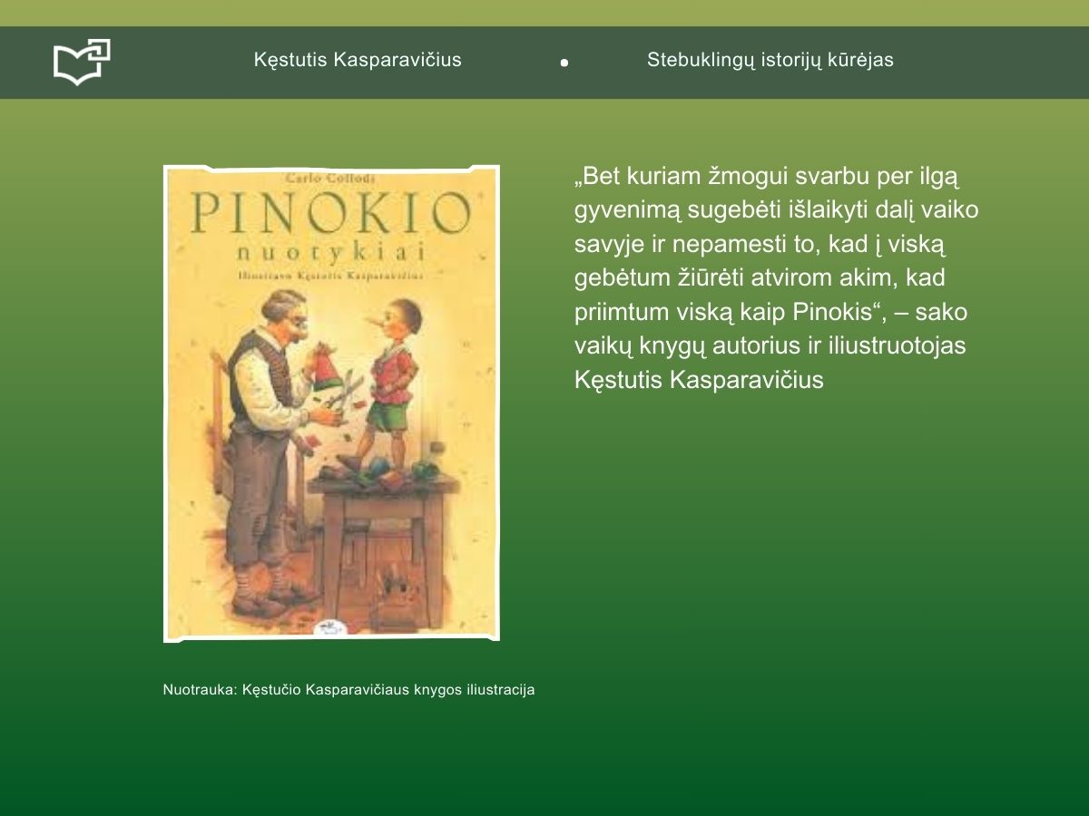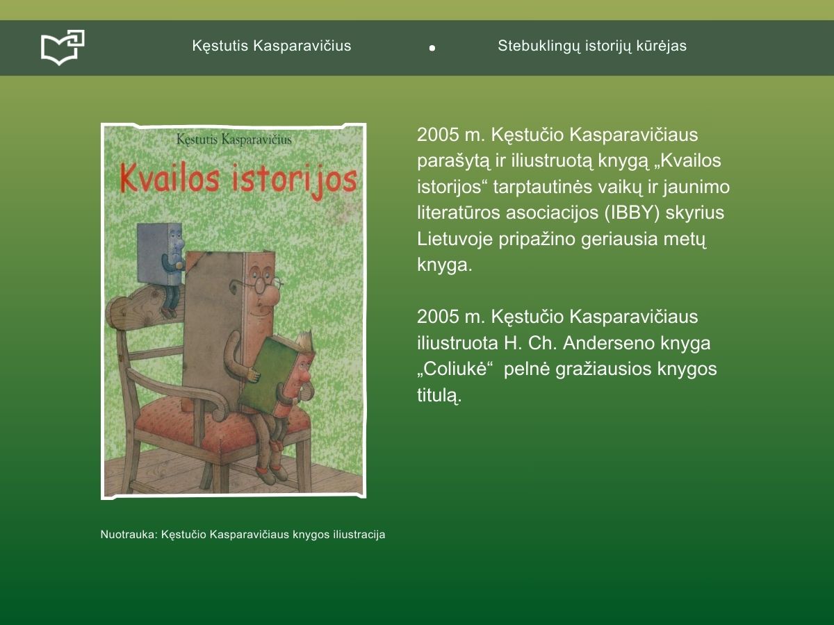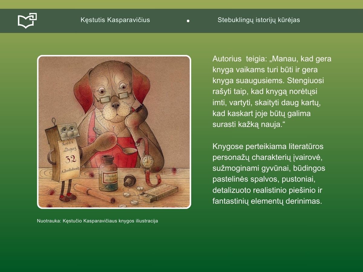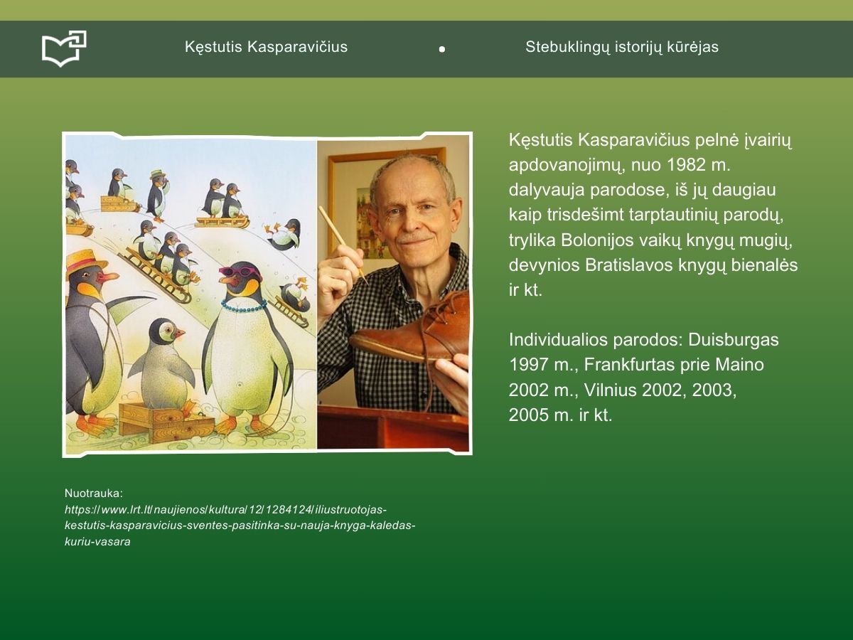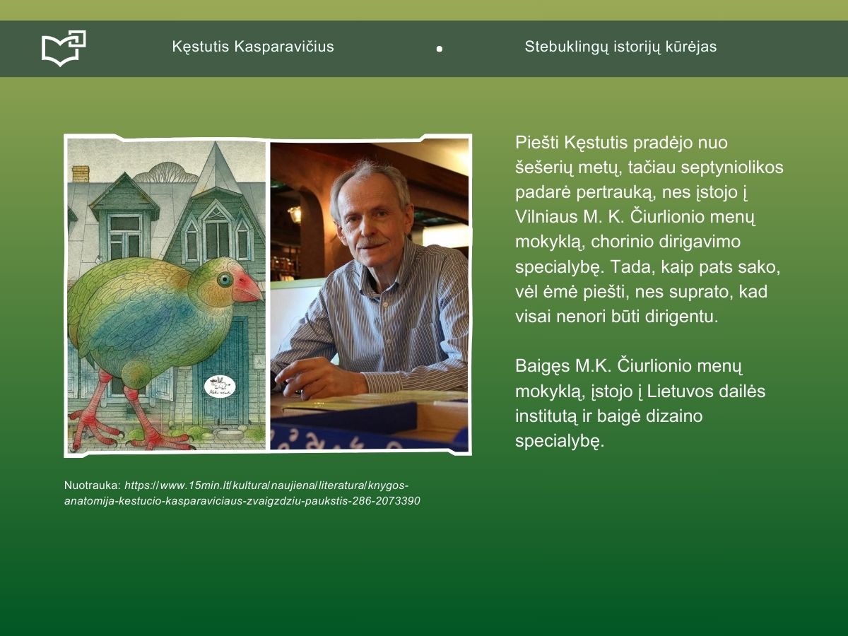 Virtuali paroda „Kęstutis Kasparavičius – stebuklingų istorijų kūrėjas“ yra skirta vaikiškų knygų autoriaus 70-ies metų sukakčiai pažymėti. Kęstutis Kasparavičius knygas vaikams ir rašo, ir iliustruoja. Šiuo metu jau yra iliustravęs apie 50 knygų vaikams. Daug jų galite rasti mūsų bibliotekoje (kreipkitės į bibliotekos Vaikų centro bibliotekininką). Kviečiame skaityti!
