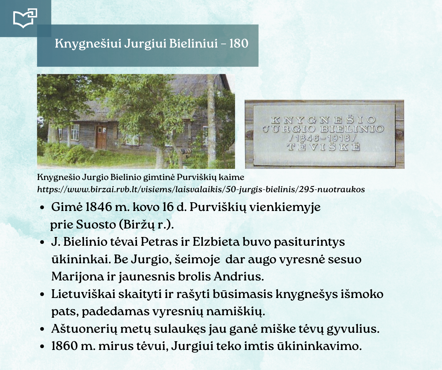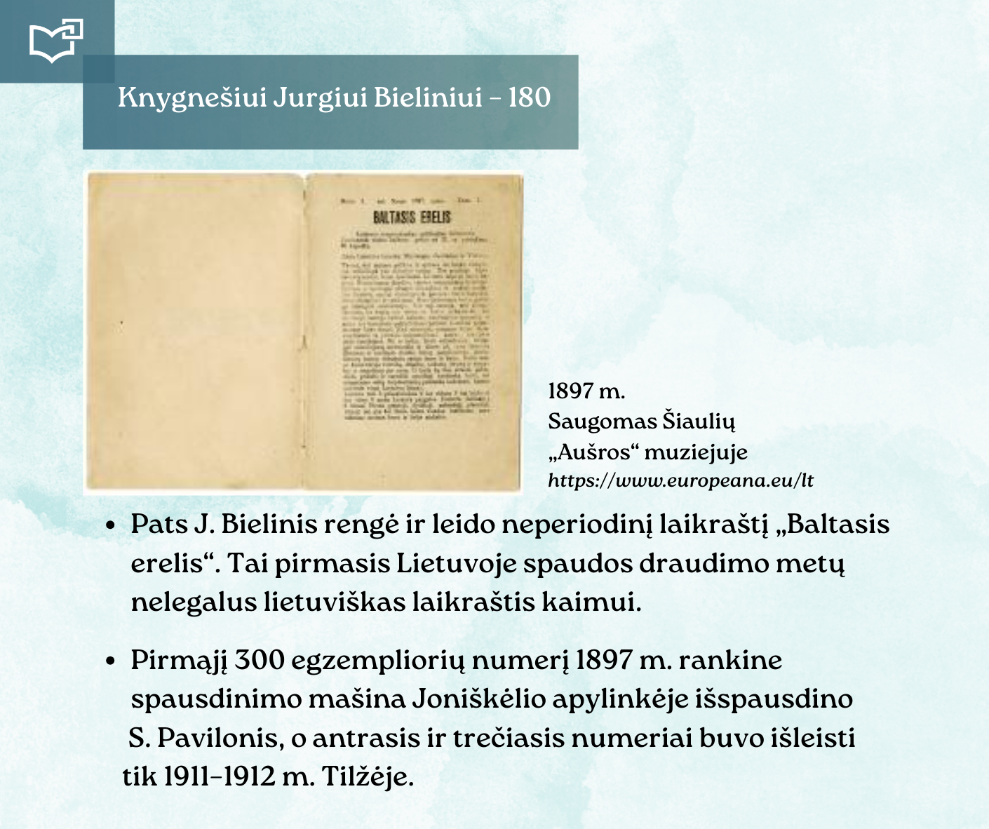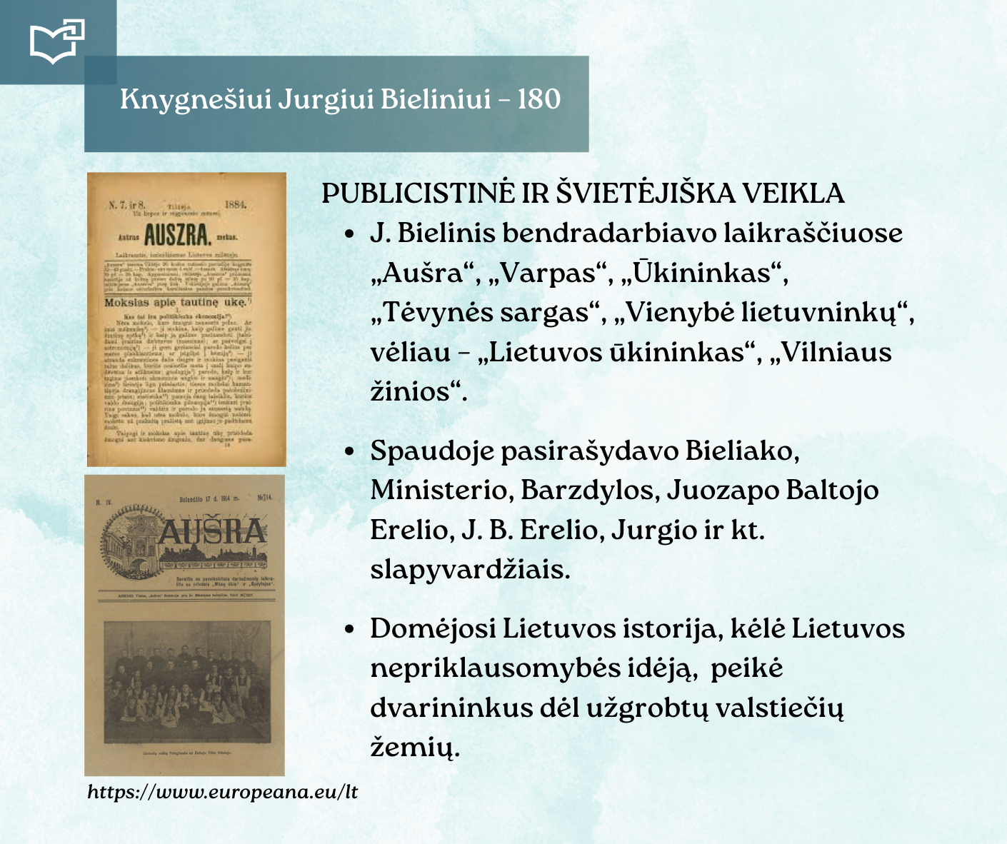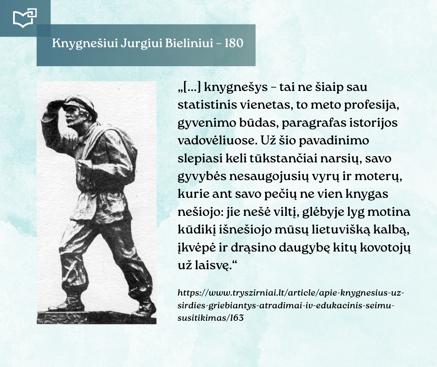 Kovo 16-osios – Knygnešio dienos – ir 180-ųjų Jurgio Bielinio gimimo metinių proga kviečiame Jus susipažinti su nauja virtualia paroda, skirta vienam ryškiausių lietuviško žodžio gynėjų. Kauno rajono savivaldybės viešosios bibliotekos vyr. bibliotekininkė Virginija Tamašauskienė parengė išsamią ekspoziciją, atskleidžiančią J. Bielinio nuopelnus knygnešystei, jo indėlį į tautinio sąmoningumo žadinimą ir kovą už lietuvišką žodį spaudos draudimo metais. Jurgis Bielinis – tai ne tik knygnešys, bet ir švietėjas, organizatorius, drąsuolis, kuriam lietuviškų knygų platinimas tapo gyvenimo misija. Jo veikla įkvėpė šimtus ir padėjo išsaugoti lietuvybę tamsiausiomis tautos istorijos valandomis.