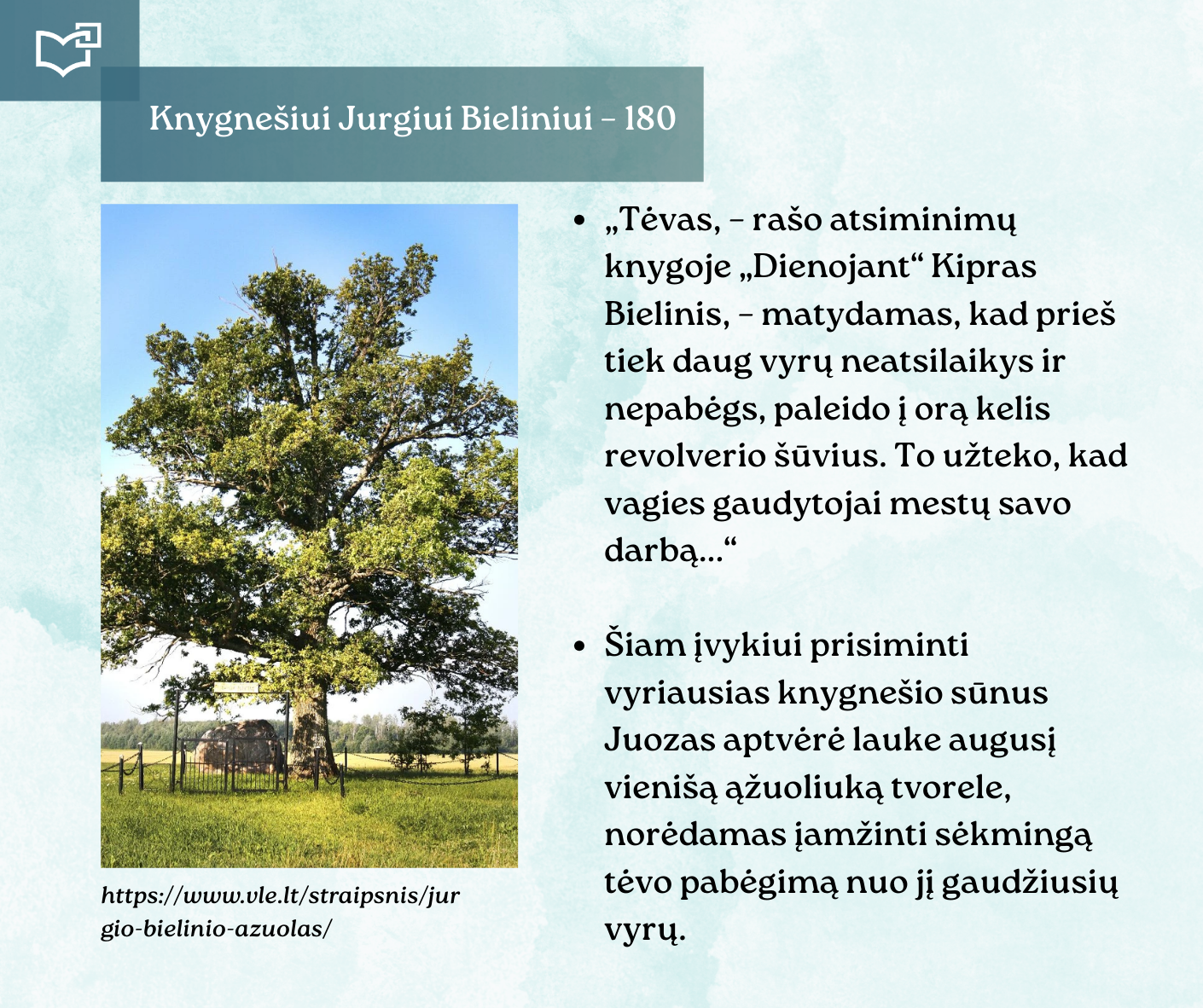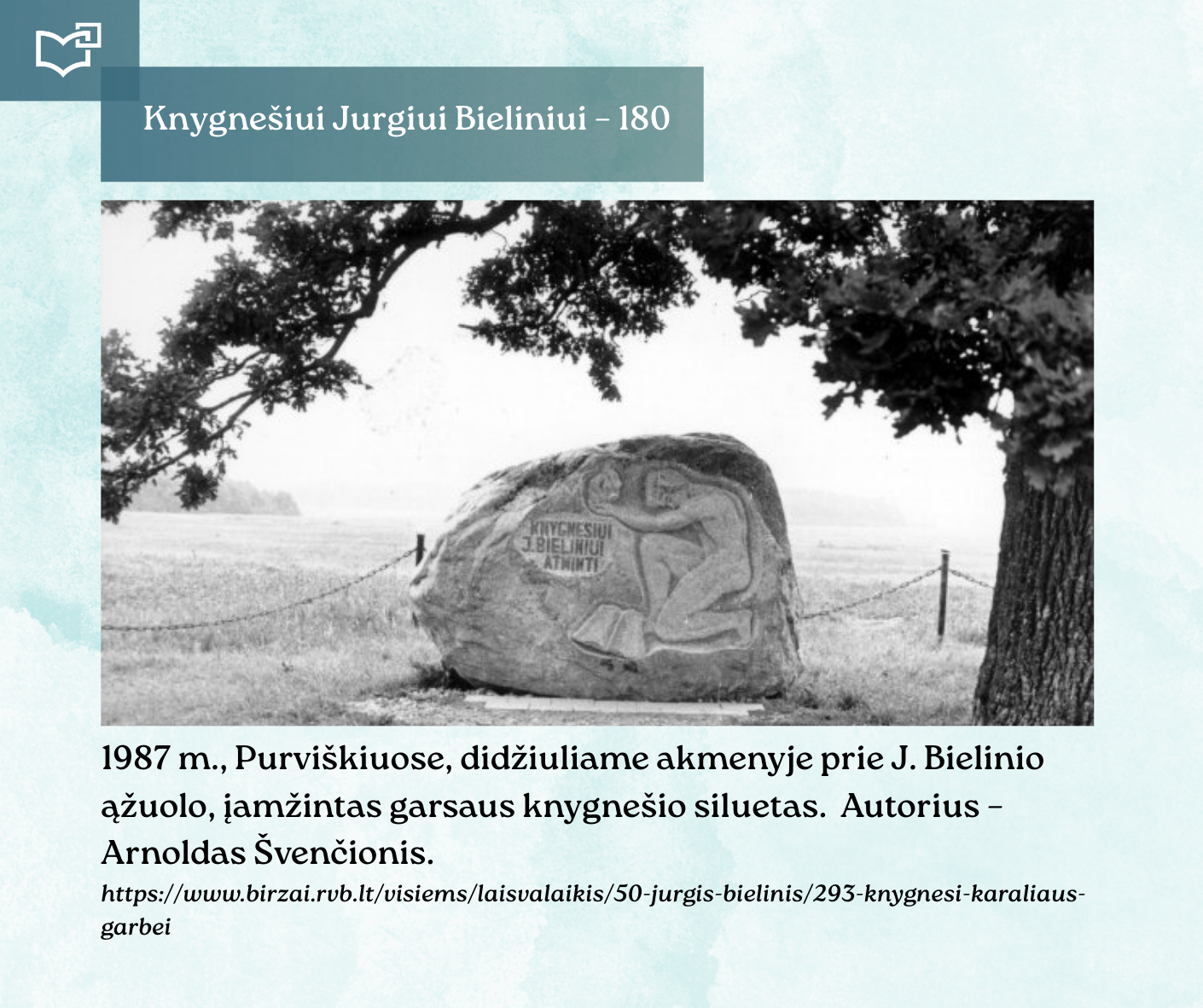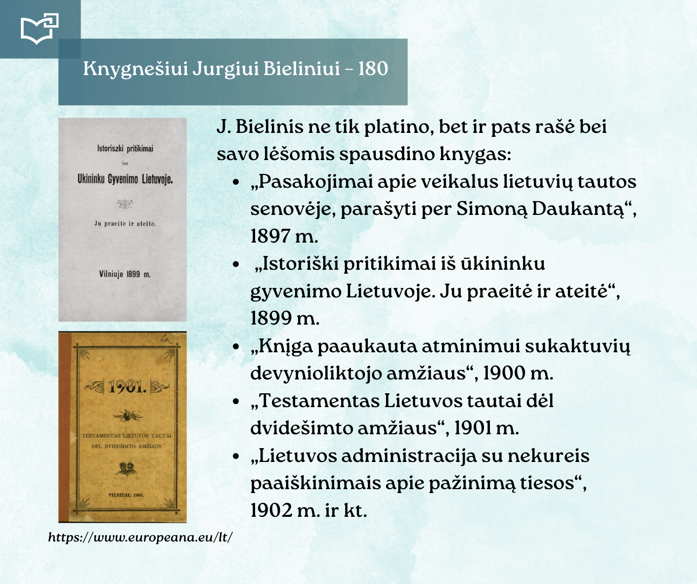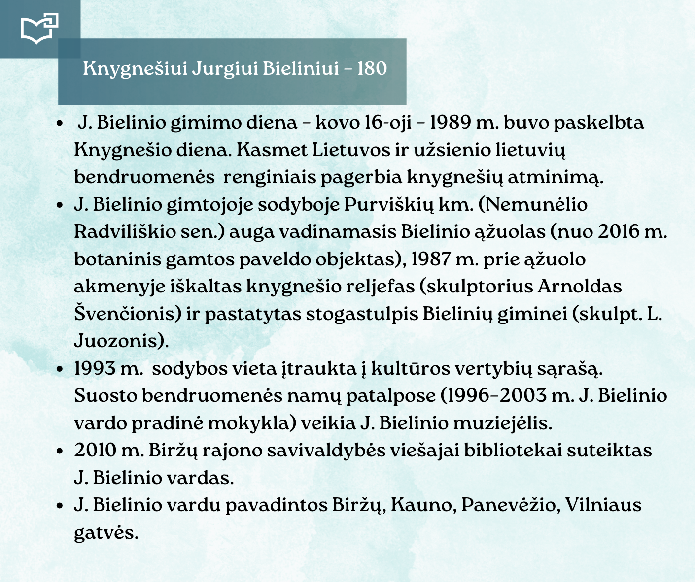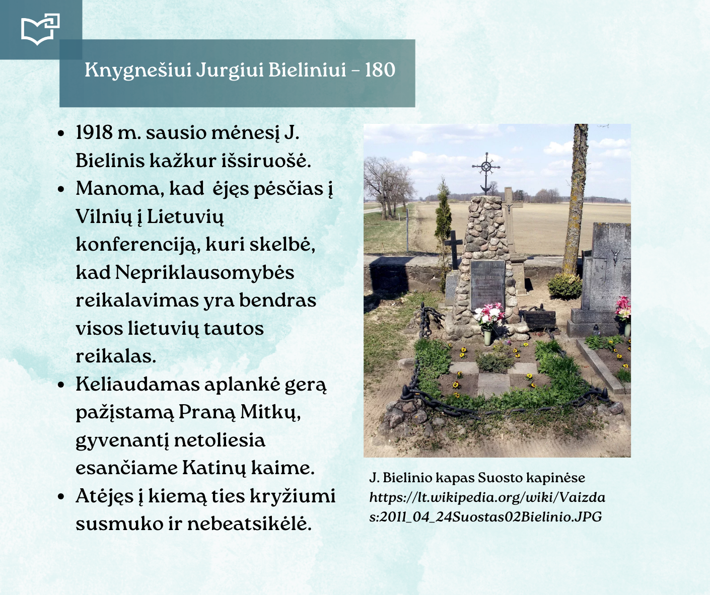 Kovo 16-osios – Knygnešio dienos – ir 180-ųjų Jurgio Bielinio gimimo metinių proga kviečiame Jus susipažinti su nauja virtualia paroda, skirta vienam ryškiausių lietuviško žodžio gynėjų. Kauno rajono savivaldybės viešosios bibliotekos vyr. bibliotekininkė Virginija Tamašauskienė parengė išsamią ekspoziciją, atskleidžiančią J. Bielinio nuopelnus knygnešystei, jo indėlį į tautinio sąmoningumo žadinimą ir kovą už lietuvišką žodį spaudos draudimo metais. Jurgis Bielinis – tai ne tik knygnešys, bet ir švietėjas, organizatorius, drąsuolis, kuriam lietuviškų knygų platinimas tapo gyvenimo misija. Jo veikla įkvėpė šimtus ir padėjo išsaugoti lietuvybę tamsiausiomis tautos istorijos valandomis.