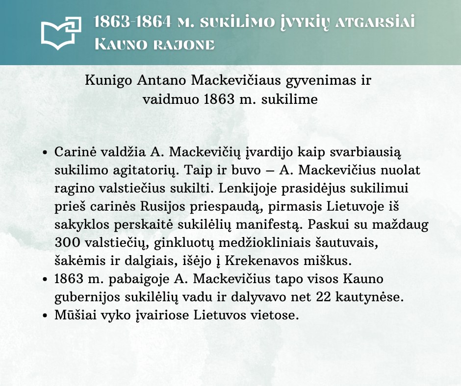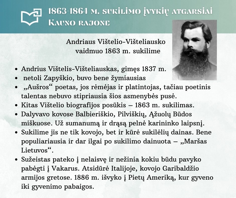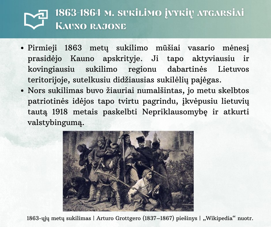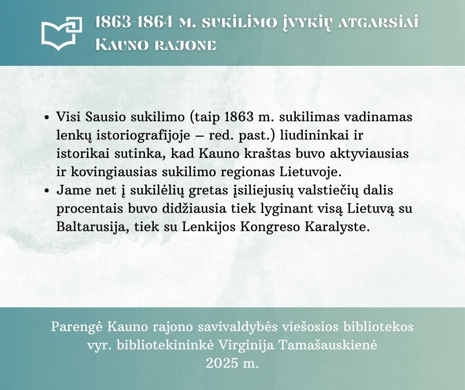 Kviečiame susipažinti su vyr. bibliotekininkės Virginijos Tamašauskienės parengta virtualia paroda „1863–1864 m. sukilimo įvykių atgarsiai Kauno rajone“, atskleidžiančia, jog Kauno kraštas buvo aktyviausias ir kovingiausias sukilimo regionas Lietuvoje.