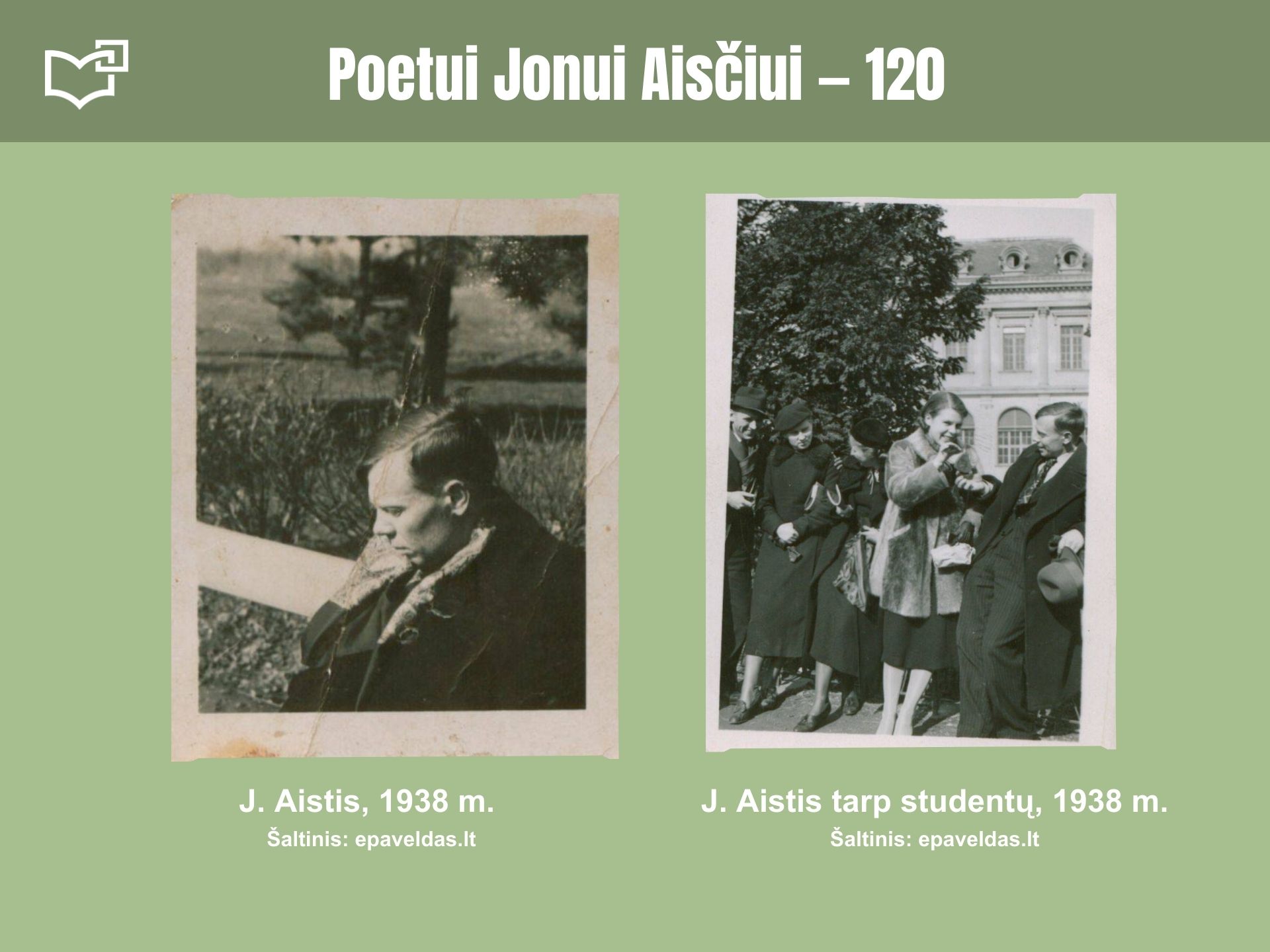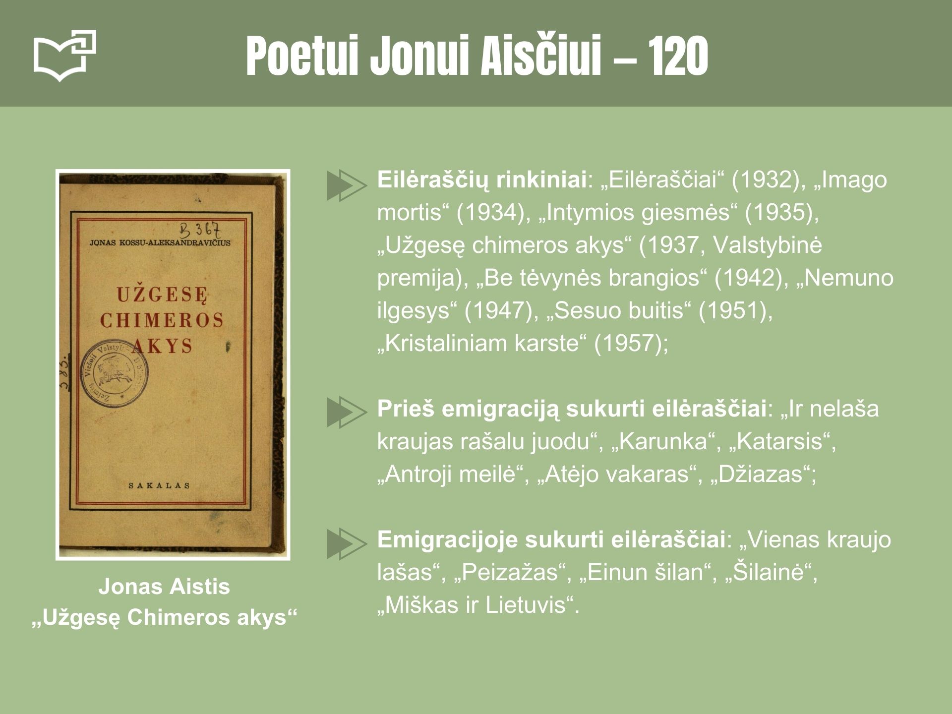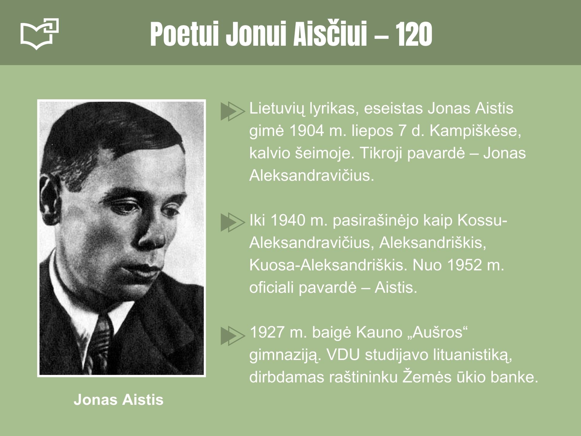 Liepos 7-ąją minėsime lietuvių literatūros klasiko Jono Aisčio 120-ųjų gimimo metinių sukaktį. Kauno rajone (Kampiškėse, netoli Rumšiškių) gimęs vienas žymiausių lietuvių lyrikų stipriai paveikė lietuvių grožinės literatūros raidą. Jo gimimo metinių proga kviečiame peržvelgti šią virtualią parodą.