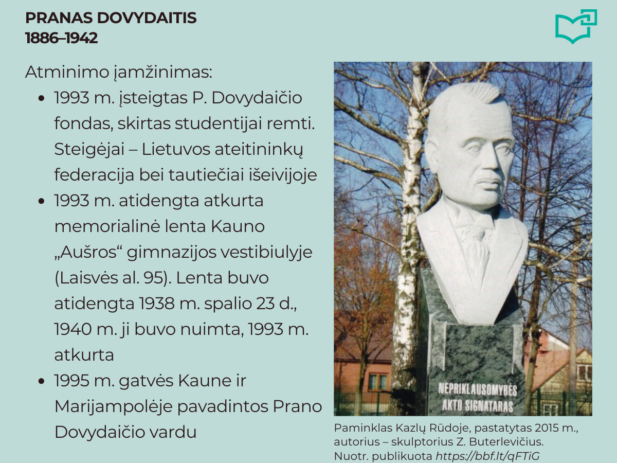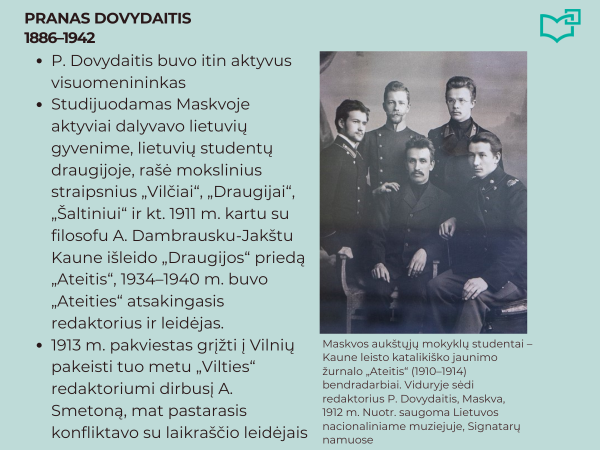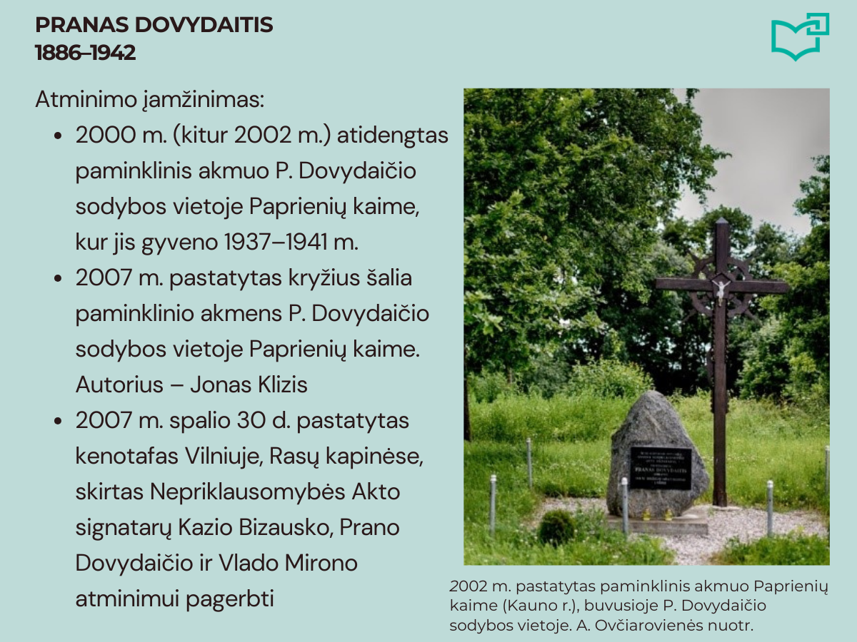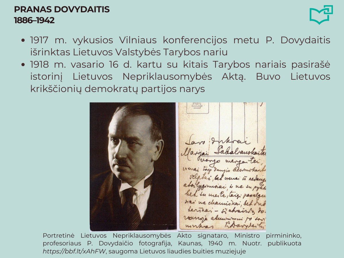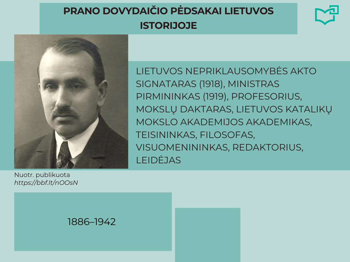 Lietuvos Nepriklausomybės Akto signatarui, Ministrui pirmininkui, teisininkui, filosofijos mokslų daktarui, profesoriui, Lietuvos ateitininkų sąjungos vadovui, enciklopedistui, apie 40 periodinių leidinių redaktoriui ir leidėjui Pranui Dovydaičiui skirta virtuali paroda – tai galimybė Jums pažinti šią išskirtinę Lietuvos istorijos asmenybę, kurios didžius darbus ir indėlį į mūsų šalies valstybingumo raidą nutraukė dramatiška mirtis. Paroda parengta P.Dovydaičio gimimo