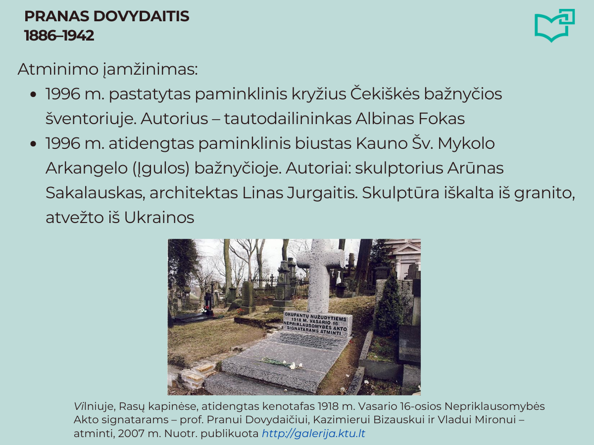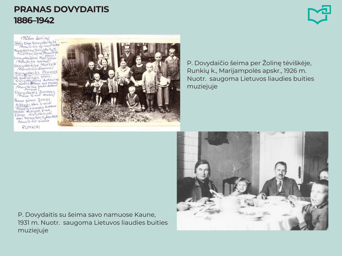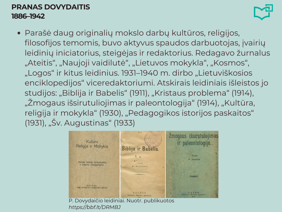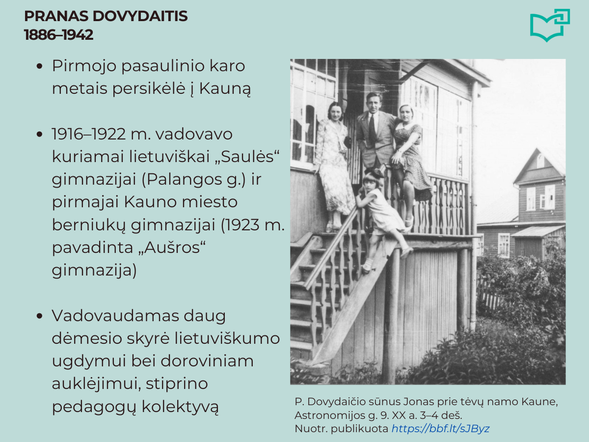 Lietuvos Nepriklausomybės Akto signatarui, Ministrui pirmininkui, teisininkui, filosofijos mokslų daktarui, profesoriui, Lietuvos ateitininkų sąjungos vadovui, enciklopedistui, apie 40 periodinių leidinių redaktoriui ir leidėjui Pranui Dovydaičiui skirta virtuali paroda – tai galimybė Jums pažinti šią išskirtinę Lietuvos istorijos asmenybę, kurios didžius darbus ir indėlį į mūsų šalies valstybingumo raidą nutraukė dramatiška mirtis. Paroda parengta P.Dovydaičio gimimo