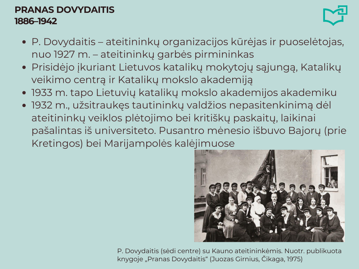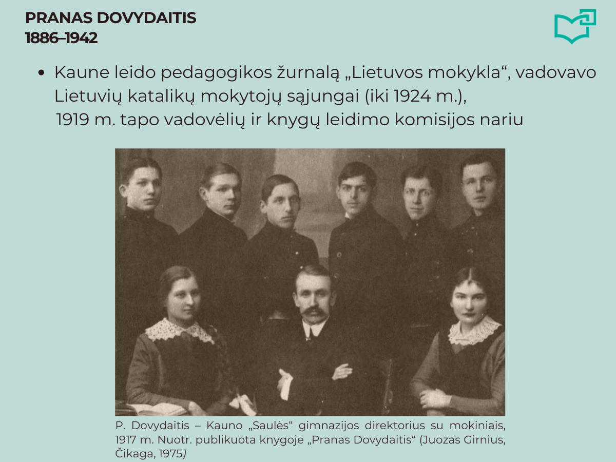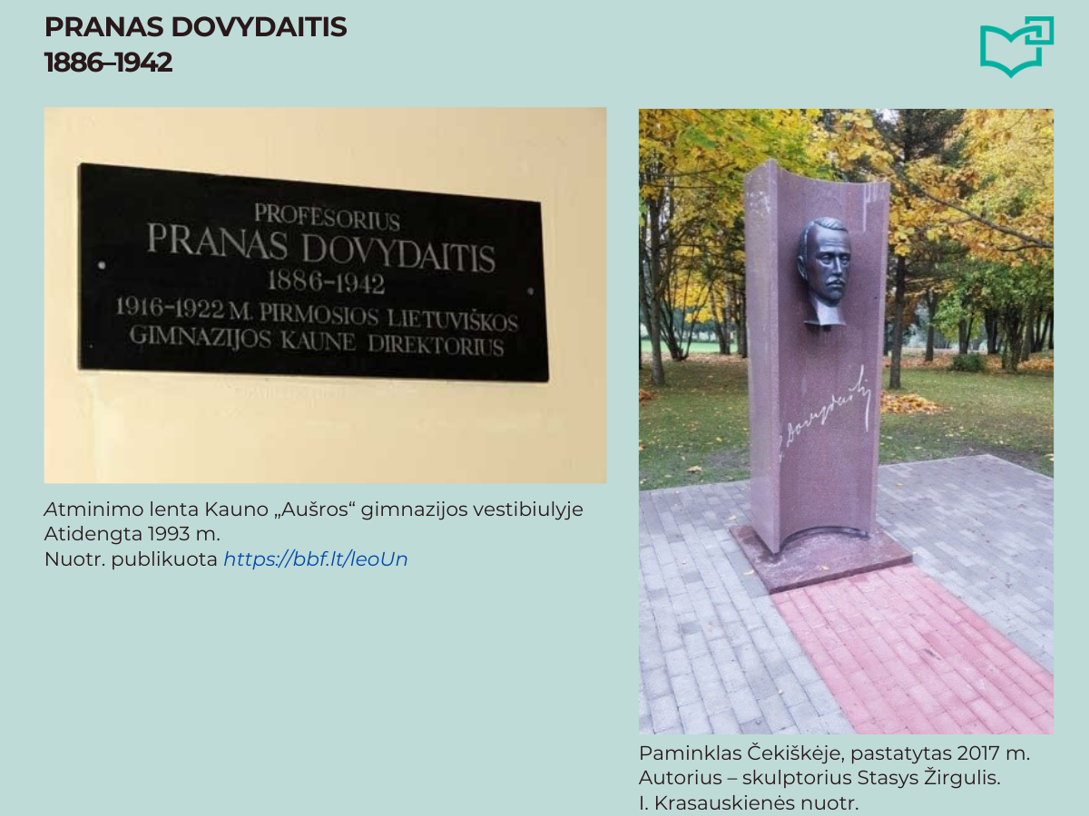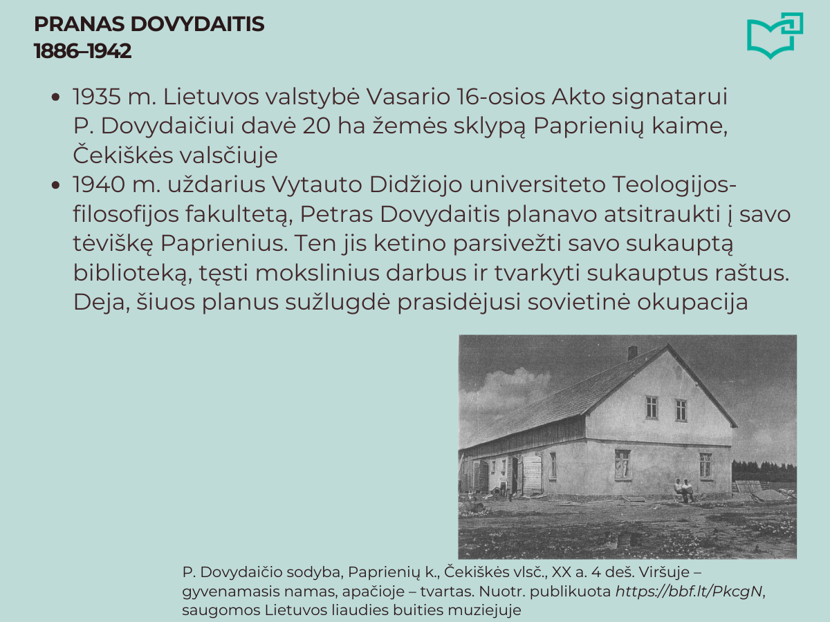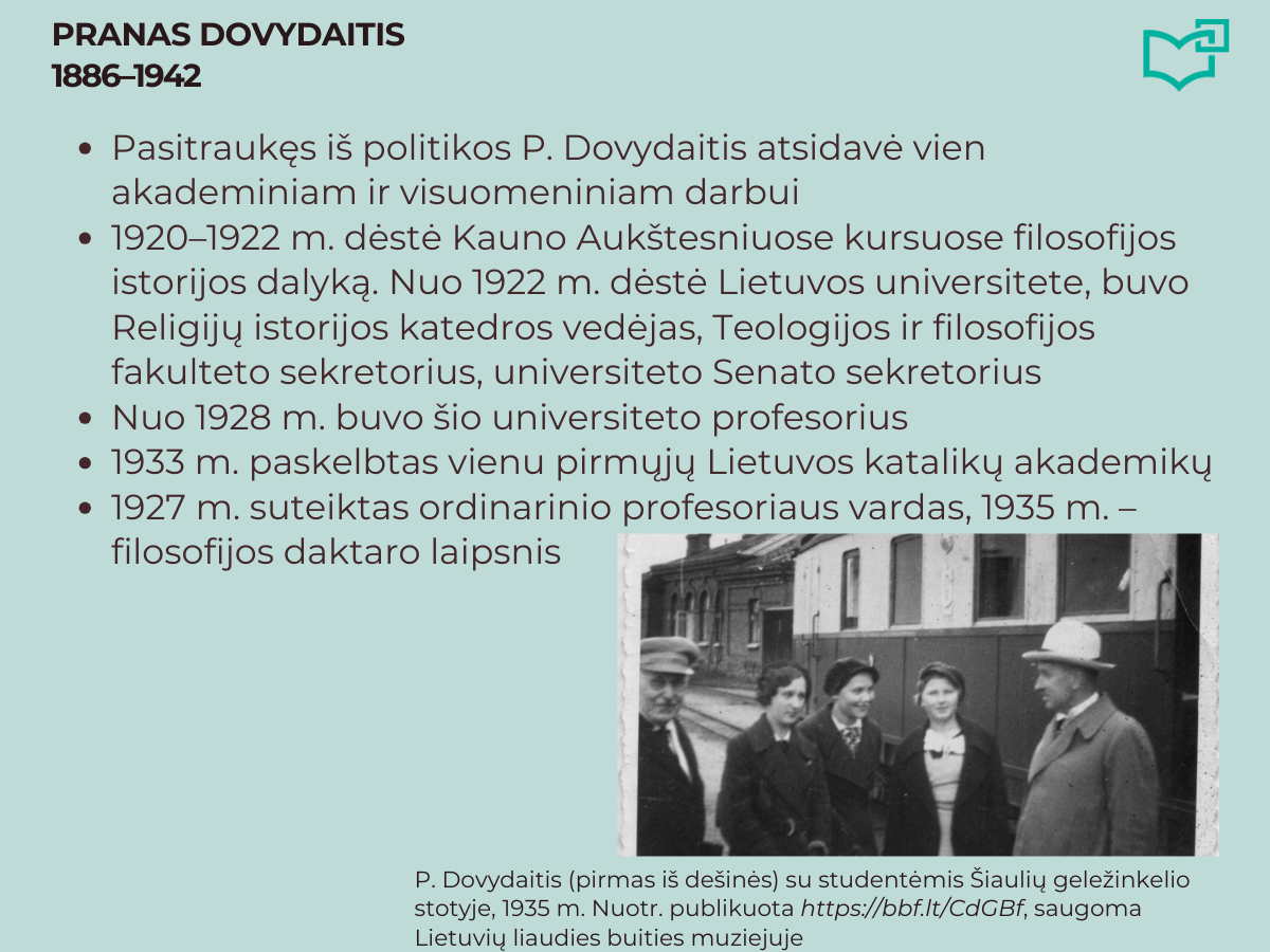 Lietuvos Nepriklausomybės Akto signatarui, Ministrui pirmininkui, teisininkui, filosofijos mokslų daktarui, profesoriui, Lietuvos ateitininkų sąjungos vadovui, enciklopedistui, apie 40 periodinių leidinių redaktoriui ir leidėjui Pranui Dovydaičiui skirta virtuali paroda – tai galimybė Jums pažinti šią išskirtinę Lietuvos istorijos asmenybę, kurios didžius darbus ir indėlį į mūsų šalies valstybingumo raidą nutraukė dramatiška mirtis. Paroda parengta P.Dovydaičio gimimo