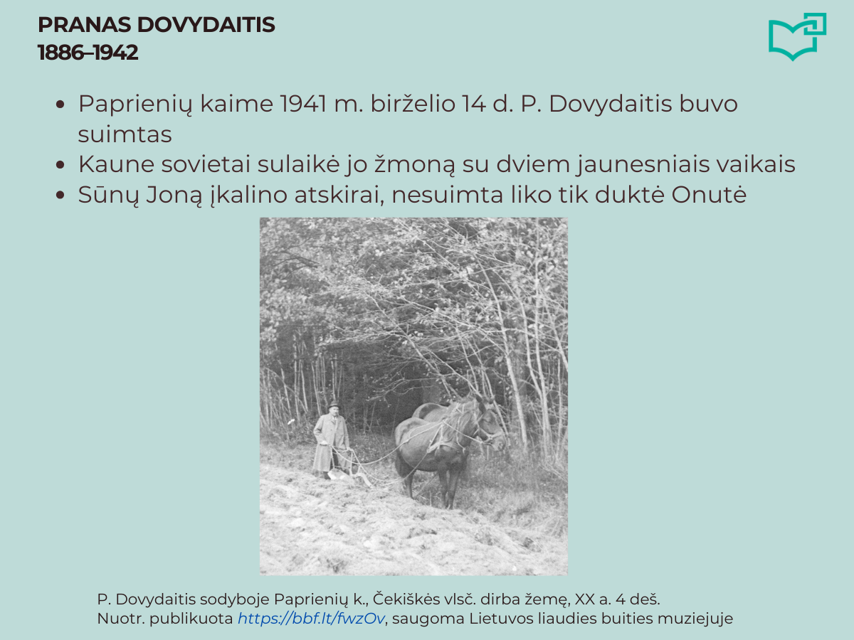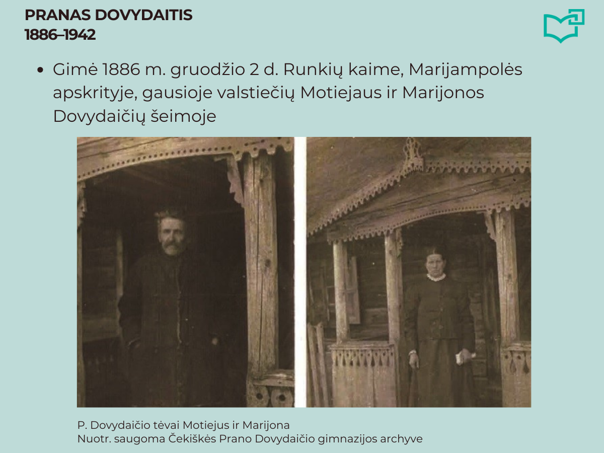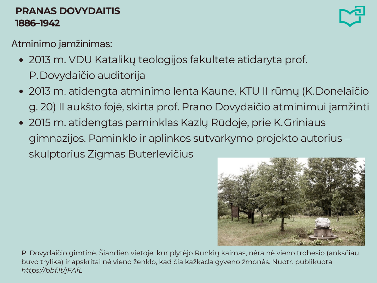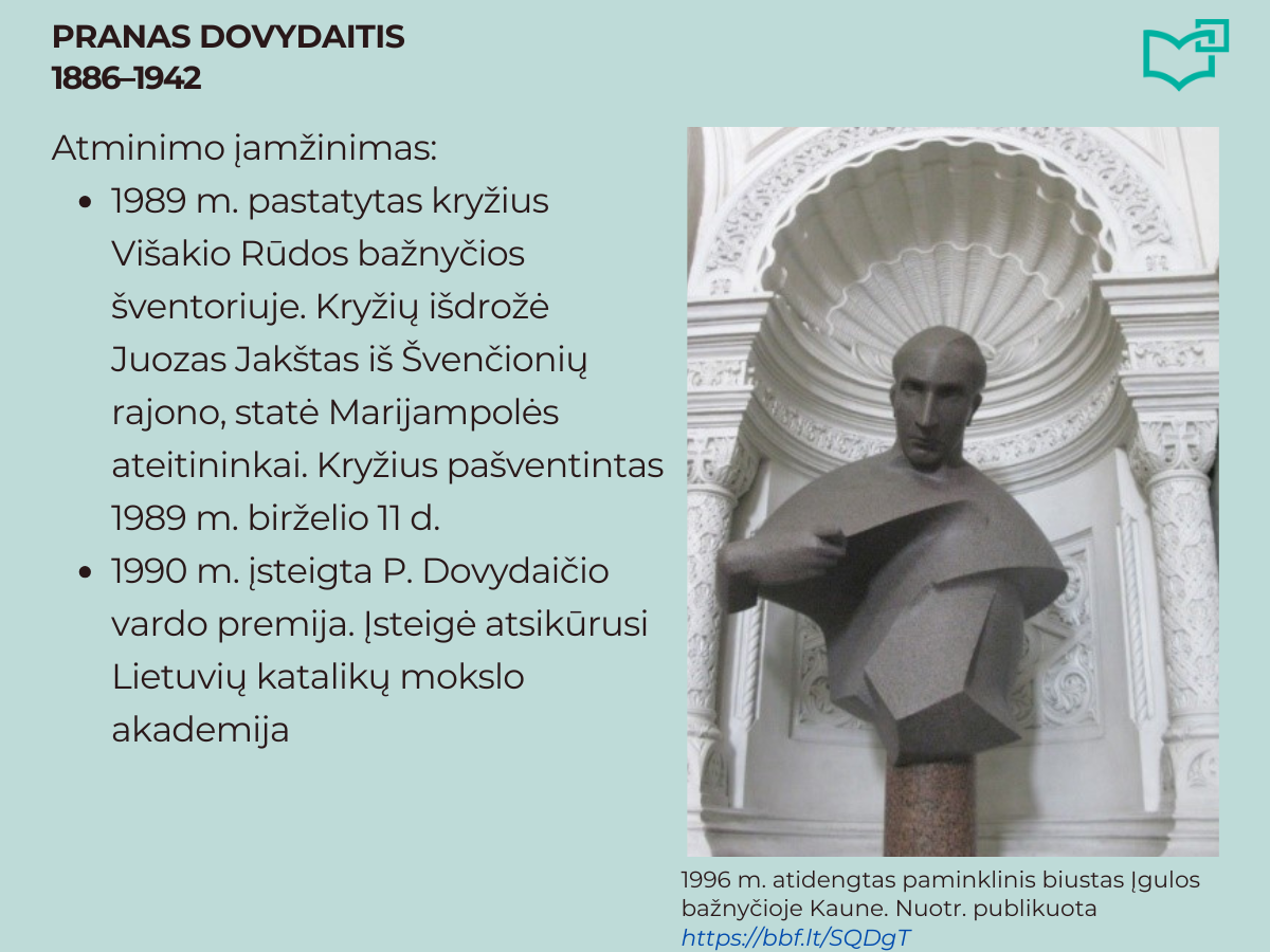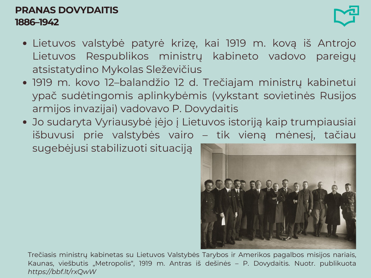 Lietuvos Nepriklausomybės Akto signatarui, Ministrui pirmininkui, teisininkui, filosofijos mokslų daktarui, profesoriui, Lietuvos ateitininkų sąjungos vadovui, enciklopedistui, apie 40 periodinių leidinių redaktoriui ir leidėjui Pranui Dovydaičiui skirta virtuali paroda – tai galimybė Jums pažinti šią išskirtinę Lietuvos istorijos asmenybę, kurios didžius darbus ir indėlį į mūsų šalies valstybingumo raidą nutraukė dramatiška mirtis. Paroda parengta P.Dovydaičio gimimo